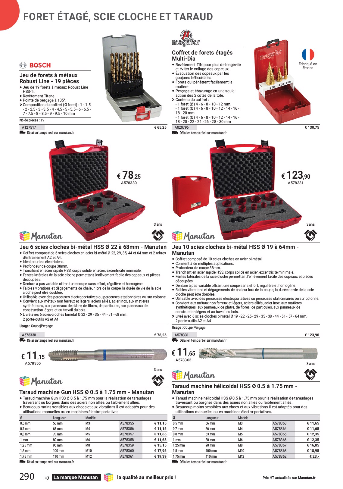 FORET ÉTAGÉ, SCIE CLOCHE ET TARAUD Jeu de forets à métaux Robust Line - 19 pièces • Jeu de 19 forêts à métaux Robust Line HSS-Ti. • Revêtement Titane. • Pointe de per 35°. O Composition du coffret (Ø foret) : 1 - 1.5 - 2 - 2.5 - 3 - 3.5 - 4 - 4.5 - 5 - 5.5 - 6 - 6.5 - 7 - 7.5 - 8 - 8.5 - 9 - 9.5 - 10 mm Nb de pièces : 19 A127517 Délai en temps réel sur manutan.fr € 65,25 Coffret de forets étagés Multi-Dia • Revêtement TIN pour plus de longévité et éviter le collage des copeaux. • Évacuation des copeaux par les goujures hélicoïdales. • Forets qui pénètrent facilement la matière. • Per vurage en une seule action des 2 côtés de la tôle. O Contenu du coffret : - 1 foret (Ø) 4 - 6 - 8 - 10 - 12 mm. - 1 foret (Ø) 4 - 6 - 8 - 10 - 12 - 14 - 16 - 18 - 20 mm - 1 foret (Ø) 4 - 6 - 8 - 10 - 12 - 14 - 16 - 18 - 20 - 22 - 24 - 26 - 28 - 30 mm A020796 Délai en temps réel sur manutan.fr € 78 ,25 A578330 Fabriqué en France € 130,75 € 123 ,90 A578331 3 ans 3 ans Jeu 6 scies cloches bi-métal HSS Ø 22 à 68mm - Manutan • Coffret composé de 6 scies cloches en acier bi-métal Ø 22, 29, 35, 44 et 64 mm et 2 arbres d'entrainement A2 et A4. • Idéal pour les électriciens. • Profondeur de coupe 38mm. • Tranchant en acier rapide HSS, corps solide en acier, excentricité minimale. • Fentes latérales de la scie cloche permettant l'enlèvement facile des copeaux et pièces découpées. • Denture à pas variable offrant une coupe sans effort, régulière et homogène. • Faibles vibrations et dégagements de chaleur lors de la coupe, la durée de vie de la scie cloche peut être doublée. • Utilisable avec des perceuses électroportatives ou perceuses stationnaires ou sur colonne. • Convient aux métaux non ferreux et légers, aciers alliés, acier inox, aux matières synthétiques, aux panneaux de plâtre, de fibres, de particules, aux panneaux de construction légers et au travail du bois. O Livré avec 6 scies-cloches bimétal Ø 22 - 29 - 35 - 44 - 51 - 68 mm. 2 porte-outils A2 et A4 Usage : Coupe|Per A578330 Délai en temps réel sur manutan.fr € 78,25 Jeu 10 scies cloches bi-métal HSS Ø 19 à 64mm - Manutan • Coffret composé de 10 scies cloches en acier bi-métal. • Convient à de multiples applications. • Profondeur de coupe 38mm. • Tranchant en acier rapide HSS, corps solide en acier, excentricité minimale. • Fentes latérales de la scie cloche permettant l'enlèvement facile des copeaux et pièces découpées. • Denture à pas variable offrant une coupe sans effort, régulière et homogène. • Faibles vibrations et dégagements de chaleur lors de la coupe, la durée de vie de la scie cloche peut être doublée. • Utilisable avec des perceuses électroportatives ou perceuses stationnaires ou sur colonne. • Convient aux métaux non ferreux et légers, aciers alliés, acier inox, aux matières synthétiques, aux panneaux de plâtre, de fibres, de particules, aux panneaux de construction légers et au travail du bois. O Livré avec 6 scies-cloches bimétal Ø 19 - 22 - 25 - 29 - 35 - 38 - 44 - 51 - 57 - 64 mm. 2 porte-outils A2 et A4 Usage : Coupe|Per A578331 Délai en temps réel sur manutan.fr € 123,90 € 11 ,15 A578355 € 11 ,65 A578363 3 ans 3 ans Taraud machine Gun HSS Ø 0.5 à 1.75 mm - Manutan • Taraud machine Gun HSS Ø 0.5 à 1.75 mm pour la réalisation de taraudages traversant ou borgnes dans des aciers non alliés ou faiblement alliés. • Beaucoup moins sensibles aux chocs et aux vibrations il est adaptés pour des utilisations manuelles ou en machines électro-portatives. Ø Longueur Modèle 0,5 mm 56 mm M3 A578355 € 11,15 0,7 mm 63 mm M4 A578356 € 11,15 0,8 mm 70 mm M5 A578357 € 11,65 1 mm 80 mm M6 A578358 € 11,65 1,25 mm 90 mm M8 A578359 € 15,15 1,5 mm 100 mm M10 A578360 € 17,95 1,75 mm 110 mm M12 A578361 € 19,39 Délai en temps réel sur manutan.fr Taraud machine hélicoidal HSS Ø 0.5 à 1.75 mm - Manutan • Taraud machine hélicoidal HSS Ø 0.5 à 1.75 mm pour la réalisation de taraudages traversant ou borgnes dans des aciers non alliés ou faiblement alliés. • Beaucoup moins sensibles aux chocs et aux vibrations il est adaptés pour des utilisations manuelles ou en machines électro-portatives. Ø Longueur Modèle 0,5 mm 56 mm M3 A578363 € 11,65 0,7 mm 56 mm M4 A578364 € 11,65 0,8 mm 63 mm M5 A578365 € 12,35 1 mm 80 mm M6 A578366 € 12,35 1,25 mm 90 mm M8 A578367 € 16,05 1,5 mm 100 mm M10 A578368 € 18,95 1,75 mm 110 mm M12 A578362 € 23,- Délai en temps réel sur manutan.fr 290