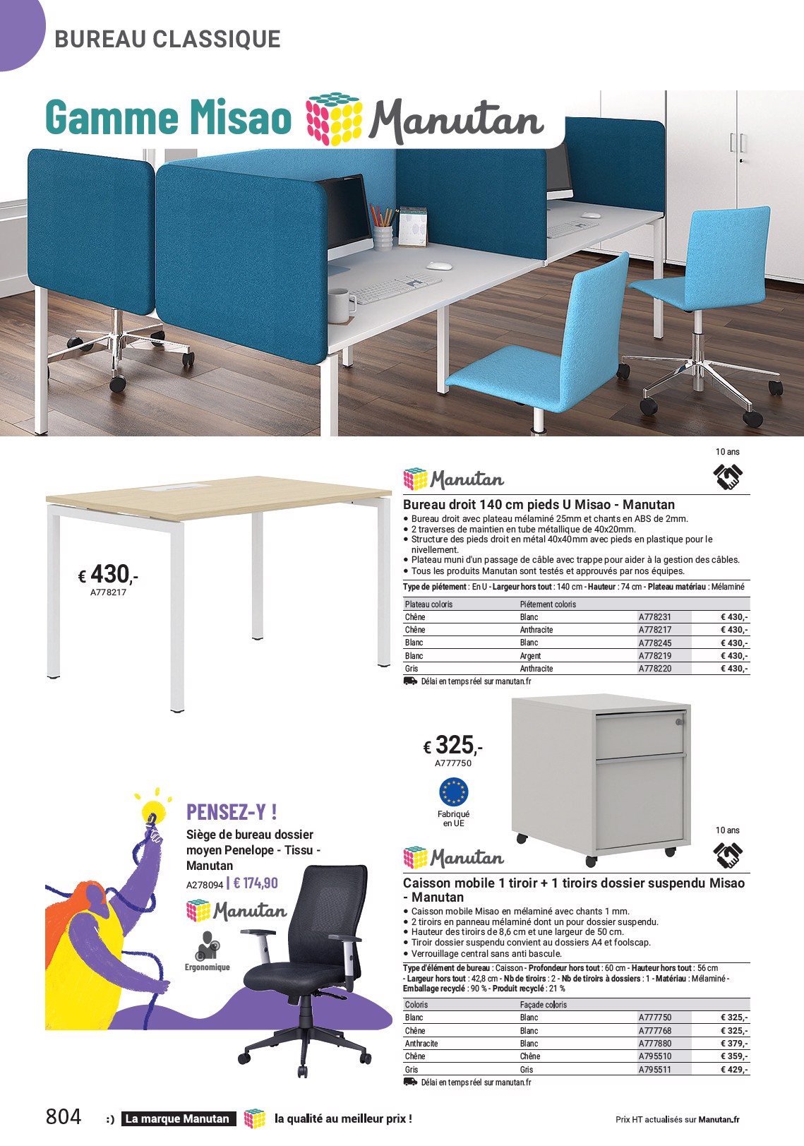 BUREAU CLASSIQUE Gamme Misao € 430 ,- A778217 PENSEZ-Y ! Siège de bureau dossier moyen Penelope - Tissu - Manutan A278094 | € 174,90 Ergonomique 804 10 ans Bureau droit 140 cm pieds U Misao - Manutan • Bureau droit avec plateau mélaminé 25mm et chants en ABS de 2mm. • 2 traverses de maintien en tube métallique de 40x20mm. • Structure des pieds droit en métal 40x40mm avec pieds en plastique pour le nivellement. • Plateau muni d'un passage de câble avec trappe pour aider à la gestion des câbles. • Tous les produits Manutan sont testés et approuvés par nos équipes. Type de piétement : En U - Largeur hors tout : 140 cm - Hauteur : 74 cm - Plateau matériau : Mélaminé Plateau coloris Piétement coloris Chêne Blanc Chêne Anthracite Blanc Blanc Blanc Argent Gris Anthracite Délai en temps réel sur manutan.fr A778231 A778217 A778245 A778219 A778220 € 430,- € 430,- € 430,- € 430,- € 430,- € 325 ,- A777750 Fabriqué en UE 10 ans Caisson mobile 1 tiroir + 1 tiroirs dossier suspendu Misao - Manutan • Caisson mobile Misao en mélaminé avec chants 1 mm. • 2 tiroirs en panneau mélaminé dont un pour dossier suspendu. • Hauteur des tiroirs de 8,6 cm et une largeur de 50 cm. • Tiroir dossier suspendu convient au dossiers A4 et foolscap. • Verrouillage central sans anti bascule. Type d'élément de bureau : Caisson - Profondeur hors tout : 60 cm - Hauteur hors tout : 56 cm - Largeur hors tout : 42,8 cm - Nb de tiroirs : 2 - Nb de tiroirs à dossiers : 1 - Matériau : Mélaminé - Emballage recyclé : 90 % - Produit recyclé : 21 % Coloris F Blanc Blanc Chêne Blanc Anthracite Blanc Chêne Chêne Gris Gris Délai en temps réel sur manutan.fr A777750 A777768 A777880 A795510 A795511 € 325,- € 325,- € 379,- € 359,- € 429,-