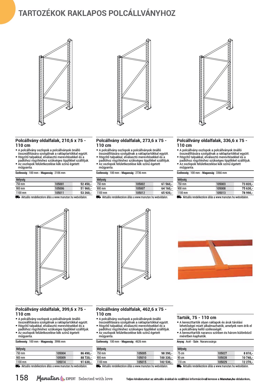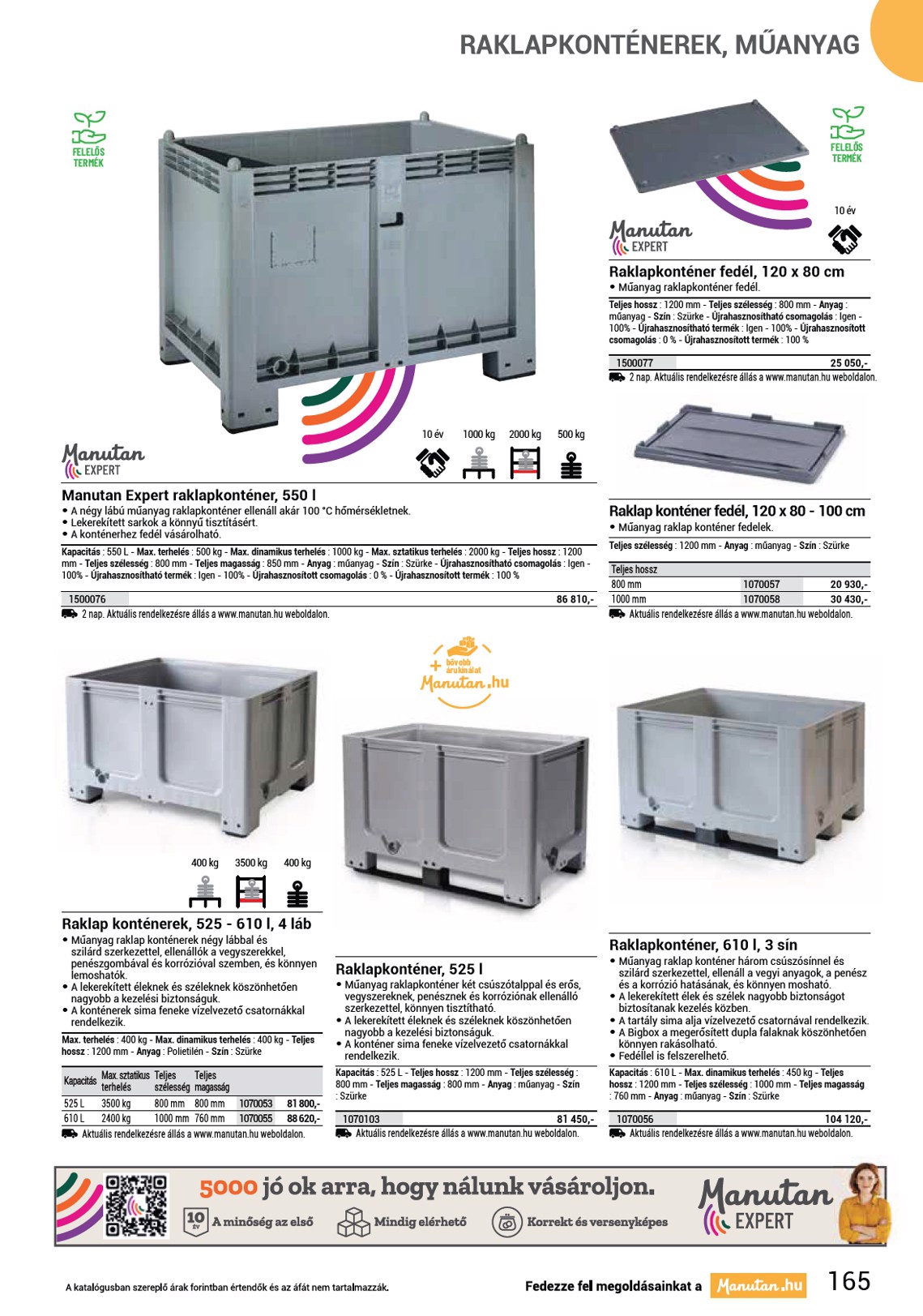 MŰANYAG RAKLAPOK FELELŐS TERMÉK FELELŐS TERMÉK 10 év igen 300 kg 600 kg 10 év 350 kg 700 kg Manutan Expert műanyag raklap, 11,5 x 60 x 40 cm • Nagynyomású tisztítóval és fertőtlenítő szerekkel tisztítható, könnyen rakásolható műanyag raklap. • A raklap teljes mértékben újrahasznosítható. Anyag : műanyag - Hossz : 600 mm - Szélesség : 400 mm - Magasság : 115 mm - Max. sztatikus terhelés : 600 kg - Max. dinamikus terhelés : 300 kg - Élelmiszeripari felhasználásra : igen - Súly : 1,75 kg - Szín : Fekete - Min. üzemhőmérséklet : -20 °C - Max. üzemhőmérséklet : 60 °C - Újrahasznosítható termék : Igen - 100% - Újrahasznosított csomagolás : 0 % - Újrahasznosított termék : 100 % Mennyiségi kedvezmény - 1 - 9 1500072 5 160,- 2 nap. Aktuális rendelkezésre állás a www.manutan.hu weboldalon. - 5% 10 - 49 4 880,- - 10% 50 + 4 640,- Manutan Expert műanyag raklap, 13 x 80 x 60 cm • A műanyag, környezetkímélő raklap megfelel a szigorított fitoszaniter előírásoknak, és nincs szükség a lekezelésére és fertőtlenítésére a kiszállítás előtt. • A nagysűrűségű polietilén ellenálló a környezeti hatásokkal, nedvességgel és gombákkal szemben. • A sérült raklapok újrahasznosíthatók. Anyag : műanyag - Hossz : 800 mm - Szélesség : 600 mm - Magasság : 130 mm - Max. sztatikus terhelés : 700 kg - Max. dinamikus terhelés : 350 kg - Súly : 2,8 kg - Szín : Fekete - Újrahasznosítható termék : Igen - 100% - Újrahasznosított csomagolás : 0 % - Újrahasznosított termék : 100 % Mennyiségi kedvezmény - - 5% - 10% 1 - 9 10 - 49 50 + 1652120 5 500,- 2 nap. Aktuális rendelkezésre állás a www.manutan.hu weboldalon. 5 220,- 4 940,- FELELŐS TERMÉK FELELŐS TERMÉK 10 év 1000 kg 2000 kg Manutan Expert műanyag raklap, 16 x 120 x 100 cm • A műanyag, környezetkímélő raklap megfelel a szigorított fitoszaniter előírásoknak, és nincs szükség a lekezelésére és fertőtlenítésére a kiszállítás előtt. • A nagysűrűségű polietilén ellenálló a környezeti hatásokkal, nedvességgel és gombákkal szemben. • A sérült raklapok újrahasznosíthatók. Anyag : műanyag - Hossz : 1200 mm - Szélesség : 1000 mm - Magasság : 160 mm - Max. sztatikus terhelés : 2000 kg - Max. dinamikus terhelés : 1000 kg - Súly : 6,7 kg - Szín : Fekete - Újrahasznosítható termék : Igen - 100% - Újrahasznosított csomagolás : 0 % - Újrahasznosított termék : 100 % Mennyiségi kedvezmény - - 5% - 10% 1 - 9 10 - 49 50 + 1652122 10 230,- 9 710,- 9 190,- 2 nap. Aktuális rendelkezésre állás a www.manutan.hu weboldalon. 10 év Manutan Expert talp, 120 cm • Nagysűrűségű újrahasznosított polietilénből készült műanyag talp. • A talp a 120 x 80 cm és a 120 x 100 cm méretű raklaphoz rögzíthető. • Egy darabos csomagolásban szállítjuk. Anyag : műanyag - Hossz : 1200 mm - Súly : 0,7 kg - Szín : Fekete - Újrahasznosítható termék : Igen - 100% - Újrahasznosított csomagolás : 0 % - Újrahasznosított termék : 100 % Mennyiségi kedvezmény - 1 - 9 1652123 2 750,- Aktuális rendelkezésre állás a www.manutan.hu weboldalon. - 6% 10 - 49 2 580,- - 11% 50 + 2 450,- 162