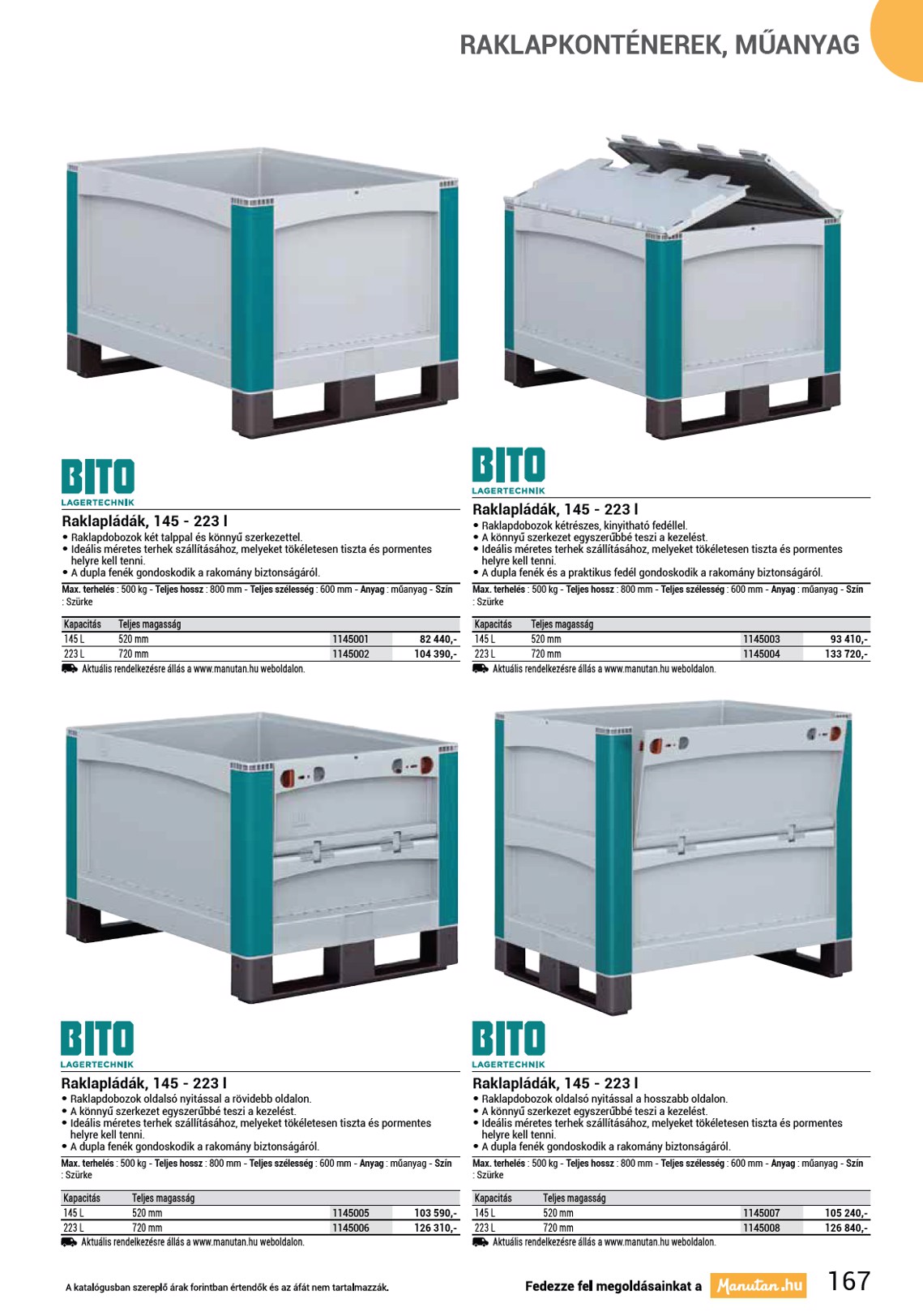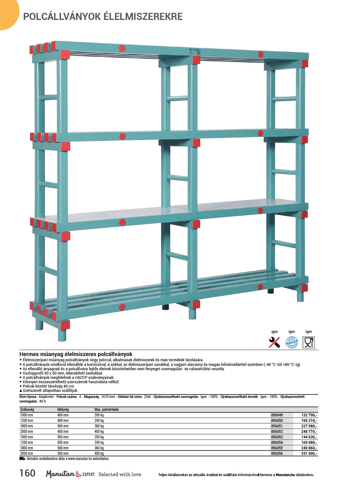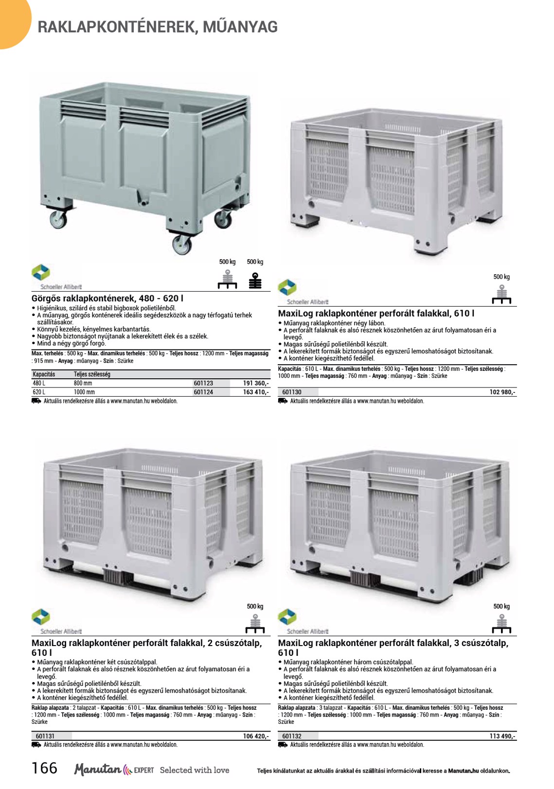 MŰANYAG RAKLAPOK bővebb árukínálat 1500 kg 5000 kg Műanyag raklap, 16 x 120 x 80 cm • A lyukas fenékkel rendelkező műanyag raklap könnyen tisztítható, éghajlati változásokkal, nedvességgel és penészgombákkal szemben ellenálló műanyagból készült. • A raklap sokoldalúan hasznosítható, és alkalmas polcállványokba is. Anyag : műanyag - Hossz : 1200 mm - Szélesség : 800 mm - Magasság : 160 mm - Max. sztatikus terhelés : 5000 kg - Max. dinamikus terhelés : 1000 kg - Súly : 18 kg - Szín : Fekete Mennyiségi kedvezmény - 1 - 9 1070050 30 320,- Aktuális rendelkezésre állás a www.manutan.hu weboldalon. - 5% 10 - 49 28 790,- - 10% 50 + 27 280,- Műanyag raklap, 15 x 120 x 80 cm • Higiénikus raklap alacsony sűrűségű polietilénből, ellenáll a savakkal és lúgokkal szemben. • Csúszásgátló felület. Anyag : műanyag - Hossz : 1200 mm - Szélesség : 800 mm - Magasság : 150 mm - Max. sztatikus terhelés : 5000 kg - Max. dinamikus terhelés : 1500 kg - Súly : 18 kg - Szín : Fekete - Min. üzemhőmérséklet : -30 °C - Max. üzemhőmérséklet : 70 °C - Újrahasznosítható csomagolás : Igen - 100% - Újrahasznosítható termék : Igen - 100% - Újrahasznosított csomagolás : 100 % - Újrahasznosított termék : 100 % Mennyiségi kedvezmény - 1 - 9 1175003 38 720,- 2 nap. Aktuális rendelkezésre állás a www.manutan.hu weboldalon. - 5% 10 - 49 36 780,- - 10% 50 + 34 830,- 1500 kg 4000 kg Műanyag raklap, 15 x 120 x 80 cm • Műanyag, környezetre ártalmatlan raklap sokoldalú hasznosíthatósággal. • Könnyen tisztítható, éghajlati változásokkal, nedvességgel és penészgombákkal szemben ellenálló anyagból készült. • A sérült raklapok újrahasznosíthatók. Anyag : műanyag - Hossz : 1200 mm - Szélesség : 800 mm - Magasság : 150 mm - Max. sztatikus terhelés : 4000 kg - Max. dinamikus terhelés : 1500 kg - Raklapállvány kapacitása : 500 kg - Súly : 11,5 kg - Szín : Fekete Mennyiségi kedvezmény - 1 - 9 894010 24 460,- 2 nap. Aktuális rendelkezésre állás a www.manutan.hu weboldalon. - 5% 10 - 49 23 210,- - 10% 50 + 21 990,- Műanyag raklap, 16 x 120 x 80 cm • A könnyen tisztítható felületű könnyített egészségügyi raklap kiválóan alkalmas az élelmiszerekkel történő érintkezésre. • A sérült raklapok újrahasznosíthatók. Anyag : műanyag - Hossz : 1200 mm - Szélesség : 800 mm - Magasság : 160 mm - Max. sztatikus terhelés : 5000 kg - Max. dinamikus terhelés : 1250 kg - Súly : 18 kg - Szín : Szürke Mennyiségi kedvezmény - 1 - 9 894013 40 810,- 2 nap. Aktuális rendelkezésre állás a www.manutan.hu weboldalon. - 5% 10 - 49 38 770,- - 10% 50 + 36 730,- 163