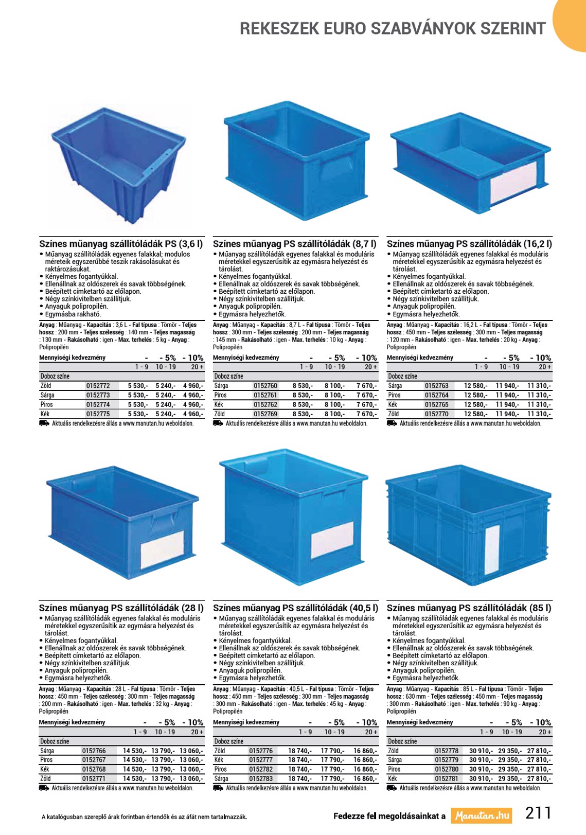 REKESZEK EURO SZABVÁNYOK SZERINT Kapacitás Teljes hossz Teljes szélesség 10 L 400 mm 300 mm 15 L 400 mm 300 mm 20 L 400 mm 300 mm 26 L 400 mm 300 mm 30 L 400 mm 300 mm 15 L 600 mm 400 mm 24 L 600 mm 400 mm 35 L 600 mm 400 mm 45 L 600 mm 400 mm 56 L 600 mm 400 mm 66 L 600 mm 400 mm 88 L 600 mm 400 mm 45 L 800 mm 600 mm 87 L 800 mm 600 mm 130 L 800 mm 600 mm 172 L 800 mm 600 mm Aktuális rendelkezésre állás a www.manutan.hu weboldalon. Teljes magasság 120 mm 170 mm 220 mm 270 mm 320 mm 75 mm 120 mm 170 mm 220 mm 270 mm 320 mm 420 mm 120 mm 220 mm 320 mm 420 mm Antisztatikus szállítóládák • Antisztatikus szállítóládák az elektrotechnikai ipar számára, melyek moduláris méretekkel egyszerűsítik az egymásra helyezést. • Robusztus szilárd szerkezettel rendelkeznek. • Anyaguk polipropilén. Anyag : Műanyag - Doboz színe : Fekete Max. terhelés 15 kg 15 kg 15 kg 15 kg 15 kg 20 kg 20 kg 20 kg 20 kg 20 kg 20 kg 20 kg 25 kg 25 kg 25 kg 25 kg 1070104 1070105 1070106 1070107 1070108 1070109 1070110 1070111 1070112 1070113 1070114 1070115 1070116 1070117 1070118 1070119 3 990,- 4 370,- 4 950,- 5 540,- 6 530,- 4 630,- 5 420,- 6 420,- 7 540,- 8 470,- 9 050,- 11 940,- 13 760,- 17 770,- 20 700,- 24 810,- Mennyiségi kedvezmény Kapacitás Teljes hossz Teljes szélesség 5 L 300 mm 200 mm 10 L 400 mm 300 mm 15 L 400 mm 300 mm 20 L 400 mm 300 mm 20 L 600 mm 400 mm 30 L 600 mm 400 mm 40 L 600 mm 400 mm 50 L 600 mm 400 mm 60 L 600 mm 400 mm 80 L 600 mm 400 mm 90 L 800 mm 600 mm 132 L 800 mm 600 mm 2 nap. Aktuális rendelkezésre állás a www.manutan.hu weboldalon. 210 Műanyag szállítóládák PP Silverline • Műanyag egymásra helyezhető szállítóládák, melyek szállítószalagok és görgős szállítókhoz való alkalmazásra is megfelelők. • Beépített címketartóval és kényelmes fogantyúval vannak ellátva. • Anyaguk polipropilén. • Fedelek hozzávásárolhatók. Anyag : Műanyag - Max. terhelés : 20 kg - Max. sztatikus terhelés : 200 kg - Doboz színe : Szürke Teljes magasság 120 mm 120 mm 180 mm 220 mm 120 mm 180 mm 220 mm 270 mm 320 mm 420 mm 220 mm 320 mm 894022 894023 894024 894025 894026 894027 894028 894029 894030 894031 894032 894033 - 1 - 9 2 570,- 3 900,- 4 580,- 5 410,- 6 070,- 7 010,- 7 730,- 8 560,- 9 710,- 11 800,- 16 060,- 20 090,- - 5% 10 - 19 2 430,- 3 700,- 4 350,- 5 130,- 5 740,- 6 640,- 7 340,- 8 120,- 9 220,- 11 210,- 15 240,- 19 070,- - 11% 20 + 2 290,- 3 500,- 4 120,- 4 850,- 5 440,- 6 290,- 6 950,- 7 700,- 8 740,- 10 620,- 14 450,- 18 080,-