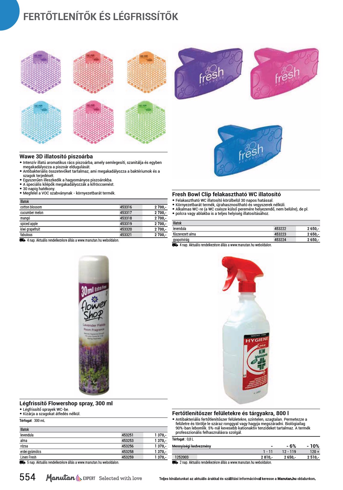 FERTŐTLENÍTŐK ÉS LÉGFRISSÍTŐK Wawe 3D illatosító piszoárba • Intenzív illatú aromatikus rács piszoárba, amely semlegesíti, szanitálja és egyben megakadályozza a piszoár eldugulását. • Antibakteriális összetevőket tartalmaz, ami megakadályozza a baktériumok és a szagok terjedését. • Egyszerűen illeszkedik a hagyományos piszoárokba. • A speciális kilépők megakadályozzák a kifröccsenést. • 30 napig hatékony. • Megfelel a VOC szabványnak - környezetbarát termék. Illatok cotton blossom 453316 cucumber melon 453317 mangó 453318 spiced apple 453319 kiwi grapefruit 453320 fabulous 453321 4 nap. Aktuális rendelkezésre állás a www.manutan.hu weboldalon. 2 700,- 2 700,- 2 700,- 2 700,- 2 700,- 2 700,- Fresh Bowl Clip felakasztható WC illatosító • Felakasztható WC illatosító körülbelül 30 napos hatással. • Környezetbarát termék, újrahasznosítható és vegyszerek nélküli. • Alkalmas WC-re (a WC csésze külső peremére helyezendő, nem belülre), de pl. • polcra vagy ablakba is a teljes helyiség illatosításához. Illatok levendula fűszerezett alma gyapotvirág 4 nap. Aktuális rendelkezésre állás a www.manutan.hu weboldalon. 453222 453223 453224 2 650,- 2 650,- 2 650,- Légfrissítő Flowershop spray, 300 ml • Légfrissítő sprayek WC-be. • Kizárja a szagokat átfedés nélkül. Térfogat : 300 mL Illatok levendula alma rózsa erdei gyümölcs Linen Fresh 5 nap. Aktuális rendelkezésre állás a www.manutan.hu weboldalon. 453251 453253 453256 453258 453259 554 1 370,- 1 370,- 1 370,- 1 370,- 1 370,- Fertőtlenítőszer felületekre és tárgyakra, 800 l • Antibakteriális fertőtlenítőszer felületekre, színtelen, szagtalan. Permetezze a felületre és törölje le száraz ronggyal vagy hagyja megszáradni. Biológiailag 90%-ban lebomlik. 5%-nál kevesebb kationaktív tenzideket tartalmaz. A termék professzionális felhasználásra szolgál. Térfogat : 0,8 L Mennyiségi kedvezmény - 1 - 11 1252003 2 810,- 2 nap. Aktuális rendelkezésre állás a www.manutan.hu weboldalon. - 6% 12 - 119 2 650,- - 10% 120 + 2 510,-