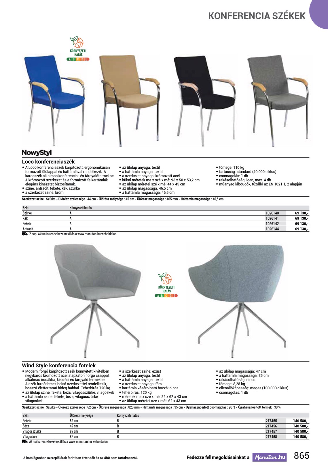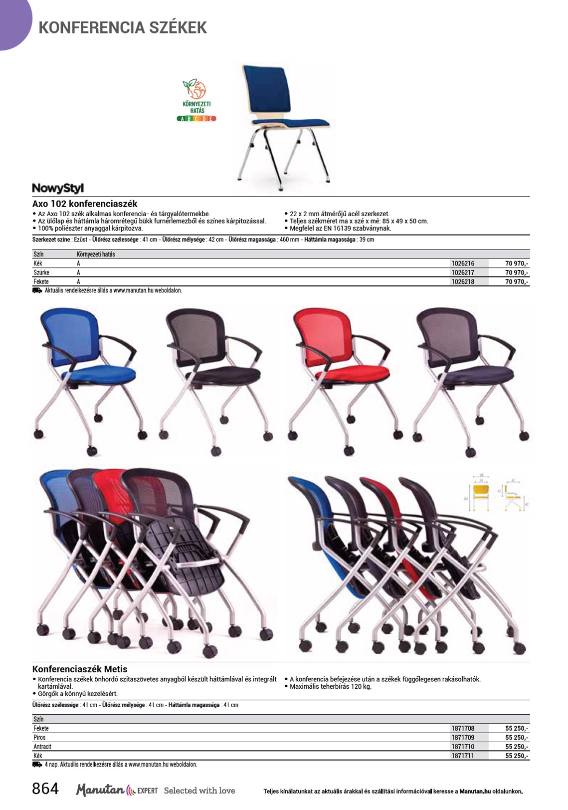 FOTELEK ÉS ÜLŐGARNITÚRÁK Sawana fotel • Kárpitozott konferencia fotelek merevített ülőlappal, háttámlával és krómozott szerkezettel. A kartámlák fekete műbőr bevonatúak. • anyaga: textil • lábazat anyaga: króm • színe: kék, fekete Ülés típusa : Szék - Helyek száma : 1 - Teljes szélesség : 400 mm - Teljes mélység : 720 mm - Teljes magasság : 820 mm Szín Környezeti hatás Kék C Fekete C Aktuális rendelkezésre állás a www.manutan.hu weboldalon. • láb színe: ezüst • kopásállóság: 40 000 ciklus • összeszerelt állapotban szállítjuk 239945 239946 91 980,- 91 980,- Sawana II fotelek • Kárpitozott dupla konferencia fotel merevített ülőlappal, háttámlával és krómozott szerkezettel. A kartámlák fekete műbőr bevonatúak. • anyaga: textil • lábazat anyaga: króm • színe: kék, fekete Ülés típusa : Szék - Helyek száma : 2 - Teljes szélesség : 640 mm - Teljes mélység : 720 mm - Teljes magasság : 820 mm Szín Környezeti hatás Kék C Fekete C Aktuális rendelkezésre állás a www.manutan.hu weboldalon. 866 • láb színe: ezüst • kopásállóság: 40 000 ciklus • összeszerelt állapotban szállítjuk 239947 239948 155 690,- 155 690,-