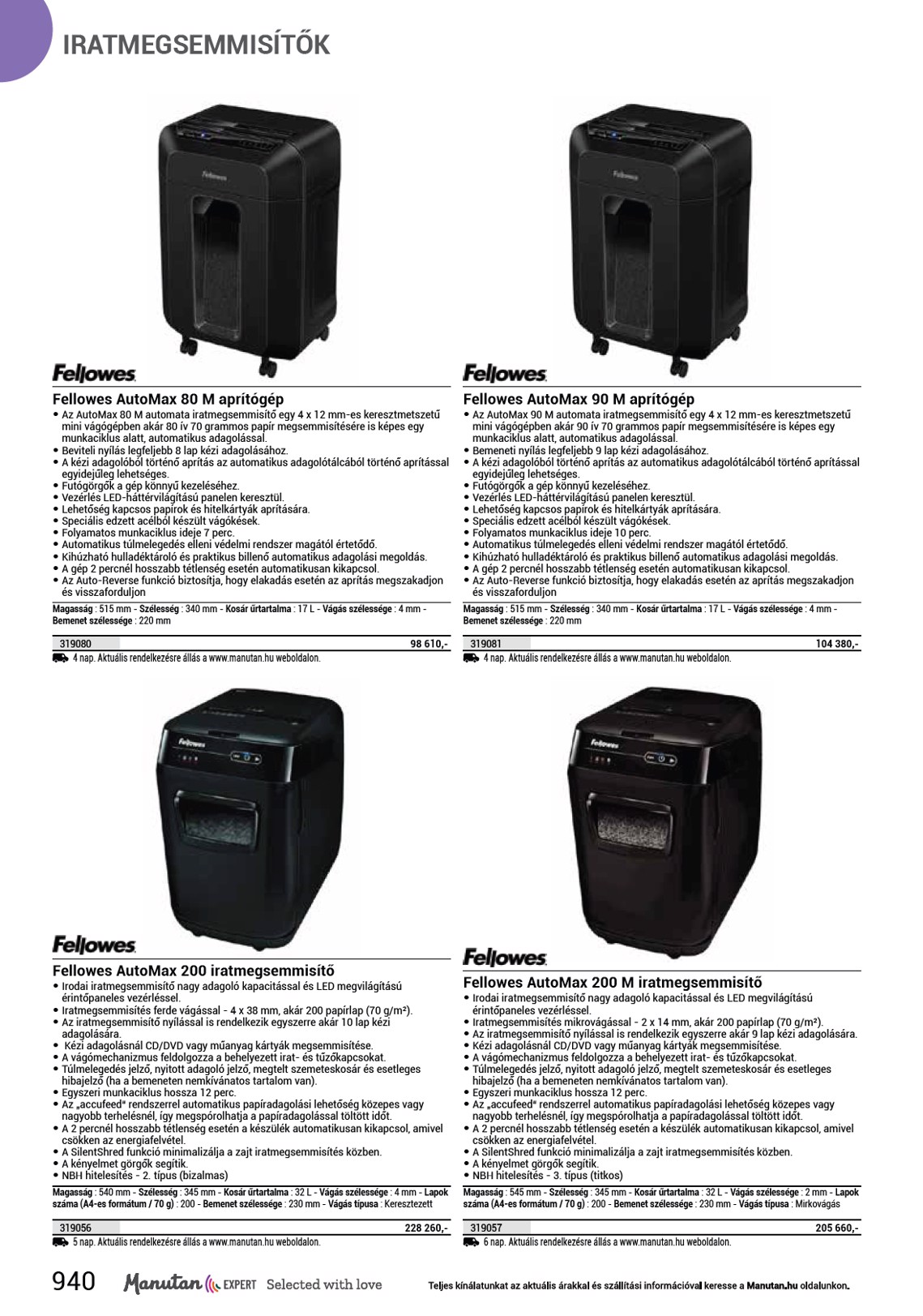 IRATMEGSEMMISÍTŐK Szemeteszsák iratmegsemmisítő gépekhez • Cserélhető zsákok HDPE regranulátumból az iratmegsemmisítő gépek hulladéktartályába háromféle színben - zöld, kék és fekete. • 5 - 25 db-os csomagolásban szállítjuk. Kapacitás Vastagság 154,8 L 20 µm 359,9 L 30 µm 450 L 80 µm 4 nap. Aktuális rendelkezésre állás a www.manutan.hu weboldalon. 686208 686209 686210 10 000,- 6 090,- 7 360,- Olaj iratmegsemmisítőkbe • Olaj az iratmegsemmisítőbe, amely megakadályozza az üledék képződést és a vágó hengerek és tisztító lamellák szennyeződését. Kapacitás : 0,35 L 891077 2 nap. Aktuális rendelkezésre állás a www.manutan.hu weboldalon. 8 370,- Kobra +1 SS6 iratmegsemmisítő • Iratmegsemmisítő gép kisebb irodákba és hivatalokba. 5,8 mm hosszanti vágással történő iratmegsemmisítés, akár 23-25 darab 70 g/m² papírlap és 20-22 darab 80 g/m² papírlap. Megbirkózik a CD-k és DVD-k megsemmisítésével is. Automatikus indítás és kikapcsolás a szemetes zsák megtöltésekor vagy az ajtó kinyitásakor. Nagy teljesítményű motor akár folyamatos 24 órás munkához és a motor túlmelegedése ellen védő hűtőrendszer. Az automatikus hátramenet megakadályozza a gép elhalmozását nagyobb mennyiségű papír behelyezésekor, mint a megadott kapacitás. Műanyag betekintő nyílás a tartályon a megtöltődés ellenőrzésére. Az iratmegsemmisítő energiafelvétele 250 W. Magasság : 590 mm - Szélesség : 390 mm - Kosár űrtartalma : 38,5 L - Vágás szélessége : 5,8 mm - Lapok száma (A4-es formátum / 80 g) : 22 - Lapok száma (A4-es formátum / 70 g) : 25 - Bemenet szélessége : 230 mm - Biztosítási szint : P-2 - Vágás típusa : Jobb Kobra +1 SS7 iratmegsemmisítő • Iratmegsemmisítő gép kisebb irodákba és hivatalokba. 7,5 mm hosszanti vágással történő iratmegsemmisítés, akár 25-27 darab 70 g/m² papírlap és 22-24 darab 80 g/m² papírlap. Megbirkózik a CD-k és DVD-k megsemmisítésével is. Automatikus indítás és kikapcsolás a szemetes zsák megtöltésekor vagy az ajtó kinyitásakor. Nagy teljesítményű motor akár folyamatos 24 órás munkához és a motor túlmelegedése ellen védő hűtőrendszer. Az automatikus hátramenet megakadályozza a gép elhalmozását nagyobb mennyiségű papír behelyezésekor, mint a megadott kapacitás. Műanyag betekintő nyílás a tartályon a megtöltődés ellenőrzésére. Az iratmegsemmisítő energiafelvétele 250 W. Magasság : 590 mm - Szélesség : 390 mm - Kosár űrtartalma : 38,5 L - Vágás szélessége : 7,5 mm - Lapok száma (A4-es formátum / 80 g) : 24 - Lapok száma (A4-es formátum / 70 g) : 27 - Bemenet szélessége : 230 mm - Biztosítási szint : P-1 - Vágás típusa : Jobb Kobra +1 SS4 iratmegsemmisítő • Iratmegsemmisítő gép kisebb irodákba és hivatalokba. 3,8 mm hosszanti vágással történő iratmegsemmisítés, 17-19 darab 70 g/m² papírlap és 15-17 darab 80 g/m² papírlap. Megbirkózik a hitelkártyák, CD-k és DVD-k megsemmisítésével is. Automatikus indítás és kikapcsolás a szemetes zsák megtöltésekor vagy az ajtó kinyitásakor. Nagy teljesítményű motor akár folyamatos 24 órás munkához és a motor túlmelegedése ellen védő hűtőrendszer. Az automatikus hátramenet megakadályozza a gép elhalmozását nagyobb mennyiségű papír behelyezésekor, mint a megadott kapacitás. Műanyag betekintő nyílás a tartályon a megtöltődés ellenőrzésére. Az iratmegsemmisítő energiafelvétele 250 W. Titkosítási fokozat a NBH szerint – 1 (kizárólagos). Magasság : 590 mm - Szélesség : 390 mm - Kosár űrtartalma : 38,5 L - Vágás szélessége : 3,8 mm - Lapok száma (A4-es formátum / 80 g) : 17 - Lapok száma (A4-es formátum / 70 g) : 19 - Bemenet szélessége : 230 mm - Biztosítási szint : P-2 - Vágás típusa : Jobb 648063 141 570,- 2 nap. Aktuális rendelkezésre állás a www.manutan.hu weboldalon. 648064 141 570,- 2 nap. Aktuális rendelkezésre állás a www.manutan.hu weboldalon. 648062 140 960,- 2 nap. Aktuális rendelkezésre állás a www.manutan.hu weboldalon. 943