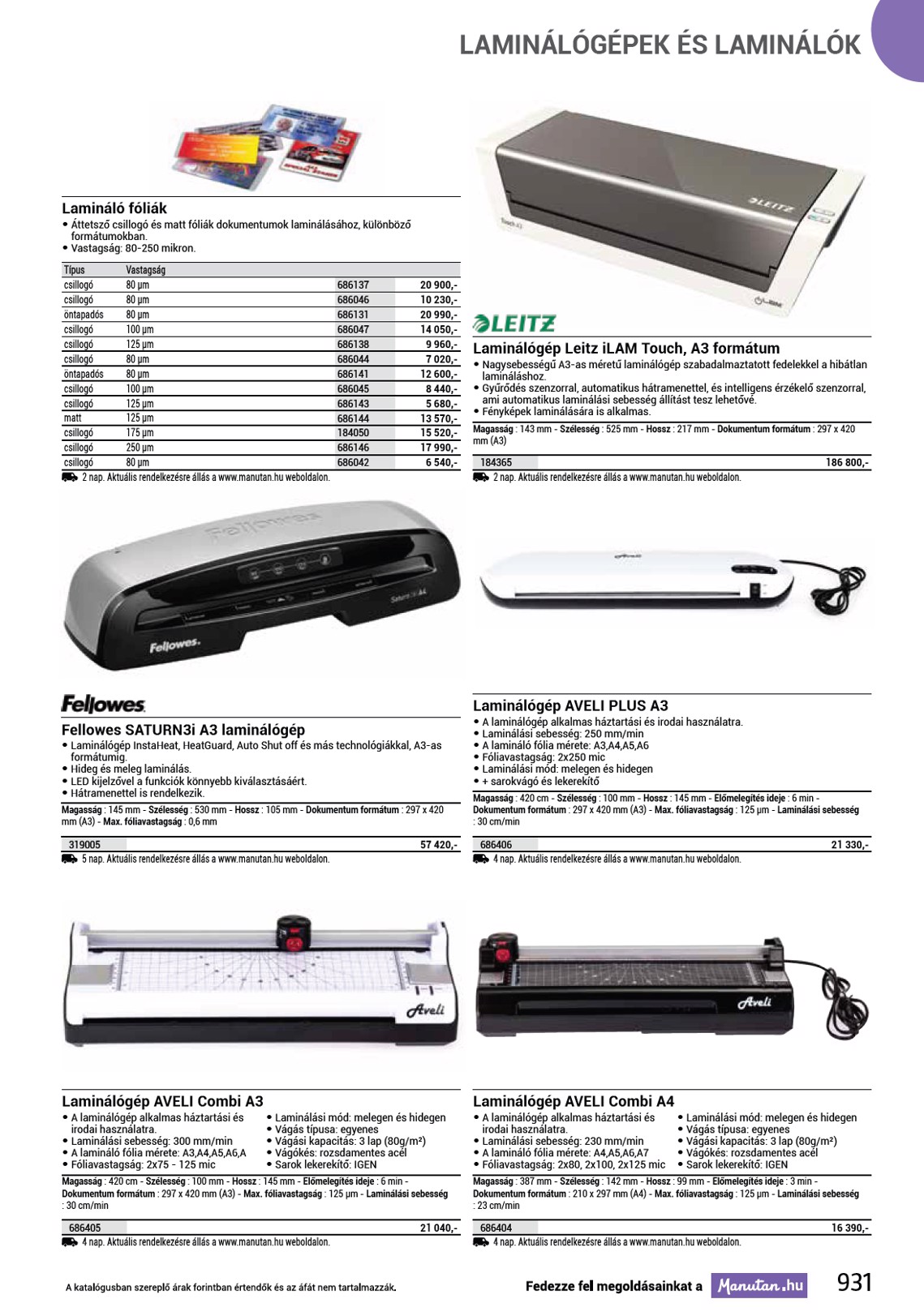 VÁGÓASZTALOK DAHLE 560 papírvágó gép, 340 mm • DAHLE 560 karos papírvágó gép, vágási szélessége 340 mm. • Vágási kapacitás 25 db A4-es formátumú lap. • Rögzíthető szögmérővel és tolómércével. • A kés átlátszó élvédője garantálja a munkabiztonságot. Vágáskapacitás (lapok száma) : 25 - Súly : 3,2 kg - Teljes szélesség : 285 mm - Teljes hossz : 450 mm - Max. vágásvastagság : 340 mm 891014 4 nap. Aktuális rendelkezésre állás a www.manutan.hu weboldalon. 106 720,- DAHLE 565 papírvágó gép, 390 mm • DAHLE 565 karos papírvágó gép, vágási szélessége 390 mm. • Vágási kapacitás 40 db A4-es formátumú lap. • Rögzíthető vonalzóval és tolómércével. • A kés forgó élvédője garantálja a munkabiztonságot. • Ajánlott igényesebb munkakörökben, magas követelményekkel a minőségre és a feldolgozott mennyiségre. Vágáskapacitás (lapok száma) : 40 - Súly : 8,4 kg - Teljes szélesség : 335 mm - Teljes hossz : 475 mm - Max. vágásvastagság : 390 mm 891015 4 nap. Aktuális rendelkezésre állás a www.manutan.hu weboldalon. 269 860,- DAHLE 867 papírvágó gép, 460 mm • DAHLE 867 karos papírvágó gép, vágási szélessége 460 mm. • Vágási kapacitás 35 db A3-es formátumú lap. • Rögzíthető vonalzóval, szögmérővel és beállítható külső határolóval ellátva. Vágáskapacitás (lapok száma) : 35 - Súly : 13 kg - Teljes szélesség : 364 mm - Teljes hossz : 513 mm - Max. vágásvastagság : 460 mm 891350 2 nap. Aktuális rendelkezésre állás a www.manutan.hu weboldalon. 304 690,- DAHLE 567 papírvágó gép, 550 mm • DAHLE 567 karos papírvágó gép, vágási szélessége 550 mm. • Vágási kapacitás 35 db A4-es formátumú lap. • A kés automatikus élvédője garantálja a munkabiztonságot. • Ajánlott igényesebb munkakörökben, magas követelményekkel a minőségre és a feldolgozott mennyiségre. Vágáskapacitás (lapok száma) : 35 - Súly : 14 kg - Teljes szélesség : 365 mm - Teljes hossz : 600 mm - Max. vágásvastagság : 550 mm 891018 Aktuális rendelkezésre állás a www.manutan.hu weboldalon. 511 710,- Fellowes Atom papírvágó gép, A3-es formátum • Fellowes Atom nagykapacitású görgős papírvágó gép, vágási szélessége 460 mm. • A vágás a penge és az élesített alsó ellenkés között jön létre, keményebb anyagok vágása is lehetséges. • Megfelel nagy mennyiségű dokumentumok vágásához. Vágáskapacitás (lapok száma) : 30 - Vágás hossza : 460 mm - Teljes szélesség : 415 mm - Teljes hossz : 780 mm - Súly : 4 kg 891395 4 nap. Aktuális rendelkezésre állás a www.manutan.hu weboldalon. 118 130,- Fellowes Stellar papírvágó gép, A4-es formátum • Fellowes Stellar karos papírvágó gép, vágási szélessége 380 mm, nemcsak papír és fényképpapír, de film és kartonpapír vágására is alkalmas. • A kés átlátszó élvédője garantálja a munkabiztonságot. Vágáskapacitás (lapok száma) : 20 - Súly : 5,5 kg - Teljes szélesség : 300 mm - Teljes hossz : 680 mm - Max. vágásvastagság : 380 mm 8912764 2 nap. Aktuális rendelkezésre állás a www.manutan.hu weboldalon. 111 320,- 934