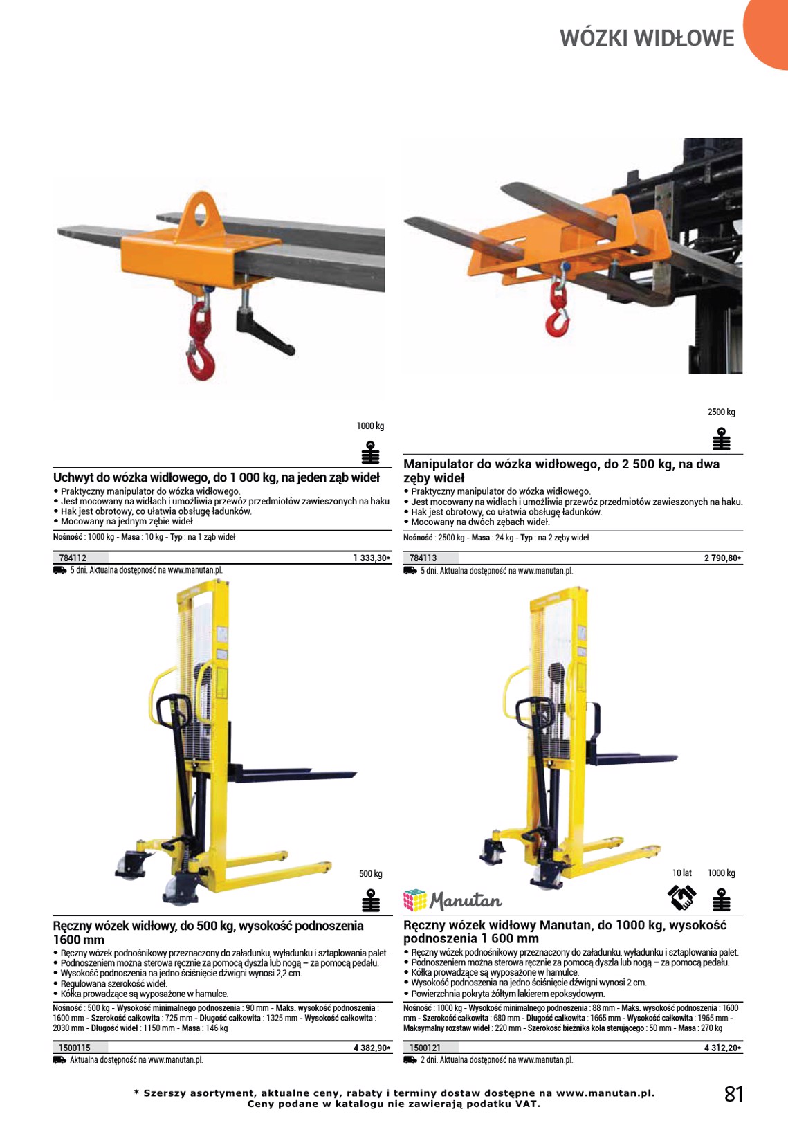 WÓZKI PALETOWE RĘCZNE 2300 kg 2300 kg Wózki paletowe BT LHM230PRO z mechanizmem uproszczonego rozbiegu, do 2 300 kg, koła sterujące z poliuretanu • Wózki paletowe o zwiększonej nośności wyposażono w system ułatwiający rozbieg wózka. • Siła konieczna do wprawienia w ruch jest mniejsza o 67%, co zwiększa efektywność przy transporcie ciężkich ładunków. • Łatwe ustawianie w wymaganym położeniu, wzmocniona rama. • Dożywotnia gwarancja na elementy nośne. Długość wideł : 1150 mm - Rozstaw zewnętrzny wideł : 520 mm - Nośność : 2300 kg - Masa : 75 kg - Wysokość minimalnego podnoszenia : 85 mm - Maks. wysokość podnoszenia : 200 mm Typ koła przy widłach jeden komplet 453002 dwa komplety 453003 5 dni. Aktualna dostępność na www.manutan.pl. 4 846,20* 5 220,60* Wózki paletowe BT LHM230QP, do 2 300 kg, koła sterujące z poliuretanu, funkcja szybkiego podnoszenia • Wózki paletowe o podwyższonej nośności. • Służą do transportu towaru na paletach w magazynach, sklepach itp. • Funkcja szybkiego podnoszenia idealnie sprawdza się w sytuacji, gdy konieczny jest przewóz dużej ilości palet - ładunek zostaje podniesiony już przy drugim ściśnięciu dźwigni. Materiał koła przy widłach : Poliuretan - Długość wideł : 1150 mm - Rozstaw zewnętrzny wideł : 520 mm - Nośność : 2300 kg - Masa : 63 kg - Wysokość minimalnego podnoszenia : 85 mm - Maks. wysokość podnoszenia : 200 mm Typ koła przy widłach jeden komplet 453023 dwa komplety 453024 5 dni. Aktualna dostępność na www.manutan.pl. 3 362,50* 3 693,90* 2300 kg Wózek paletowy BT LHM230 z hamulcem ręcznym, do 2 300 kg, koła sterujące Vulkollan • Wózek paletowy do codziennego stosowania przy transporcie towaru na paletach lub przy załadunku i rozładunku palet z samochodów ciężarowych. • Hamulec ręczny na uchwycie sterującym, wzmocniona rama. • Dożywotnia gwarancja na elementy nośne. Typ koła przy widłach : dwa komplety - Długość wideł : 1150 mm - Rozstaw zewnętrzny wideł : 520 mm - Nośność : 2300 kg - Masa : 65 kg - Wysokość minimalnego podnoszenia : 85 mm - Maks. wysokość podnoszenia : 200 mm 453020 Aktualna dostępność na www.manutan.pl. 5 205,80* 2000 kg 2300 kg 3000 kg Wózek paletowy BT LHM300, do 3 000 kg, koła sterujące Vulkollan • Wózek paletowy o dużej nośności. • Odpowiedni do transportu towaru lub jego załadunku i rozładunku z samochodów ciężarowych. • Wzmocniona rama, koła Vulkollan. Typ koła przy widłach : dwa komplety - Materiał koła przy widłach : Vulkollan - Długość wideł : 1150 mm - Rozstaw zewnętrzny wideł : 520 mm - Nośność : 3000 kg - Masa : 105 kg - Wysokość minimalnego podnoszenia : 85 mm - Maks. wysokość podnoszenia : 200 mm 453021 Aktualna dostępność na www.manutan.pl. 8 952,20* Niskoprofilowy wózek paletowy BT LHM200, do 2 000 kg, nylonowe koła sterujące • Wózek paletowy o zwiększonej nośności. • Niski profil umożliwia łatwe podnoszenie palet o niestandardowych rozmiarach. • Odpowiedni do transportu towaru w magazynach, zakładach przemysłowych itp. • Wzmocniona rama, niska masa. Typ koła przy widłach : jeden komplet - Materiał koła przy widłach : Nylon - Długość wideł : 1150 mm - Rozstaw zewnętrzny wideł : 520 mm - Nośność : 2000 kg - Masa : 63 kg - Wysokość minimalnego podnoszenia : 55 mm - Maks. wysokość podnoszenia : 125 mm 453022 Aktualna dostępność na www.manutan.pl. 4 990,10* Wózek paletowy BT LHM230SI z cichym mechanizmem pracy, do 2 300 kg, gumowe koła sterujące • Wózek paletowy o zwiększonej nośności skonstruowany tak, aby podczas transportu ładunków wszystkich typów generował minimalny hałas (60 dB). • Odpowiedni do wykorzystywania przy dostawach w strefach mieszkalnych w godzinach porannych lub wieczornych. • Certyfikat Peak, oznaczenie Quiet Mark. Typ koła przy widłach : dwa komplety - Długość wideł : 1150 mm - Rozstaw zewnętrzny wideł : 520 mm - Nośność : 2300 kg - Masa : 63 kg - Wysokość minimalnego podnoszenia : 85 mm - Maks. wysokość podnoszenia : 200 mm 453047 5 dni. Aktualna dostępność na www.manutan.pl. 4 059,90* 76 manutan.pl @ manutan@manutan.pl 22 874 32 65