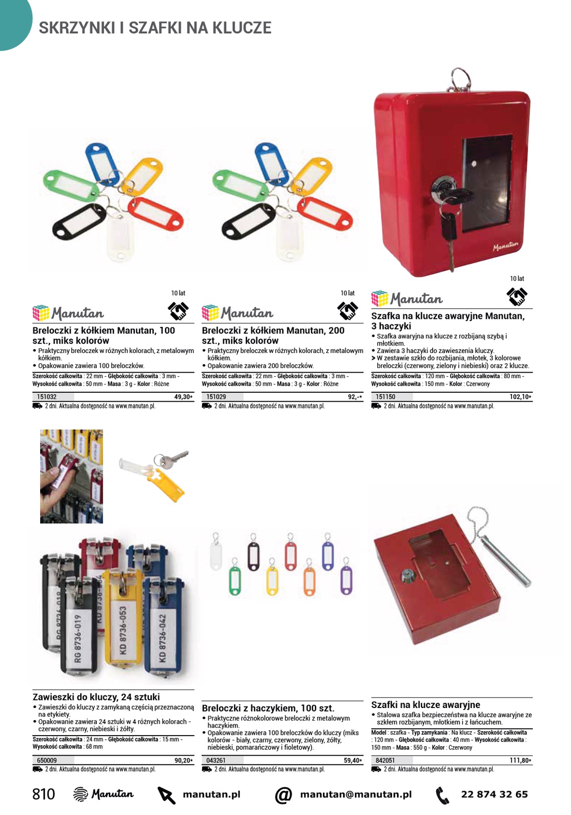 SKRZYNKI I SZAFKI NA KLUCZE 10 lat 10 lat Skrzynka na klucze Manutan z zamkiem elektronicznym, 60 haczyków • Stalowe skrzynki na klucze, kanciasty kształt, z 60 haczykami. • Wysoki poziom bezpieczeństwa zapewnia zamek na kod i klucz. • W zestawie z kolorowymi przywieszkami na klucze. Typ zamykania : Na klucz i kod - Szerokość całkowita : 400 mm - Głębokość całkowita : 120 mm - Wysokość całkowita : 340 mm - Ilość kluczy : 2 - Ilość zabezpieczonych kluczy : 60 - Masa : 11,5 kg - Kolor : Ciemnoszary 1501321 Aktualna dostępność na www.manutan.pl. 643,10* Szafka na klucze Manutan z zamkiem elektronicznym, 200 haczyków • Metalowa zamykana szafka na klucze, dostępna z akcesoriami umożliwiającymi montaż na ścianie. OO Zawartość opakowania: 2 klucze, kółko na klucze (żółty, niebieski, czerwony, czarny, zielony), 2 śruby mocujące, 4 baterie. Typ zamykania : Na klucz i kod - Szerokość całkowita : 630 mm - Głębokość całkowita : 300 mm - Wysokość całkowita : 460 mm - Ilość kluczy : 2 - Ilość zabezpieczonych kluczy : 200 - Masa : 31,58 kg - Kolor : Ciemnoszary 151035 Aktualna dostępność na www.manutan.pl. 1 229,30* Szafka na klucze z zamkiem elektronicznym, 20 haczyków • Stalowa skrzynka na klucze z zamkiem elektronicznym. Typ zamykania : Na kod - Szerokość całkowita : 245 mm - Głębokość całkowita : 100 mm - Wysokość całkowita : 300 mm - Ilość kluczy : 20 - Masa : 6,4 kg - Kolor : Jasnoszary 885417 2 dni. Aktualna dostępność na www.manutan.pl. 679,80* Szafka na klucze z zamkiem elektronicznym, 100 haczyków • Stalowa szafka na klucze z zamkiem elektronicznym i otworem bocznym do wrzucania kluczy do szafki. Typ zamykania : Na kod - Szerokość całkowita : 350 mm - Głębokość całkowita : 130 mm - Wysokość całkowita : 550 mm - Ilość kluczy : 100 - Masa : 13,7 kg - Kolor : Jasnoszary 885416 2 dni. Aktualna dostępność na www.manutan.pl. 1 429,70* * Szerszy asortyment, aktualne ceny, rabaty i terminy dostaw dostępne na www.manutan.pl. Ceny podane w katalogu nie zawierają podatku VAT. 813