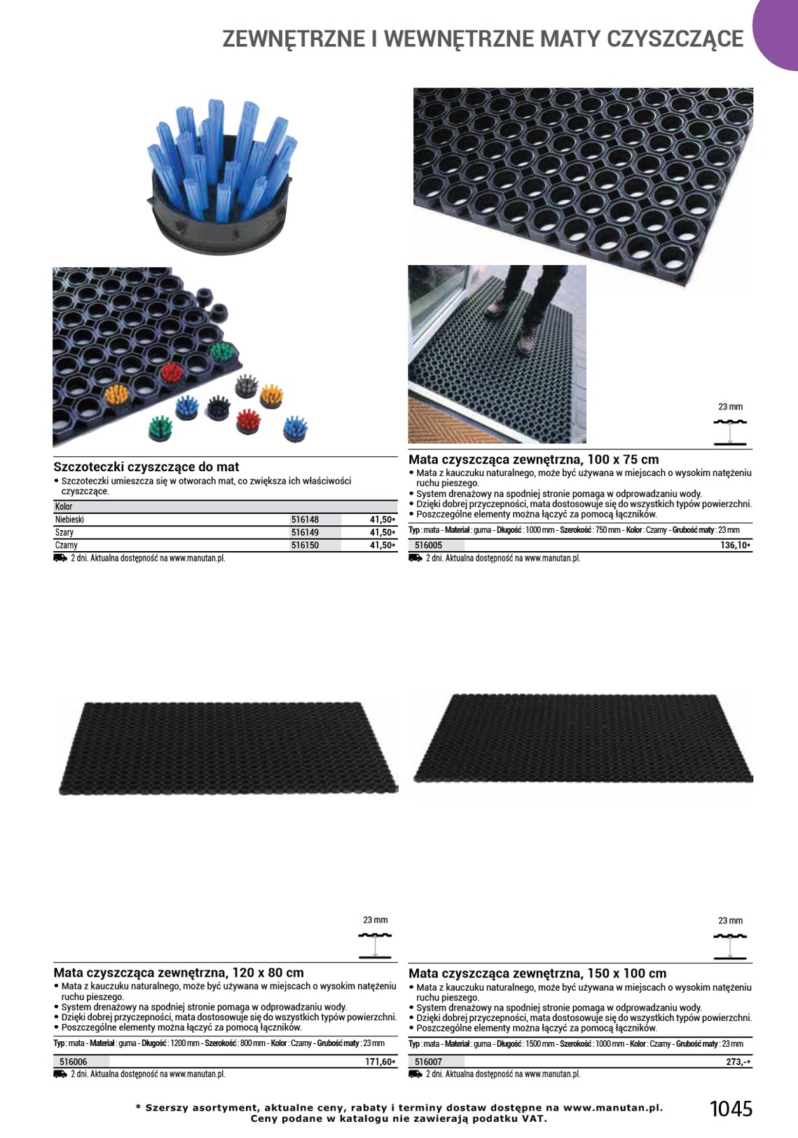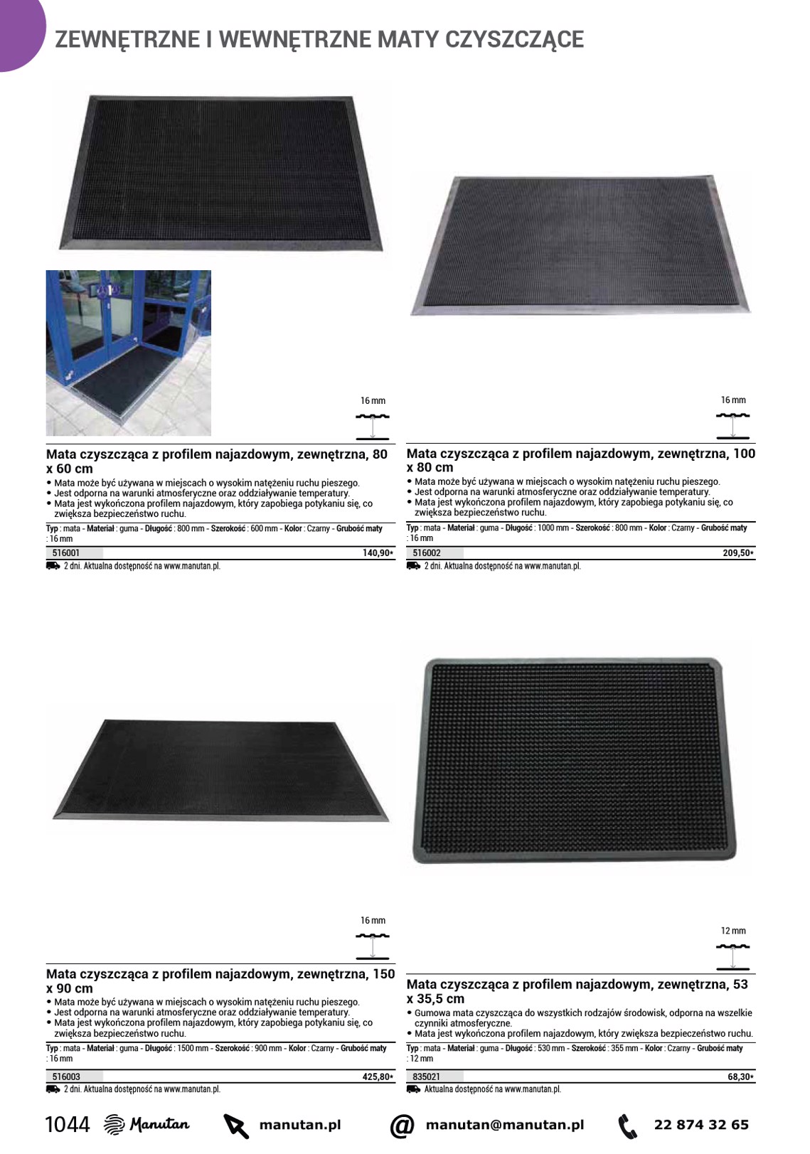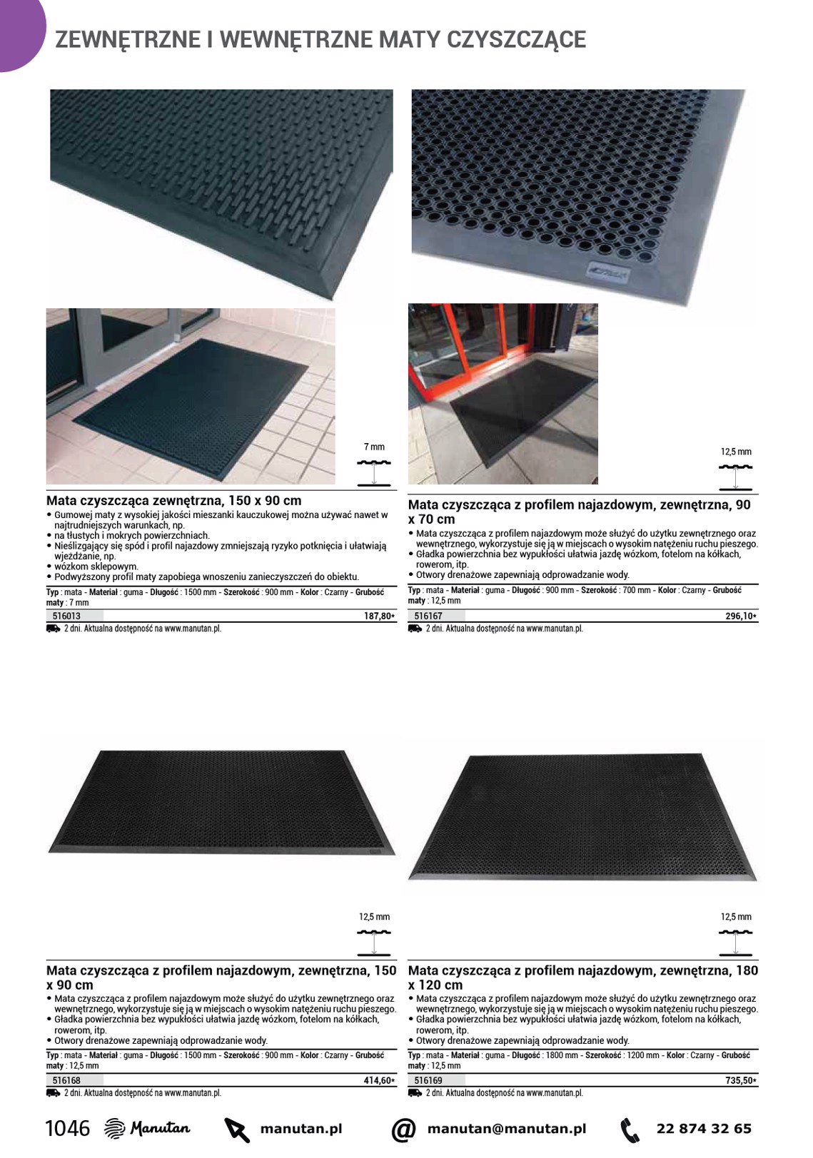 ZEWNĘTRZNE I WEWNĘTRZNE MATY CZYSZCZĄCE 7 mm 12,5 mm Mata czyszcząca zewnętrzna, 150 x 90 cm • Gumowej maty z wysokiej jakości mieszanki kauczukowej można używać nawet w najtrudniejszych warunkach, np. • na tłustych i mokrych powierzchniach. • Nieślizgający się spód i profil najazdowy zmniejszają ryzyko potknięcia i ułatwiają wjeżdżanie, np. • wózkom sklepowym. • Podwyższony profil maty zapobiega wnoszeniu zanieczyszczeń do obiektu. Typ : mata - Materiał : guma - Długość : 1500 mm - Szerokość : 900 mm - Kolor : Czarny - Grubość maty : 7 mm 516013 187,80* 2 dni. Aktualna dostępność na www.manutan.pl. Mata czyszcząca z profilem najazdowym, zewnętrzna, 90 x 70 cm • Mata czyszcząca z profilem najazdowym może służyć do użytku zewnętrznego oraz wewnętrznego, wykorzystuje się ją w miejscach o wysokim natężeniu ruchu pieszego. • Gładka powierzchnia bez wypukłości ułatwia jazdę wózkom, fotelom na kółkach, rowerom, itp. • Otwory drenażowe zapewniają odprowadzanie wody. Typ : mata - Materiał : guma - Długość : 900 mm - Szerokość : 700 mm - Kolor : Czarny - Grubość maty : 12,5 mm 516167 2 dni. Aktualna dostępność na www.manutan.pl. 296,10* 12,5 mm 12,5 mm Mata czyszcząca z profilem najazdowym, zewnętrzna, 150 x 90 cm • Mata czyszcząca z profilem najazdowym może służyć do użytku zewnętrznego oraz wewnętrznego, wykorzystuje się ją w miejscach o wysokim natężeniu ruchu pieszego. • Gładka powierzchnia bez wypukłości ułatwia jazdę wózkom, fotelom na kółkach, rowerom, itp. • Otwory drenażowe zapewniają odprowadzanie wody. Typ : mata - Materiał : guma - Długość : 1500 mm - Szerokość : 900 mm - Kolor : Czarny - Grubość maty : 12,5 mm 516168 2 dni. Aktualna dostępność na www.manutan.pl. 414,60* Mata czyszcząca z profilem najazdowym, zewnętrzna, 180 x 120 cm • Mata czyszcząca z profilem najazdowym może służyć do użytku zewnętrznego oraz wewnętrznego, wykorzystuje się ją w miejscach o wysokim natężeniu ruchu pieszego. • Gładka powierzchnia bez wypukłości ułatwia jazdę wózkom, fotelom na kółkach, rowerom, itp. • Otwory drenażowe zapewniają odprowadzanie wody. Typ : mata - Materiał : guma - Długość : 1800 mm - Szerokość : 1200 mm - Kolor : Czarny - Grubość maty : 12,5 mm 516169 2 dni. Aktualna dostępność na www.manutan.pl. 735,50* 1046 manutan.pl @ manutan@manutan.pl 22 874 32 65
