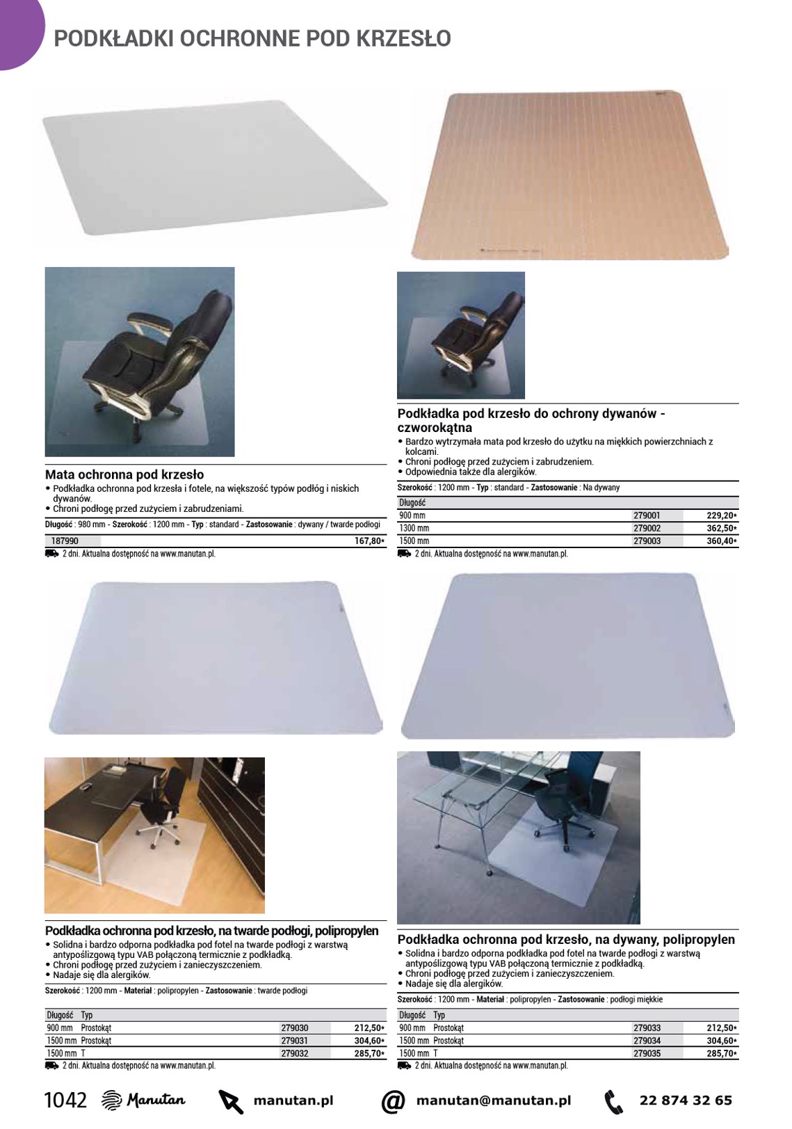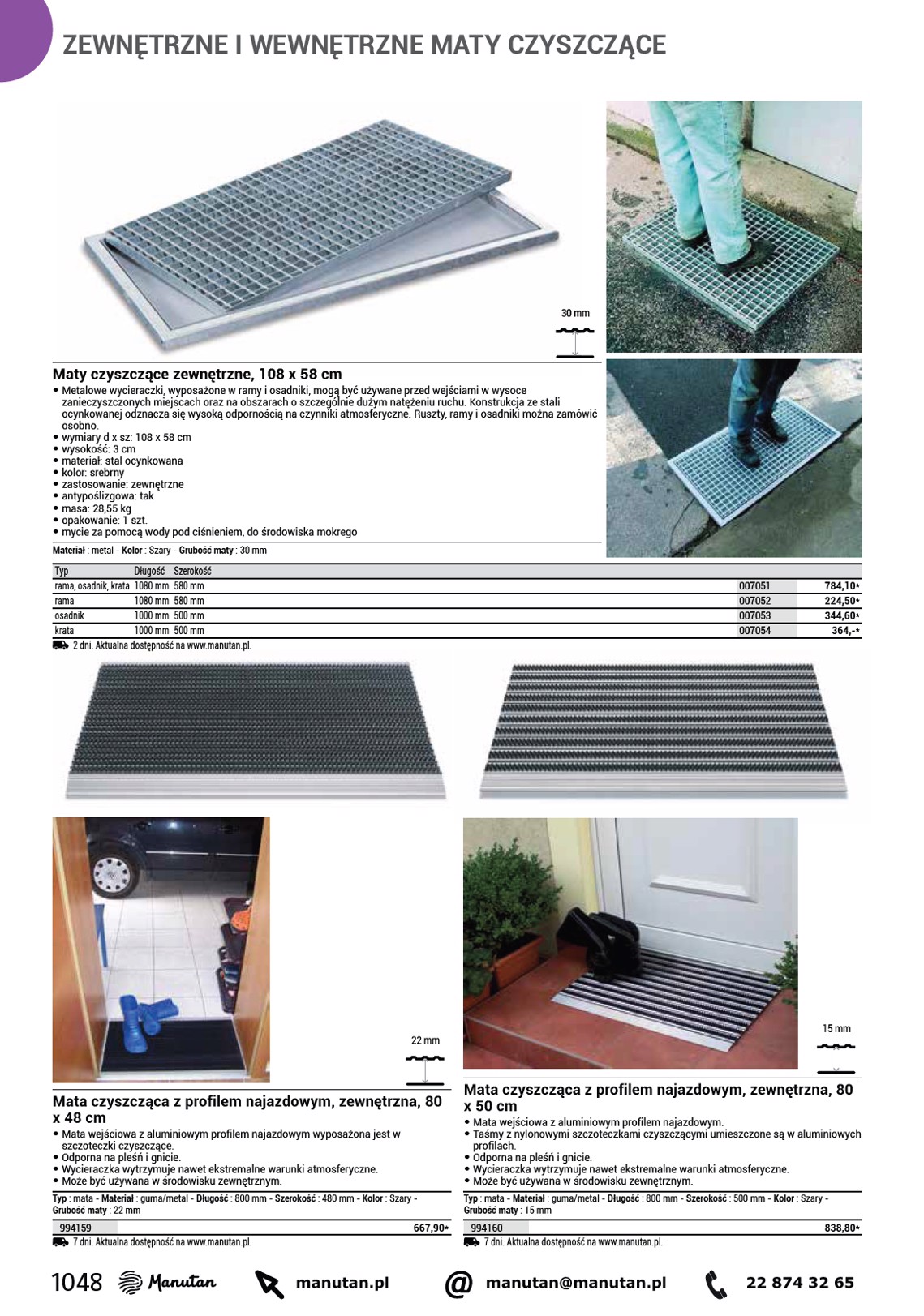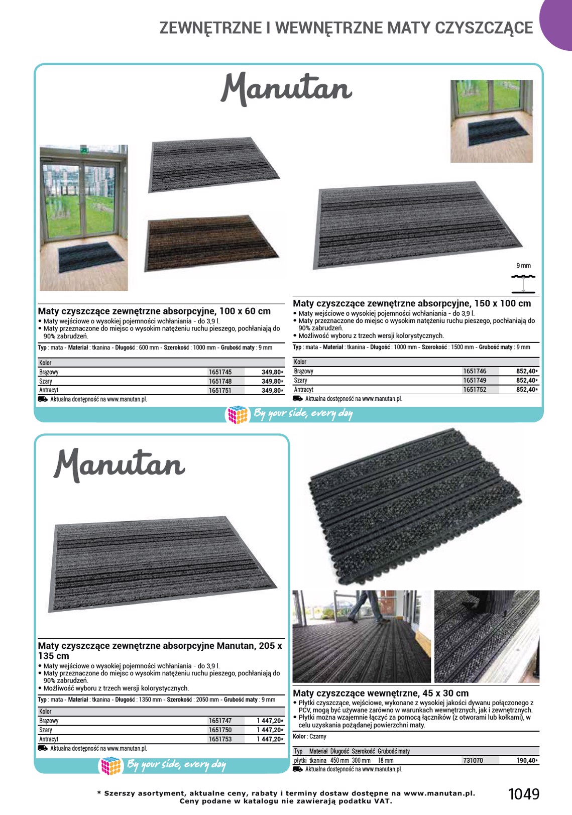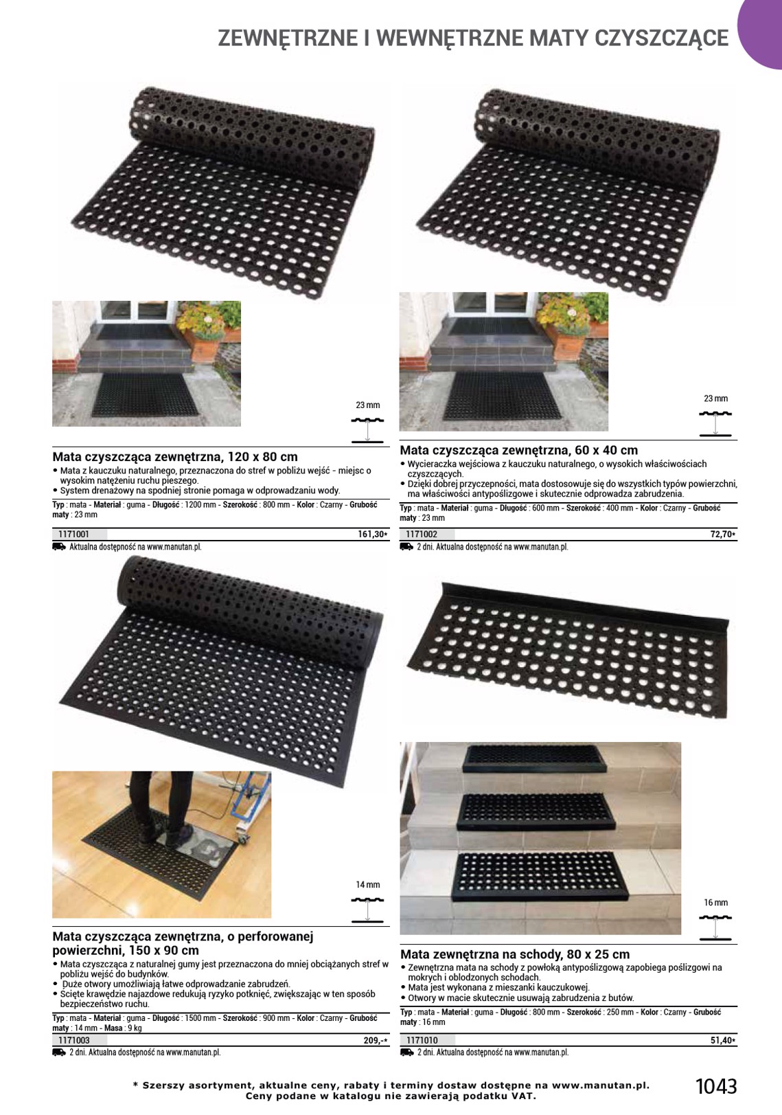 ZEWNĘTRZNE I WEWNĘTRZNE MATY CZYSZCZĄCE 7 mm 12,5 mm Mata czyszcząca zewnętrzna, 150 x 90 cm • Gumowej maty z wysokiej jakości mieszanki kauczukowej można używać nawet w najtrudniejszych warunkach, np. • na tłustych i mokrych powierzchniach. • Nieślizgający się spód i profil najazdowy zmniejszają ryzyko potknięcia i ułatwiają wjeżdżanie, np. • wózkom sklepowym. • Podwyższony profil maty zapobiega wnoszeniu zanieczyszczeń do obiektu. Typ : mata - Materiał : guma - Długość : 1500 mm - Szerokość : 900 mm - Kolor : Czarny - Grubość maty : 7 mm 516013 187,80* 2 dni. Aktualna dostępność na www.manutan.pl. Mata czyszcząca z profilem najazdowym, zewnętrzna, 90 x 70 cm • Mata czyszcząca z profilem najazdowym może służyć do użytku zewnętrznego oraz wewnętrznego, wykorzystuje się ją w miejscach o wysokim natężeniu ruchu pieszego. • Gładka powierzchnia bez wypukłości ułatwia jazdę wózkom, fotelom na kółkach, rowerom, itp. • Otwory drenażowe zapewniają odprowadzanie wody. Typ : mata - Materiał : guma - Długość : 900 mm - Szerokość : 700 mm - Kolor : Czarny - Grubość maty : 12,5 mm 516167 2 dni. Aktualna dostępność na www.manutan.pl. 296,10* 12,5 mm 12,5 mm Mata czyszcząca z profilem najazdowym, zewnętrzna, 150 x 90 cm • Mata czyszcząca z profilem najazdowym może służyć do użytku zewnętrznego oraz wewnętrznego, wykorzystuje się ją w miejscach o wysokim natężeniu ruchu pieszego. • Gładka powierzchnia bez wypukłości ułatwia jazdę wózkom, fotelom na kółkach, rowerom, itp. • Otwory drenażowe zapewniają odprowadzanie wody. Typ : mata - Materiał : guma - Długość : 1500 mm - Szerokość : 900 mm - Kolor : Czarny - Grubość maty : 12,5 mm 516168 2 dni. Aktualna dostępność na www.manutan.pl. 414,60* Mata czyszcząca z profilem najazdowym, zewnętrzna, 180 x 120 cm • Mata czyszcząca z profilem najazdowym może służyć do użytku zewnętrznego oraz wewnętrznego, wykorzystuje się ją w miejscach o wysokim natężeniu ruchu pieszego. • Gładka powierzchnia bez wypukłości ułatwia jazdę wózkom, fotelom na kółkach, rowerom, itp. • Otwory drenażowe zapewniają odprowadzanie wody. Typ : mata - Materiał : guma - Długość : 1800 mm - Szerokość : 1200 mm - Kolor : Czarny - Grubość maty : 12,5 mm 516169 2 dni. Aktualna dostępność na www.manutan.pl. 735,50* 1046 manutan.pl @ manutan@manutan.pl 22 874 32 65