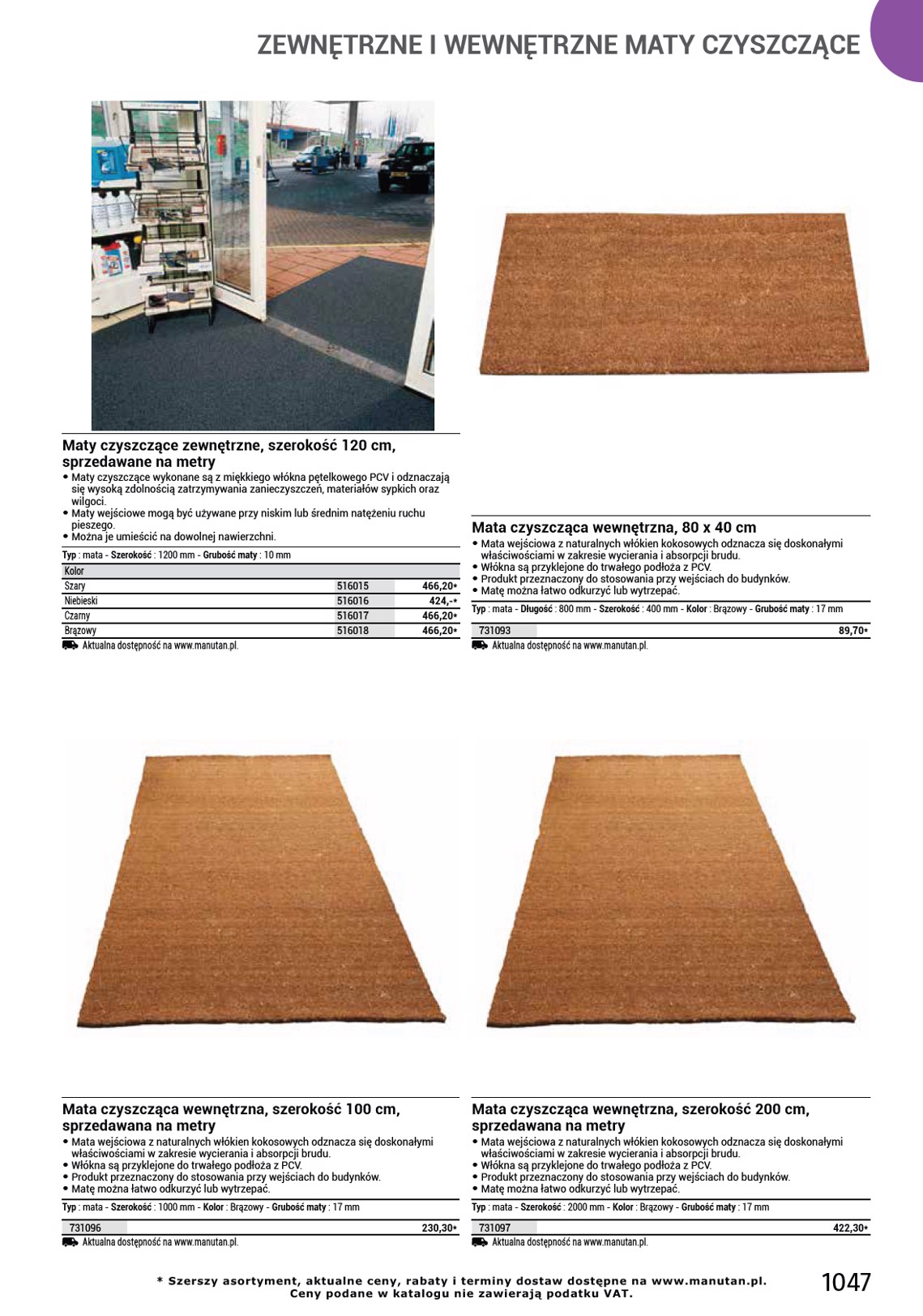 ZEWNĘTRZNE I WEWNĘTRZNE MATY CZYSZCZĄCE Maty czyszczące zewnętrzne, szerokość 120 cm, sprzedawane na metry • Maty czyszczące wykonane są z miękkiego włókna pętelkowego PCV i odznaczają się wysoką zdolnością zatrzymywania zanieczyszczeń, materiałów sypkich oraz wilgoci. • Maty wejściowe mogą być używane przy niskim lub średnim natężeniu ruchu pieszego. • Można je umieścić na dowolnej nawierzchni. Typ : mata - Szerokość : 1200 mm - Grubość maty : 10 mm Kolor Szary Niebieski Czarny Brązowy Aktualna dostępność na www.manutan.pl. 516015 516016 516017 516018 466,20* 424,-* 466,20* 466,20* Mata czyszcząca wewnętrzna, 80 x 40 cm • Mata wejściowa z naturalnych włókien kokosowych odznacza się doskonałymi właściwościami w zakresie wycierania i absorpcji brudu. • Włókna są przyklejone do trwałego podłoża z PCV. • Produkt przeznaczony do stosowania przy wejściach do budynków. • Matę można łatwo odkurzyć lub wytrzepać. Typ : mata - Długość : 800 mm - Szerokość : 400 mm - Kolor : Brązowy - Grubość maty : 17 mm 731093 Aktualna dostępność na www.manutan.pl. 89,70* Mata czyszcząca wewnętrzna, szerokość 100 cm, sprzedawana na metry • Mata wejściowa z naturalnych włókien kokosowych odznacza się doskonałymi właściwościami w zakresie wycierania i absorpcji brudu. • Włókna są przyklejone do trwałego podłoża z PCV. • Produkt przeznaczony do stosowania przy wejściach do budynków. • Matę można łatwo odkurzyć lub wytrzepać. Typ : mata - Szerokość : 1000 mm - Kolor : Brązowy - Grubość maty : 17 mm 731096 Aktualna dostępność na www.manutan.pl. 230,30* Mata czyszcząca wewnętrzna, szerokość 200 cm, sprzedawana na metry • Mata wejściowa z naturalnych włókien kokosowych odznacza się doskonałymi właściwościami w zakresie wycierania i absorpcji brudu. • Włókna są przyklejone do trwałego podłoża z PCV. • Produkt przeznaczony do stosowania przy wejściach do budynków. • Matę można łatwo odkurzyć lub wytrzepać. Typ : mata - Szerokość : 2000 mm - Kolor : Brązowy - Grubość maty : 17 mm 731097 Aktualna dostępność na www.manutan.pl. 422,30* * Szerszy asortyment, aktualne ceny, rabaty i terminy dostaw dostępne na www.manutan.pl. Ceny podane w katalogu nie zawierają podatku VAT. 1047
