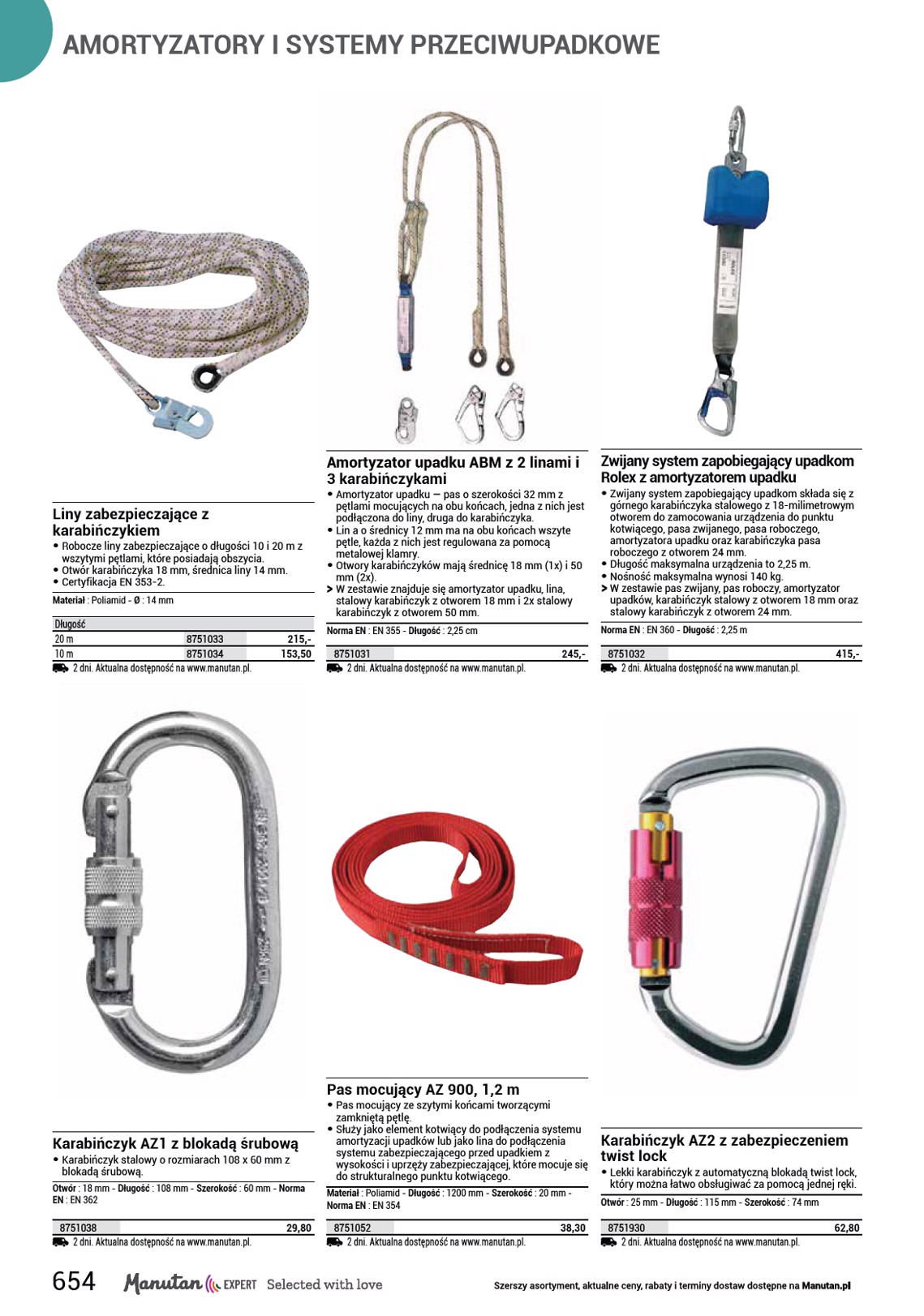 AMORTYZATORY I SYSTEMY PRZECIWUPADKOWE Liny zabezpieczające z karabińczykiem • Robocze liny zabezpieczające o długości 10 i 20 m z wszytymi pętlami, które posiadają obszycia. • Otwór karabińczyka 18 mm, średnica liny 14 mm. • Certyfikacja EN 353-2. Materiał : Poliamid - Ø : 14 mm Długość 20 m 8751033 10 m 8751034 2 dni. Aktualna dostępność na www.manutan.pl. 215,- 153,50 Amortyzator upadku ABM z 2 linami i 3 karabińczykami • Amortyzator upadku — pas o szerokości 32 mm z pętlami mocujących na obu końcach, jedna z nich jest podłączona do liny, druga do karabińczyka. • Lin a o średnicy 12 mm ma na obu końcach wszyte pętle, każda z nich jest regulowana za pomocą metalowej klamry. • Otwory karabińczyków mają średnicę 18 mm (1x) i 50 mm (2x). OO W zestawie znajduje się amortyzator upadku, lina, stalowy karabińczyk z otworem 18 mm i 2x stalowy karabińczyk z otworem 50 mm. Norma EN : EN 355 - Długość : 2,25 cm 8751031 2 dni. Aktualna dostępność na www.manutan.pl. 245,- Zwijany system zapobiegający upadkom Rolex z amortyzatorem upadku • Zwijany system zapobiegający upadkom składa się z górnego karabińczyka stalowego z 18-milimetrowym otworem do zamocowania urządzenia do punktu kotwiącego, pasa zwijanego, pasa roboczego, amortyzatora upadku oraz karabińczyka pasa roboczego z otworem 24 mm. • Długość maksymalna urządzenia to 2,25 m. • Nośność maksymalna wynosi 140 kg. OO W zestawie pas zwijany, pas roboczy, amortyzator upadków, karabińczyk stalowy z otworem 18 mm oraz stalowy karabińczyk z otworem 24 mm. Norma EN : EN 360 - Długość : 2,25 m 8751032 2 dni. Aktualna dostępność na www.manutan.pl. 415,- Karabińczyk AZ1 z blokadą śrubową • Karabińczyk stalowy o rozmiarach 108 x 60 mm z blokadą śrubową. Otwór : 18 mm - Długość : 108 mm - Szerokość : 60 mm - Norma EN : EN 362 8751038 2 dni. Aktualna dostępność na www.manutan.pl. 29,80 Pas mocujący AZ 900, 1,2 m • Pas mocujący ze szytymi końcami tworzącymi zamkniętą pętlę. • Służy jako element kotwiący do podłączenia systemu amortyzacji upadków lub jako lina do podłączenia systemu zabezpieczającego przed upadkiem z wysokości i uprzęży zabezpieczającej, które mocuje się do strukturalnego punktu kotwiącego. Materiał : Poliamid - Długość : 1200 mm - Szerokość : 20 mm - Norma EN : EN 354 8751052 2 dni. Aktualna dostępność na www.manutan.pl. 38,30 Karabińczyk AZ2 z zabezpieczeniem twist lock • Lekki karabińczyk z automatyczną blokadą twist lock, który można łatwo obsługiwać za pomocą jednej ręki. Otwór : 25 mm - Długość : 115 mm - Szerokość : 74 mm 8751930 2 dni. Aktualna dostępność na www.manutan.pl. 62,80 654