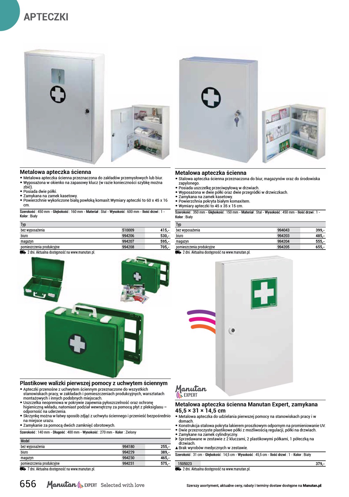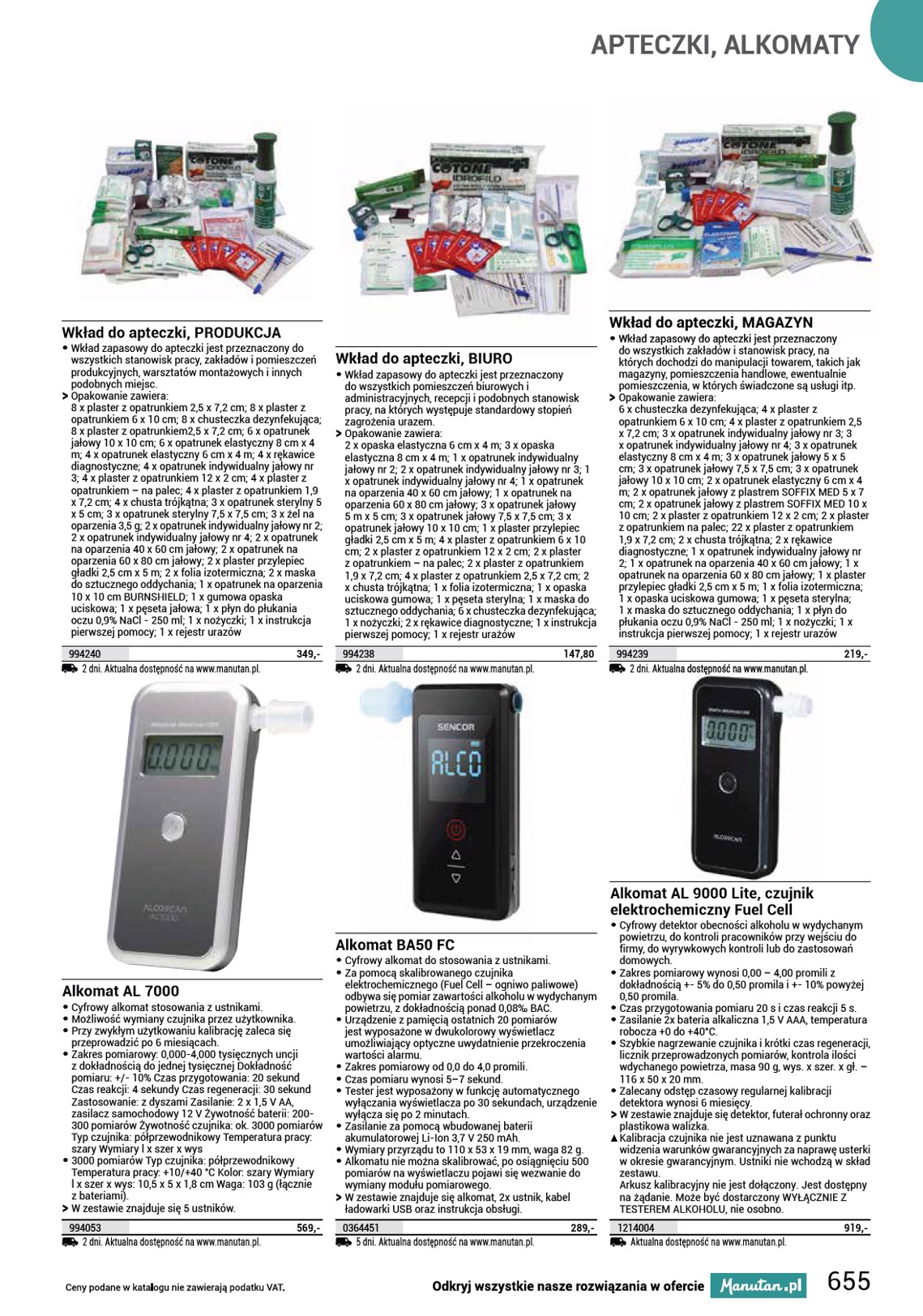 APTECZKI, ALKOMATY Wkład do apteczki, PRODUKCJA • Wkład zapasowy do apteczki jest przeznaczony do wszystkich stanowisk pracy, zakładów i pomieszczeń produkcyjnych, warsztatów montażowych i innych podobnych miejsc. OO Opakowanie zawiera: 8 x plaster z opatrunkiem 2,5 x 7,2 cm; 8 x plaster z opatrunkiem 6 x 10 cm; 8 x chusteczka dezynfekująca; 8 x plaster z opatrunkiem2,5 x 7,2 cm; 6 x opatrunek jałowy 10 x 10 cm; 6 x opatrunek elastyczny 8 cm x 4 m; 4 x opatrunek elastyczny 6 cm x 4 m; 4 x rękawice diagnostyczne; 4 x opatrunek indywidualny jałowy nr 3; 4 x plaster z opatrunkiem 12 x 2 cm; 4 x plaster z opatrunkiem – na palec; 4 x plaster z opatrunkiem 1,9 x 7,2 cm; 4 x chusta trójkątna; 3 x opatrunek sterylny 5 x 5 cm; 3 x opatrunek sterylny 7,5 x 7,5 cm; 3 x żel na oparzenia 3,5 g; 2 x opatrunek indywidualny jałowy nr 2; 2 x opatrunek indywidualny jałowy nr 4; 2 x opatrunek na oparzenia 40 x 60 cm jałowy; 2 x opatrunek na oparzenia 60 x 80 cm jałowy; 2 x plaster przylepiec gładki 2,5 cm x 5 m; 2 x folia izotermiczna; 2 x maska do sztucznego oddychania; 1 x opatrunek na oparzenia 10 x 10 cm BURNSHIELD; 1 x gumowa opaska uciskowa; 1 x pęseta jałowa; 1 x płyn do płukania oczu 0,9% NaCl - 250 ml; 1 x nożyczki; 1 x instrukcja pierwszej pomocy; 1 x rejestr urazów 994240 2 dni. Aktualna dostępność na www.manutan.pl. 349,- Wkład do apteczki, BIURO • Wkład zapasowy do apteczki jest przeznaczony do wszystkich pomieszczeń biurowych i administracyjnych, recepcji i podobnych stanowisk pracy, na których występuje standardowy stopień zagrożenia urazem. OO Opakowanie zawiera: 2 x opaska elastyczna 6 cm x 4 m; 3 x opaska elastyczna 8 cm x 4 m; 1 x opatrunek indywidualny jałowy nr 2; 2 x opatrunek indywidualny jałowy nr 3; 1 x opatrunek indywidualny jałowy nr 4; 1 x opatrunek na oparzenia 40 x 60 cm jałowy; 1 x opatrunek na oparzenia 60 x 80 cm jałowy; 3 x opatrunek jałowy 5 m x 5 cm; 3 x opatrunek jałowy 7,5 x 7,5 cm; 3 x opatrunek jałowy 10 x 10 cm; 1 x plaster przylepiec gładki 2,5 cm x 5 m; 4 x plaster z opatrunkiem 6 x 10 cm; 2 x plaster z opatrunkiem 12 x 2 cm; 2 x plaster z opatrunkiem – na palec; 2 x plaster z opatrunkiem 1,9 x 7,2 cm; 4 x plaster z opatrunkiem 2,5 x 7,2 cm; 2 x chusta trójkątna; 1 x folia izotermiczna; 1 x opaska uciskowa gumowa; 1 x pęseta sterylna; 1 x maska do sztucznego oddychania; 6 x chusteczka dezynfekująca; 1 x nożyczki; 2 x rękawice diagnostyczne; 1 x instrukcja pierwszej pomocy; 1 x rejestr urażów 994238 2 dni. Aktualna dostępność na www.manutan.pl. 147,80 Wkład do apteczki, MAGAZYN • Wkład zapasowy do apteczki jest przeznaczony do wszystkich zakładów i stanowisk pracy, na których dochodzi do manipulacji towarem, takich jak magazyny, pomieszczenia handlowe, ewentualnie pomieszczenia, w których świadczone są usługi itp. OO Opakowanie zawiera: 6 x chusteczka dezynfekująca; 4 x plaster z opatrunkiem 6 x 10 cm; 4 x plaster z opatrunkiem 2,5 x 7,2 cm; 3 x opatrunek indywidualny jałowy nr 3; 3 x opatrunek indywidualny jałowy nr 4; 3 x opatrunek elastyczny 8 cm x 4 m; 3 x opatrunek jałowy 5 x 5 cm; 3 x opatrunek jałowy 7,5 x 7,5 cm; 3 x opatrunek jałowy 10 x 10 cm; 2 x opatrunek elastyczny 6 cm x 4 m; 2 x opatrunek jałowy z plastrem SOFFIX MED 5 x 7 cm; 2 x opatrunek jałowy z plastrem SOFFIX MED 10 x 10 cm; 2 x plaster z opatrunkiem 12 x 2 cm; 2 x plaster z opatrunkiem na palec; 22 x plaster z opatrunkiem 1,9 x 7,2 cm; 2 x chusta trójkątna; 2 x rękawice diagnostyczne; 1 x opatrunek indywidualny jałowy nr 2; 1 x opatrunek na oparzenia 40 x 60 cm jałowy; 1 x opatrunek na oparzenia 60 x 80 cm jałowy; 1 x plaster przylepiec gładki 2,5 cm x 5 m; 1 x folia izotermiczna; 1 x opaska uciskowa gumowa; 1 x pęseta sterylna; 1 x maska do sztucznego oddychania; 1 x płyn do płukania oczu 0,9% NaCl - 250 ml; 1 x nożyczki; 1 x instrukcja pierwszej pomocy; 1 x rejestr urazów 994239 2 dni. Aktualna dostępność na www.manutan.pl. 219,- Alkomat AL 7000 • Cyfrowy alkomat stosowania z ustnikami. • Możliwość wymiany czujnika przez użytkownika. • Przy zwykłym użytkowaniu kalibrację zaleca się przeprowadzić po 6 miesiącach. • Zakres pomiarowy: 0,000-4,000 tysięcznych uncji z dokładnością do jednej tysięcznej Dokładność pomiaru: +/- 10% Czas przygotowania: 20 sekund Czas reakcji: 4 sekundy Czas regeneracji: 30 sekund Zastosowanie: z dyszami Zasilanie: 2 x 1,5 V AA, zasilacz samochodowy 12 V Żywotność baterii: 200- 300 pomiarów Żywotność czujnika: ok. 3000 pomiarów Typ czujnika: półprzewodnikowy Temperatura pracy: szary Wymiary l x szer x wys • 3000 pomiarów Typ czujnika: półprzewodnikowy Temperatura pracy: +10/+40 °C Kolor: szary Wymiary l x szer x wys: 10,5 x 5 x 1,8 cm Waga: 103 g (łącznie z bateriami). OO W zestawie znajduje się 5 ustników. 994053 2 dni. Aktualna dostępność na www.manutan.pl. 569,- Alkomat BA50 FC • Cyfrowy alkomat do stosowania z ustnikami. • Za pomocą skalibrowanego czujnika elektrochemicznego (Fuel Cell – ogniwo paliwowe) odbywa się pomiar zawartości alkoholu w wydychanym powietrzu, z dokładnością ponad 0,08‰ BAC. • Urządzenie z pamięcią ostatnich 20 pomiarów jest wyposażone w dwukolorowy wyświetlacz umożliwiający optyczne uwydatnienie przekroczenia wartości alarmu. • Zakres pomiarowy od 0,0 do 4,0 promili. • Czas pomiaru wynosi 5–7 sekund. • Tester jest wyposażony w funkcję automatycznego wyłączania wyświetlacza po 30 sekundach, urządzenie wyłącza się po 2 minutach. • Zasilanie za pomocą wbudowanej baterii akumulatorowej Li-Ion 3,7 V 250 mAh. • Wymiary przyrządu to 110 x 53 x 19 mm, waga 82 g. • Alkomatu nie można skalibrować, po osiągnięciu 500 pomiarów na wyświetlaczu pojawi się wezwanie do wymiany modułu pomiarowego. OO W zestawie znajduje się alkomat, 2x ustnik, kabel ładowarki USB oraz instrukcja obsługi. 0364451 5 dni. Aktualna dostępność na www.manutan.pl. 289,- Alkom