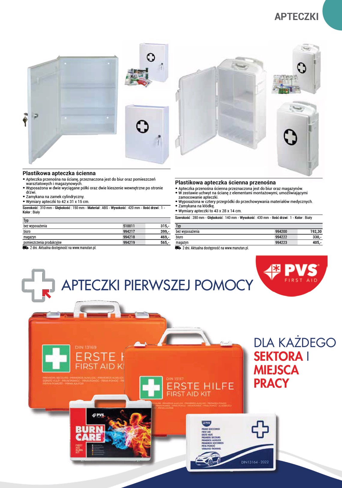APTECZKI Plastikowa apteczka ścienna • Apteczka przenośna na ścianę, przeznaczona jest do biur oraz pomieszczeń warsztatowych i magazynowych. • Wyposażona w dwie wyciągane półki oraz dwie kieszenie wewnętrzne po stronie drzwi. • Zamykana na zamek cylindryczny. • Wymiary apteczki to 42 x 31 x 15 cm. Szerokość : 310 mm - Głębokość : 150 mm - Materiał : ABS - Wysokość : 420 mm - Ilość drzwi : 1 - Kolor : Biały Typ bez wyposażenia biuro magazyn pomieszczenia produkcyjne 2 dni. Aktualna dostępność na www.manutan.pl. 510011 994217 994218 994219 315,- 399,- 469,- 565,- Plastikowa apteczka ścienna przenośna • Apteczka przenośna ścienna przeznaczona jest do biur oraz magazynów. • W zestawie uchwyt na ścianę z elementami montażowymi, umożliwiającymi zamocowanie apteczki. • Wyposażona w cztery przegródki do przechowywania materiałów medycznych. • Zamykana na kłódkę. • Wymiary apteczki to 43 x 28 x 14 cm. Szerokość : 280 mm - Głębokość : 140 mm - Wysokość : 430 mm - Ilość drzwi : 1 - Kolor : Biały Typ bez wyposażenia biuro magazyn 2 dni. Aktualna dostępność na www.manutan.pl. 994200 994222 994223 192,30 330,- 405,- APTECZKI PIERWSZEJ POMOCY DLA KAŻDEGO SEKTORA I MIEJSCA PRACY