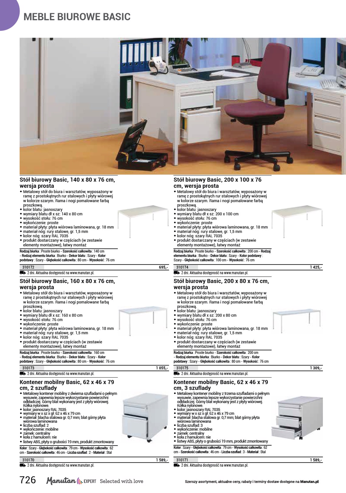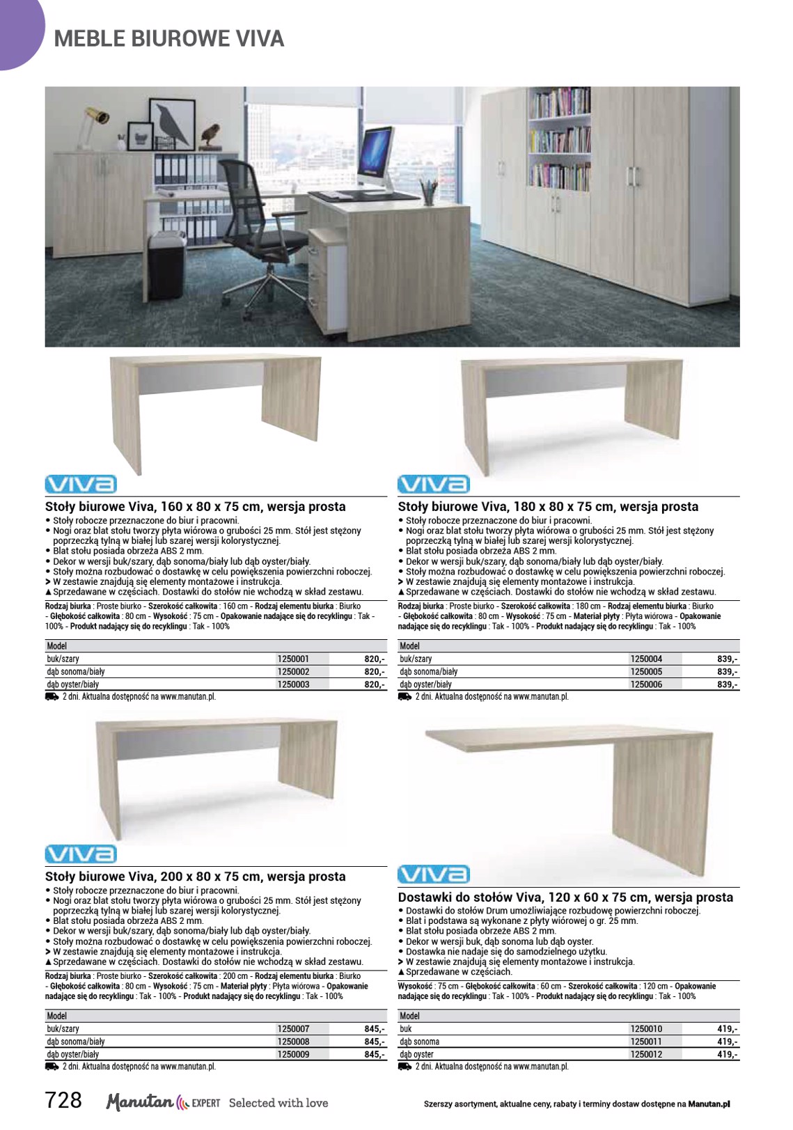 BIURKA szerszy asortyment Stoły biurowe Square, wersja prosta, nogi antracyt, dąb • Biurka o prostym i praktycznym designie. • Kwadratowe metalowe podnóże w kolorze antracytu. • Wykonane z obustronnie laminowanej płyty wiórowej. • Blaty z obrzeżami ABS o grubości 2 mm. Rodzaj biurka : Proste biurko - Rodzaj elementu biurka : Biurko - Dekor blatu : Dąb - Kolor podstawy : Antracyt - Głębokość całkowita : 80 cm - Wysokość : 75 cm - Materiał płyty : ABS Szerokość całkowita 120 cm 1321090 1 215,- 140 cm 1321091 1 219,- 160 cm 1321092 1 379,- 180 cm 1321093 1 389,- 200 cm 1321094 1 395,- 2 dni. Aktualna dostępność na www.manutan.pl. Stoły biurowe Square, wersja prosta, nogi białe, buk • Biurka o prostym i praktycznym designie. • Kwadratowe metalowe podnóże w kolorze białym. • Wykonane z obustronnie laminowanej płyty wiórowej. • Blaty z obrzeżami ABS o grubości 2 mm. Rodzaj biurka : Proste biurko - Rodzaj elementu biurka : Biurko - Dekor blatu : Buk - Kolor podstawy : Biały - Głębokość całkowita : 80 cm - Wysokość : 75 cm - Materiał płyty : ABS Szerokość całkowita 120 cm 1321150 1 209,- 140 cm 1321151 1 215,- 160 cm 1321152 1 375,- 180 cm 1321153 1 385,- 200 cm 1321154 1 390,- 2 dni. Aktualna dostępność na www.manutan.pl. Stoły biurowe Standard, wersja prosta, buk • Biurka o prostym i praktycznym designie. • Metalowe podnóże w kolorze białym. • Wykonane z obustronnie laminowanej płyty wiórowej. • Blaty z obrzeżami ABS o grubości 2 mm. Rodzaj biurka : Proste biurko - Rodzaj elementu biurka : Biurko - Dekor blatu : Buk - Kolor podstawy : Biały - Głębokość całkowita : 80 cm - Wysokość : 75 cm - Materiał płyty : ABS Szerokość całkowita 120 cm 1321125 1 069,- 140 cm 1321126 1 075,- 160 cm 1321127 1 229,- 180 cm 1321128 1 239,- 200 cm 1321129 1 249,- 2 dni. Aktualna dostępność na www.manutan.pl. Stoły biurowe Standard, wersja prosta, dąb • Biurka o prostym i praktycznym designie. • Metalowe podnóże w kolorze antracytu. • Wykonane z obustronnie laminowanej płyty wiórowej. • Blaty z obrzeżami ABS o grubości 2 mm. Rodzaj biurka : Proste biurko - Rodzaj elementu biurka : Biurko - Dekor blatu : Dąb - Kolor podstawy : Antracyt - Głębokość całkowita : 80 cm - Wysokość : 75 cm - Materiał płyty : ABS Szerokość całkowita 120 cm 1321060 1 069,- 140 cm 1321061 1 079,- 160 cm 1321062 1 239,- 180 cm 1321063 1 245,- 200 cm 1321064 1 255,- 2 dni. Aktualna dostępność na www.manutan.pl. Stoły biurowe Shape, wersja skośna, nogi antracyt, dąb • Biurka o prostym i praktycznym designie. • Ukośne metalowe podnóże w kolorze antracytu. • Wykonane z obustronnie laminowanej płyty wiórowej. • Blaty z obrzeżami ABS o grubości 2 mm. Rodzaj biurka : Proste biurko - Rodzaj elementu biurka : Biurko - Dekor blatu : Dąb - Kolor podstawy : Antracyt - Głębokość całkowita : 80 cm - Wysokość : 75 cm - Materiał płyty : ABS Szerokość całkowita 120 cm 1321030 1 239,- 140 cm 1321031 1 249,- 160 cm 1321032 1 409,- 180 cm 1321033 1 419,- 200 cm 1321034 1 425,- 2 dni. Aktualna dostępność na www.manutan.pl. Stoły biurowe Shape, wersja prosta, buk • Biurka o prostym i praktycznym designie. • Kwadratowe metalowe podnóże w kolorze białym. • Wykonane z obustronnie laminowanej płyty wiórowej. • Blaty z obrzeżami ABS o grubości 2 mm. Rodzaj biurka : Proste biurko - Rodzaj elementu biurka : Biurko - Dekor blatu : Buk - Kolor podstawy : Biały - Głębokość całkowita : 80 cm - Wysokość : 75 cm - Materiał płyty : ABS Szerokość całkowita 120 cm 1321100 1 239,- 140 cm 1321101 1 245,- 160 cm 1321102 1 405,- 180 cm 1321103 1 410,- 200 cm 1321104 1 419,- 2 dni. Aktualna dostępność na www.manutan.pl. 730