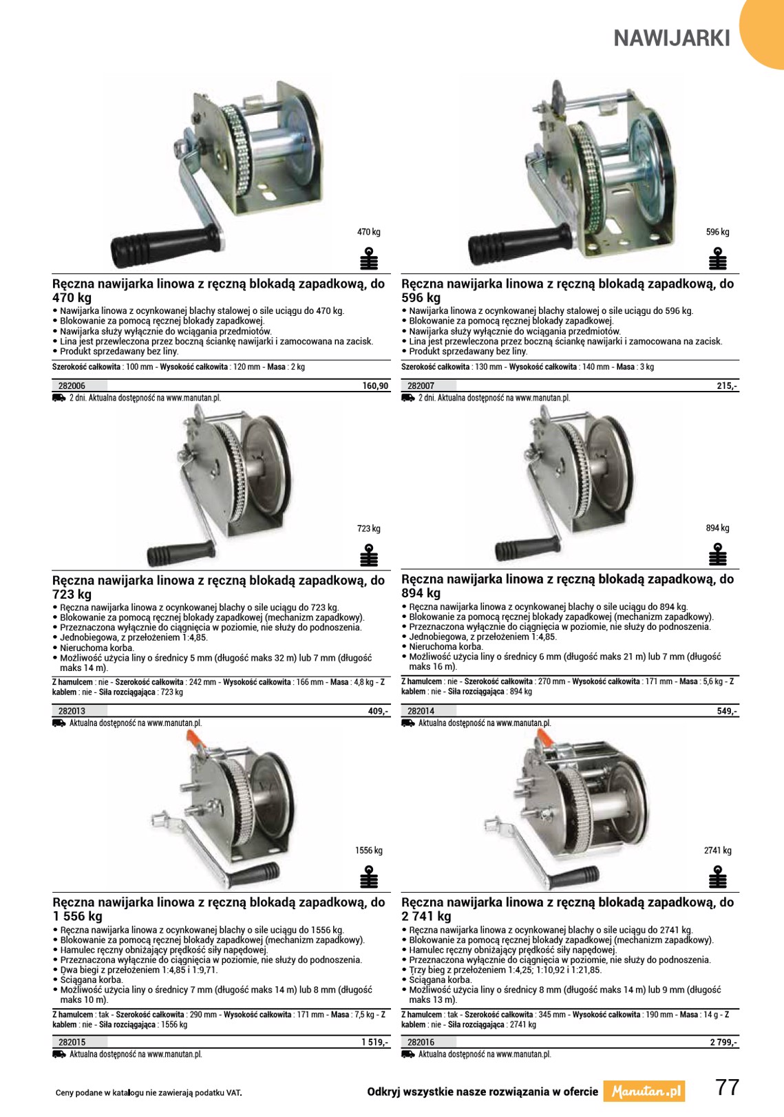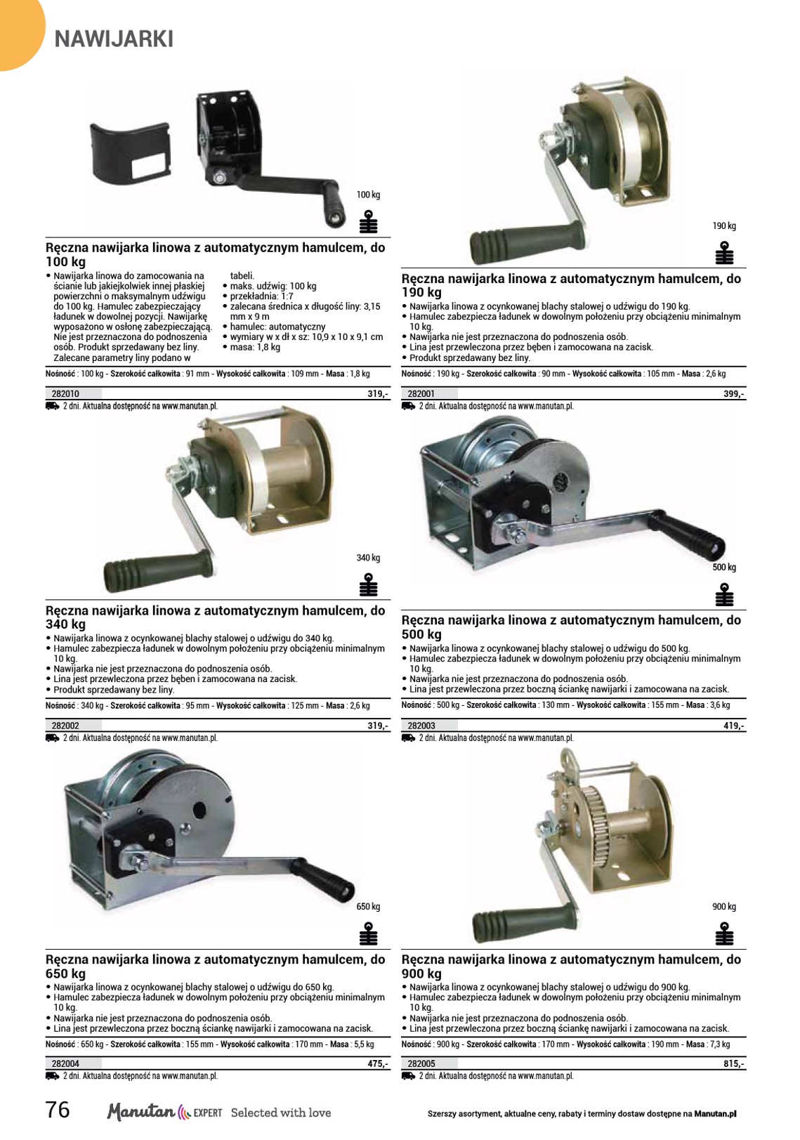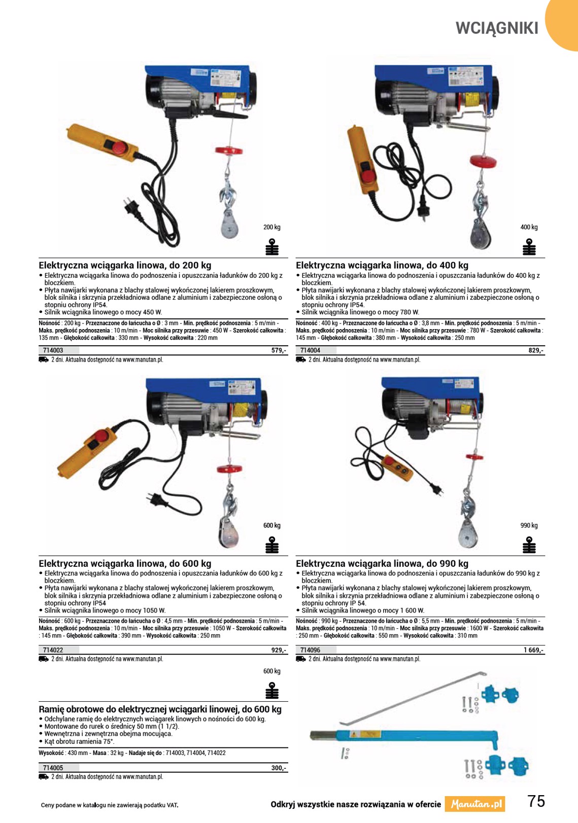 WCIĄGNIKI 200 kg 400 kg Elektryczna wciągarka linowa, do 200 kg • Elektryczna wciągarka linowa do podnoszenia i opuszczania ładunków do 200 kg z bloczkiem. • Płyta nawijarki wykonana z blachy stalowej wykończonej lakierem proszkowym, blok silnika i skrzynia przekładniowa odlane z aluminium i zabezpieczone osłoną o stopniu ochrony IP54. • Silnik wciągnika linowego o mocy 450 W. Nośność : 200 kg - Przeznaczone do łańcucha o Ø : 3 mm - Min. prędkość podnoszenia : 5 m/min - Maks. prędkość podnoszenia : 10 m/min - Moc silnika przy przesuwie : 450 W - Szerokość całkowita : 135 mm - Głębokość całkowita : 330 mm - Wysokość całkowita : 220 mm 714003 2 dni. Aktualna dostępność na www.manutan.pl. 579,- Elektryczna wciągarka linowa, do 400 kg • Elektryczna wciągarka linowa do podnoszenia i opuszczania ładunków do 400 kg z bloczkiem. • Płyta nawijarki wykonana z blachy stalowej wykończonej lakierem proszkowym, blok silnika i skrzynia przekładniowa odlane z aluminium i zabezpieczone osłoną o stopniu ochrony IP54. • Silnik wciągnika linowego o mocy 780 W. Nośność : 400 kg - Przeznaczone do łańcucha o Ø : 3,8 mm - Min. prędkość podnoszenia : 5 m/min - Maks. prędkość podnoszenia : 10 m/min - Moc silnika przy przesuwie : 780 W - Szerokość całkowita : 145 mm - Głębokość całkowita : 380 mm - Wysokość całkowita : 250 mm 714004 2 dni. Aktualna dostępność na www.manutan.pl. 829,- 600 kg 990 kg Elektryczna wciągarka linowa, do 600 kg • Elektryczna wciągarka linowa do podnoszenia i opuszczania ładunków do 600 kg z bloczkiem. • Płyta nawijarki wykonana z blachy stalowej wykończonej lakierem proszkowym, blok silnika i skrzynia przekładniowa odlane z aluminium i zabezpieczone osłoną o stopniu ochrony IP54 • Silnik wciągnika linowego o mocy 1050 W. Nośność : 600 kg - Przeznaczone do łańcucha o Ø : 4,5 mm - Min. prędkość podnoszenia : 5 m/min - Maks. prędkość podnoszenia : 10 m/min - Moc silnika przy przesuwie : 1050 W - Szerokość całkowita : 145 mm - Głębokość całkowita : 390 mm - Wysokość całkowita : 250 mm 714022 2 dni. Aktualna dostępność na www.manutan.pl. 929,- 600 kg Elektryczna wciągarka linowa, do 990 kg • Elektryczna wciągarka linowa do podnoszenia i opuszczania ładunków do 990 kg z bloczkiem. • Płyta nawijarki wykonana z blachy stalowej wykończonej lakierem proszkowym, blok silnika i skrzynia przekładniowa odlane z aluminium i zabezpieczone osłoną o stopniu ochrony IP 54. • Silnik wciągnika linowego o mocy 1 600 W. Nośność : 990 kg - Przeznaczone do łańcucha o Ø : 5,5 mm - Min. prędkość podnoszenia : 5 m/min - Maks. prędkość podnoszenia : 10 m/min - Moc silnika przy przesuwie : 1600 W - Szerokość całkowita : 250 mm - Głębokość całkowita : 550 mm - Wysokość całkowita : 310 mm 714096 2 dni. Aktualna dostępność na www.manutan.pl. 1 669,- Ramię obrotowe do elektrycznej wciągarki linowej, do 600 kg • Odchylane ramię do elektrycznych wciągarek linowych o nośności do 600 kg. • Montowane do rurek o średnicy 50 mm (1 1/2). • Wewnętrzna i zewnętrzna obejma mocująca. • Kąt obrotu ramienia 75°. Wysokość : 430 mm - Masa : 32 kg - Nadaje się do : 714003, 714004, 714022 714005 2 dni. Aktualna dostępność na www.manutan.pl. 300,- 75