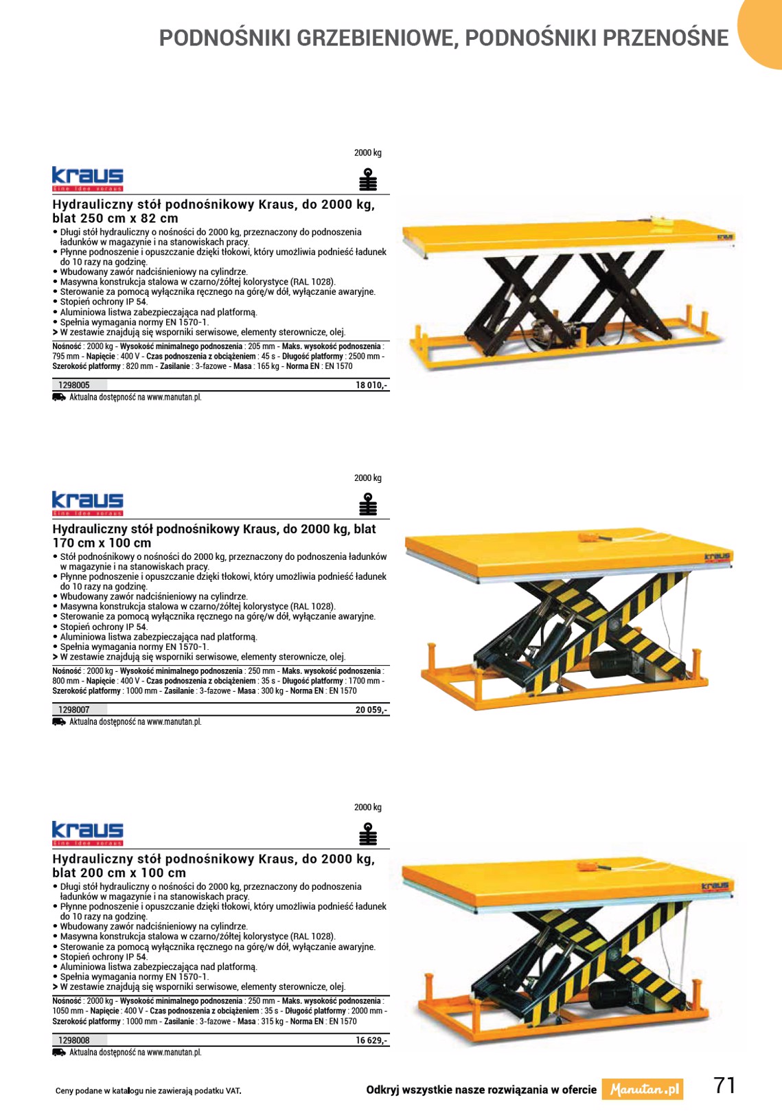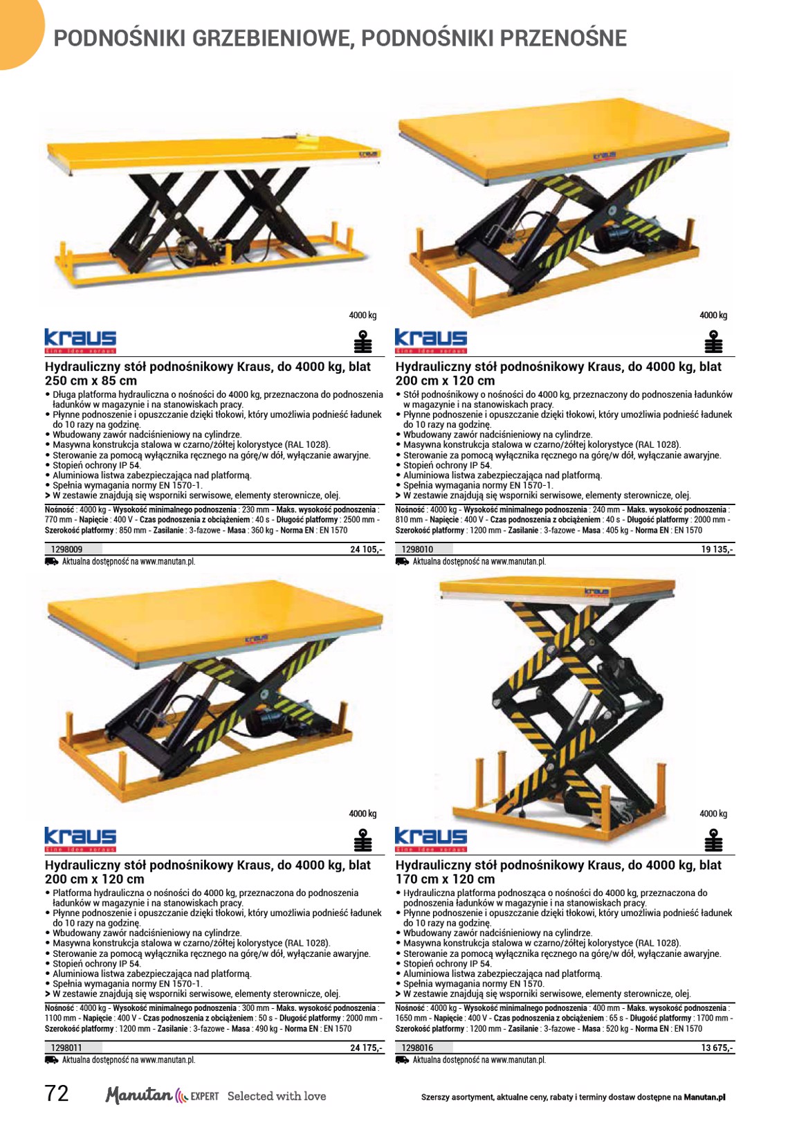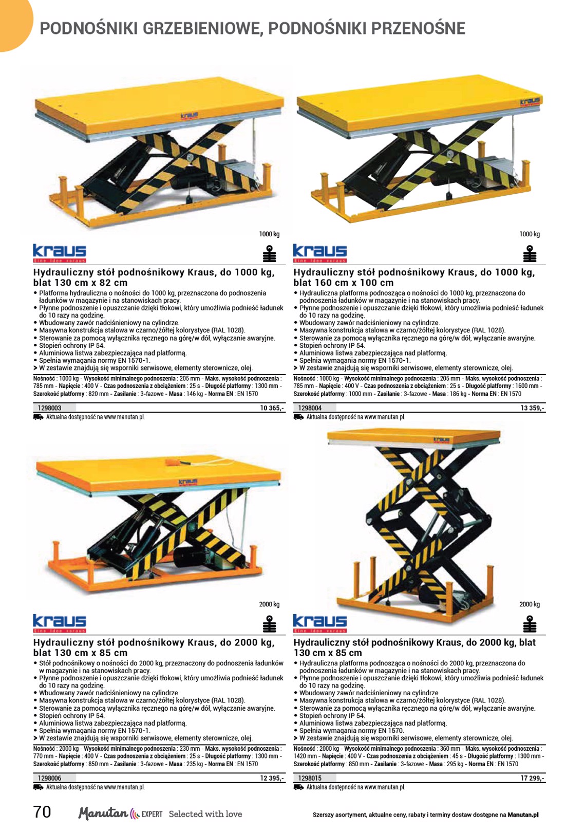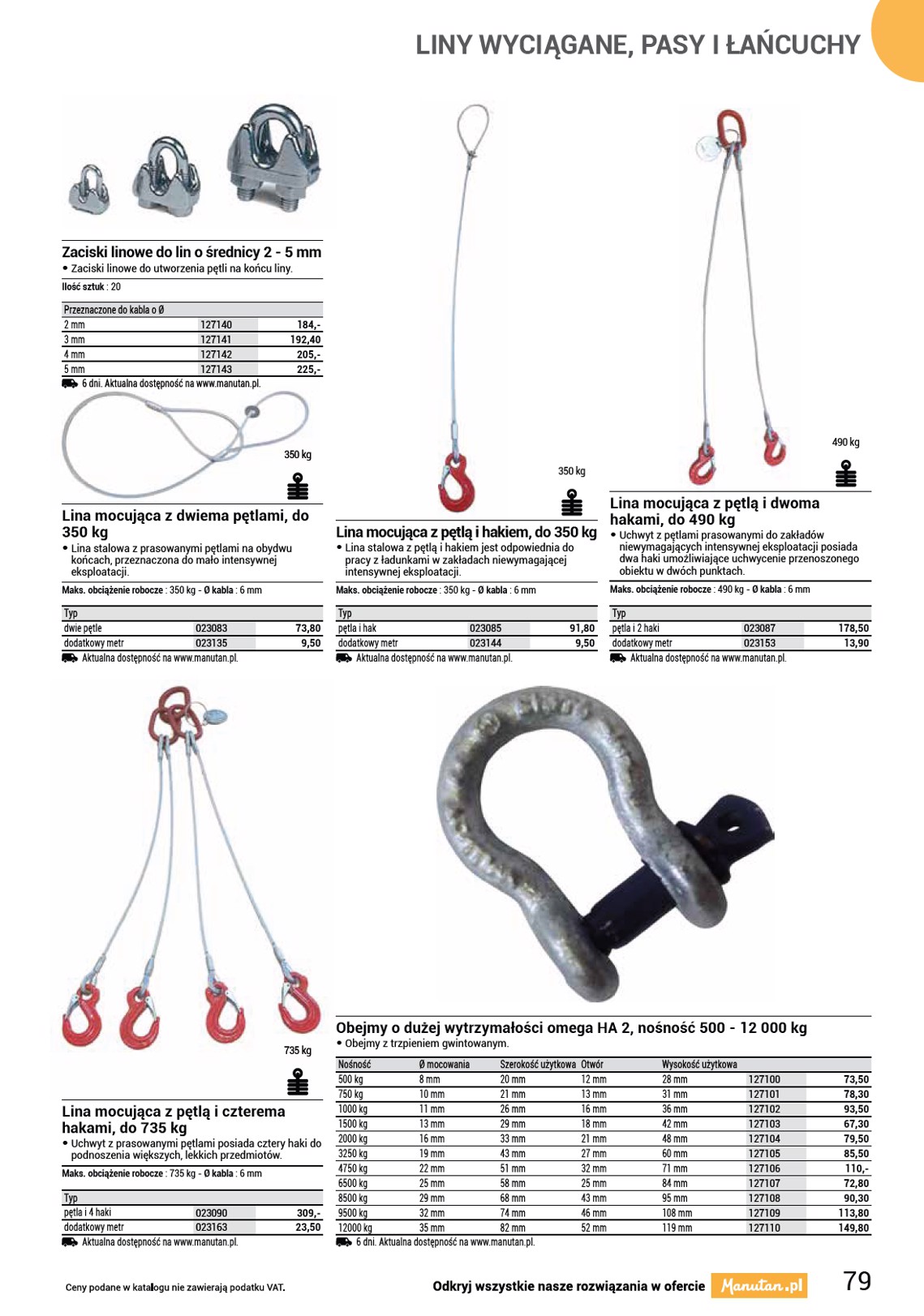 WCIĄGNIKI 200 kg 400 kg Elektryczna wciągarka linowa, do 200 kg • Elektryczna wciągarka linowa do podnoszenia i opuszczania ładunków do 200 kg z bloczkiem. • Płyta nawijarki wykonana z blachy stalowej wykończonej lakierem proszkowym, blok silnika i skrzynia przekładniowa odlane z aluminium i zabezpieczone osłoną o stopniu ochrony IP54. • Silnik wciągnika linowego o mocy 450 W. Nośność : 200 kg - Przeznaczone do łańcucha o Ø : 3 mm - Min. prędkość podnoszenia : 5 m/min - Maks. prędkość podnoszenia : 10 m/min - Moc silnika przy przesuwie : 450 W - Szerokość całkowita : 135 mm - Głębokość całkowita : 330 mm - Wysokość całkowita : 220 mm 714003 2 dni. Aktualna dostępność na www.manutan.pl. 579,- Elektryczna wciągarka linowa, do 400 kg • Elektryczna wciągarka linowa do podnoszenia i opuszczania ładunków do 400 kg z bloczkiem. • Płyta nawijarki wykonana z blachy stalowej wykończonej lakierem proszkowym, blok silnika i skrzynia przekładniowa odlane z aluminium i zabezpieczone osłoną o stopniu ochrony IP54. • Silnik wciągnika linowego o mocy 780 W. Nośność : 400 kg - Przeznaczone do łańcucha o Ø : 3,8 mm - Min. prędkość podnoszenia : 5 m/min - Maks. prędkość podnoszenia : 10 m/min - Moc silnika przy przesuwie : 780 W - Szerokość całkowita : 145 mm - Głębokość całkowita : 380 mm - Wysokość całkowita : 250 mm 714004 2 dni. Aktualna dostępność na www.manutan.pl. 829,- 600 kg 990 kg Elektryczna wciągarka linowa, do 600 kg • Elektryczna wciągarka linowa do podnoszenia i opuszczania ładunków do 600 kg z bloczkiem. • Płyta nawijarki wykonana z blachy stalowej wykończonej lakierem proszkowym, blok silnika i skrzynia przekładniowa odlane z aluminium i zabezpieczone osłoną o stopniu ochrony IP54 • Silnik wciągnika linowego o mocy 1050 W. Nośność : 600 kg - Przeznaczone do łańcucha o Ø : 4,5 mm - Min. prędkość podnoszenia : 5 m/min - Maks. prędkość podnoszenia : 10 m/min - Moc silnika przy przesuwie : 1050 W - Szerokość całkowita : 145 mm - Głębokość całkowita : 390 mm - Wysokość całkowita : 250 mm 714022 2 dni. Aktualna dostępność na www.manutan.pl. 929,- 600 kg Elektryczna wciągarka linowa, do 990 kg • Elektryczna wciągarka linowa do podnoszenia i opuszczania ładunków do 990 kg z bloczkiem. • Płyta nawijarki wykonana z blachy stalowej wykończonej lakierem proszkowym, blok silnika i skrzynia przekładniowa odlane z aluminium i zabezpieczone osłoną o stopniu ochrony IP 54. • Silnik wciągnika linowego o mocy 1 600 W. Nośność : 990 kg - Przeznaczone do łańcucha o Ø : 5,5 mm - Min. prędkość podnoszenia : 5 m/min - Maks. prędkość podnoszenia : 10 m/min - Moc silnika przy przesuwie : 1600 W - Szerokość całkowita : 250 mm - Głębokość całkowita : 550 mm - Wysokość całkowita : 310 mm 714096 2 dni. Aktualna dostępność na www.manutan.pl. 1 669,- Ramię obrotowe do elektrycznej wciągarki linowej, do 600 kg • Odchylane ramię do elektrycznych wciągarek linowych o nośności do 600 kg. • Montowane do rurek o średnicy 50 mm (1 1/2). • Wewnętrzna i zewnętrzna obejma mocująca. • Kąt obrotu ramienia 75°. Wysokość : 430 mm - Masa : 32 kg - Nadaje się do : 714003, 714004, 714022 714005 2 dni. Aktualna dostępność na www.manutan.pl. 300,- 75
