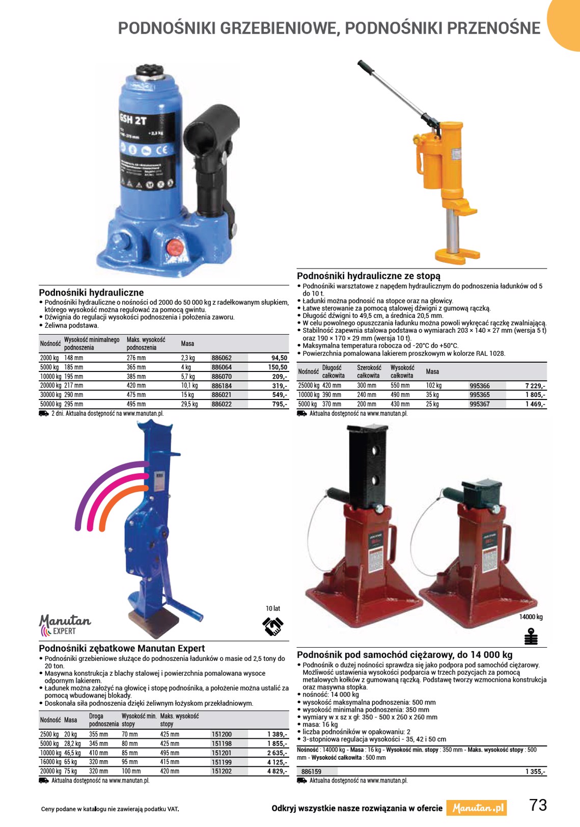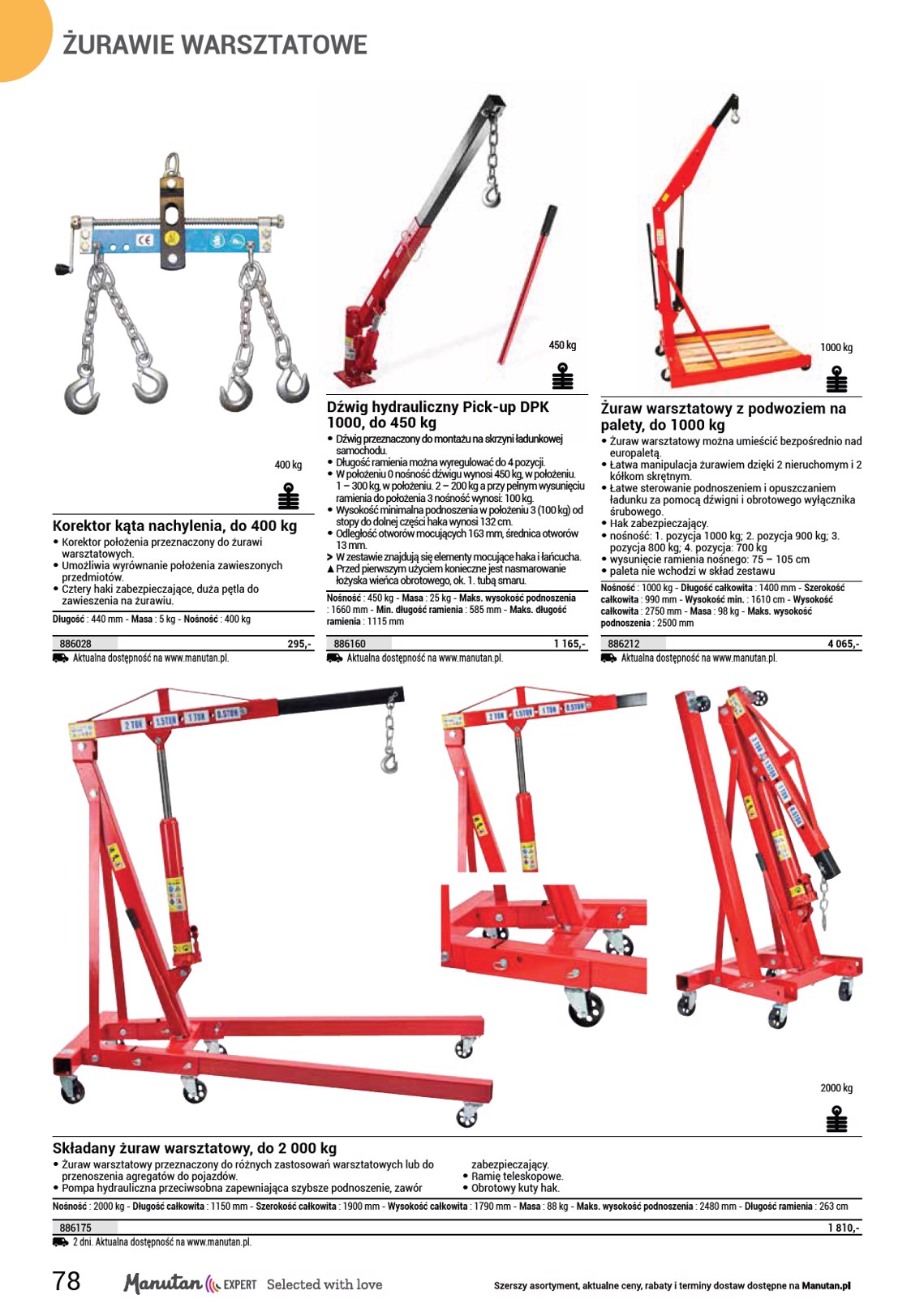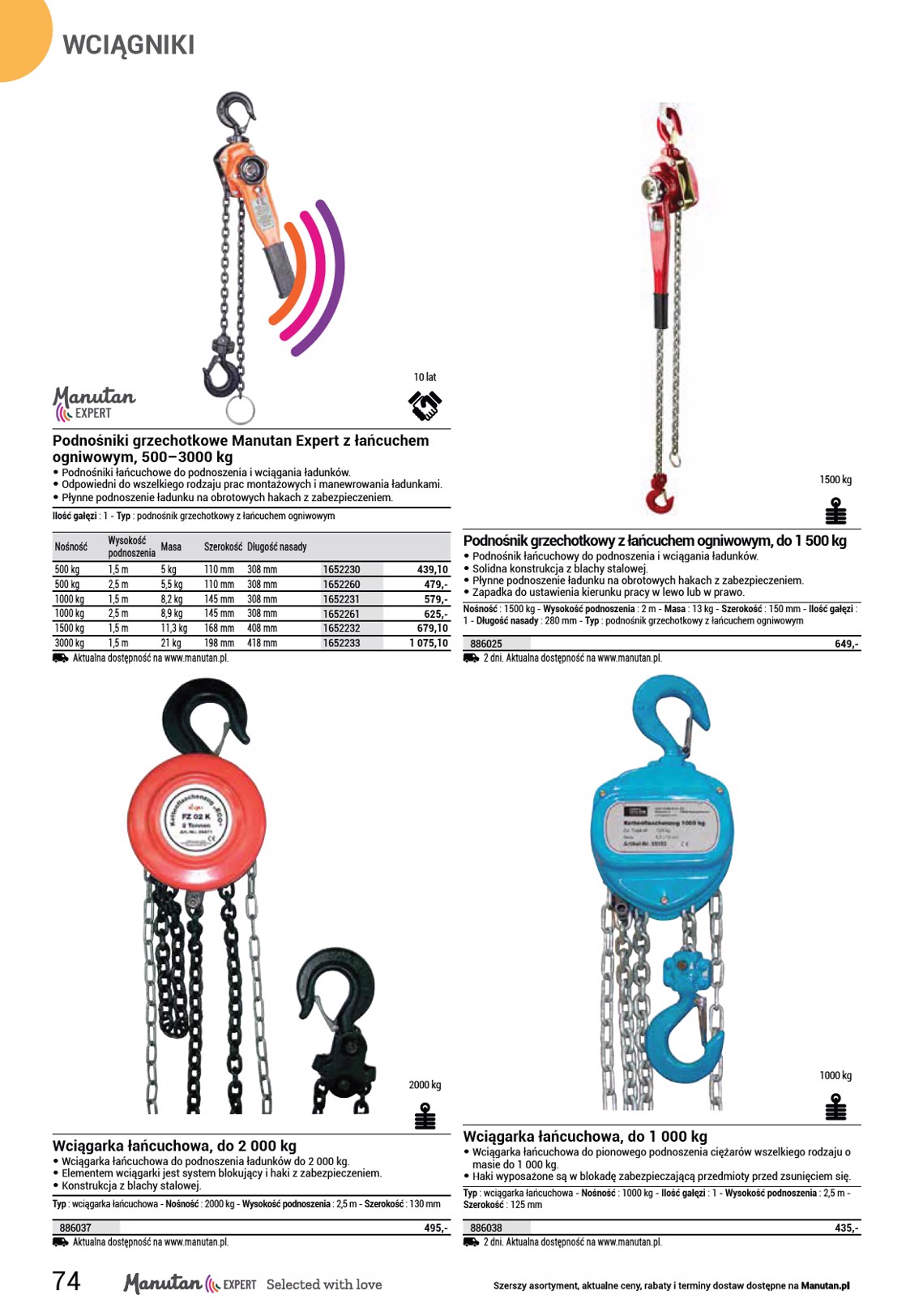 WCIĄGNIKI 10 lat Podnośniki grzechotkowe Manutan Expert z łańcuchem ogniwowym, 500–3000 kg • Podnośniki łańcuchowe do podnoszenia i wciągania ładunków. • Odpowiedni do wszelkiego rodzaju prac montażowych i manewrowania ładunkami. • Płynne podnoszenie ładunku na obrotowych hakach z zabezpieczeniem. Ilość gałęzi : 1 - Typ : podnośnik grzechotkowy z łańcuchem ogniwowym Nośność Wysokość Masa podnoszenia Szerokość Długość nasady 500 kg 1,5 m 5 kg 110 mm 308 mm 500 kg 2,5 m 5,5 kg 110 mm 308 mm 1000 kg 1,5 m 8,2 kg 145 mm 308 mm 1000 kg 2,5 m 8,9 kg 145 mm 308 mm 1500 kg 1,5 m 11,3 kg 168 mm 408 mm 3000 kg 1,5 m 21 kg 198 mm 418 mm Aktualna dostępność na www.manutan.pl. 1652230 1652260 1652231 1652261 1652232 1652233 439,10 479,- 579,- 625,- 679,10 1 075,10 1500 kg Podnośnik grzechotkowy z łańcuchem ogniwowym, do 1 500 kg • Podnośnik łańcuchowy do podnoszenia i wciągania ładunków. • Solidna konstrukcja z blachy stalowej. • Płynne podnoszenie ładunku na obrotowych hakach z zabezpieczeniem. • Zapadka do ustawienia kierunku pracy w lewo lub w prawo. Nośność : 1500 kg - Wysokość podnoszenia : 2 m - Masa : 13 kg - Szerokość : 150 mm - Ilość gałęzi : 1 - Długość nasady : 280 mm - Typ : podnośnik grzechotkowy z łańcuchem ogniwowym 886025 2 dni. Aktualna dostępność na www.manutan.pl. 649,- 2000 kg 1000 kg Wciągarka łańcuchowa, do 2 000 kg • Wciągarka łańcuchowa do podnoszenia ładunków do 2 000 kg. • Elementem wciągarki jest system blokujący i haki z zabezpieczeniem. • Konstrukcja z blachy stalowej. Typ : wciągarka łańcuchowa - Nośność : 2000 kg - Wysokość podnoszenia : 2,5 m - Szerokość : 130 mm 886037 Aktualna dostępność na www.manutan.pl. 495,- Wciągarka łańcuchowa, do 1 000 kg • Wciągarka łańcuchowa do pionowego podnoszenia ciężarów wszelkiego rodzaju o masie do 1 000 kg. • Haki wyposażone są w blokadę zabezpieczającą przedmioty przed zsunięciem się. Typ : wciągarka łańcuchowa - Nośność : 1000 kg - Ilość gałęzi : 1 - Wysokość podnoszenia : 2,5 m - Szerokość : 125 mm 886038 2 dni. Aktualna dostępność na www.manutan.pl. 435,- 74