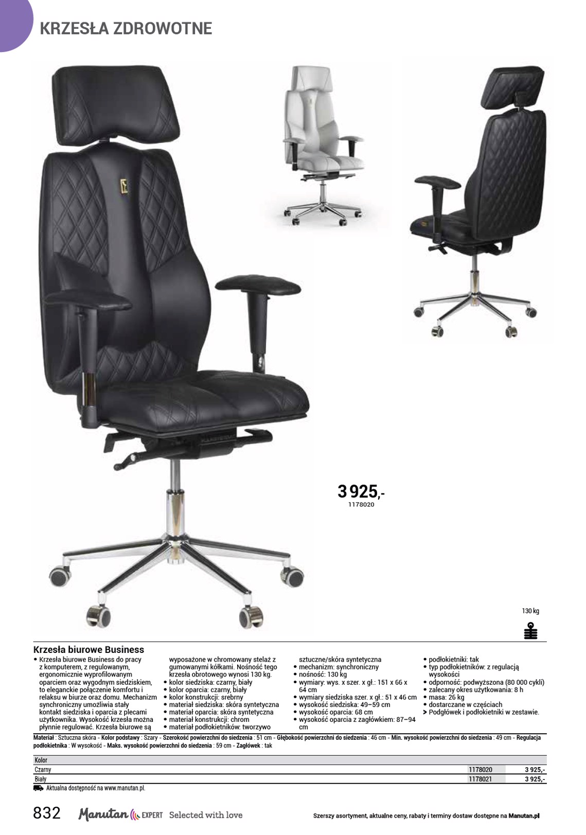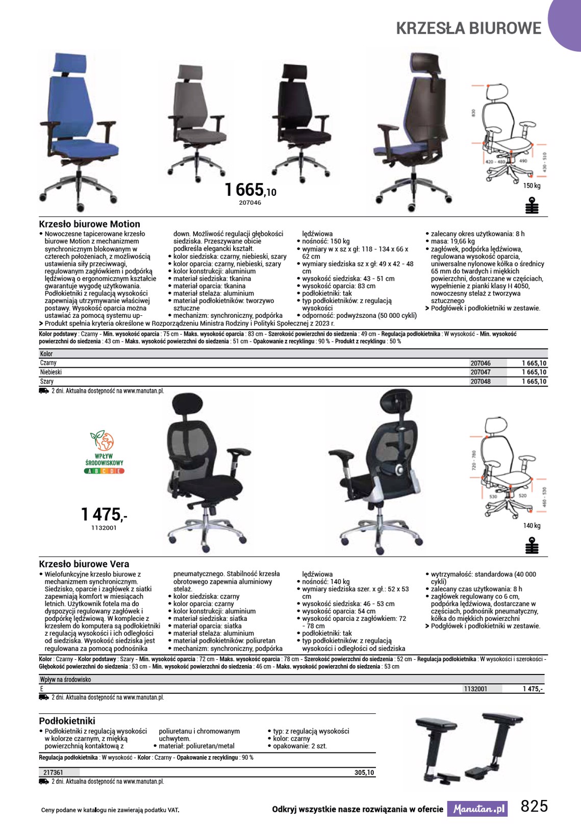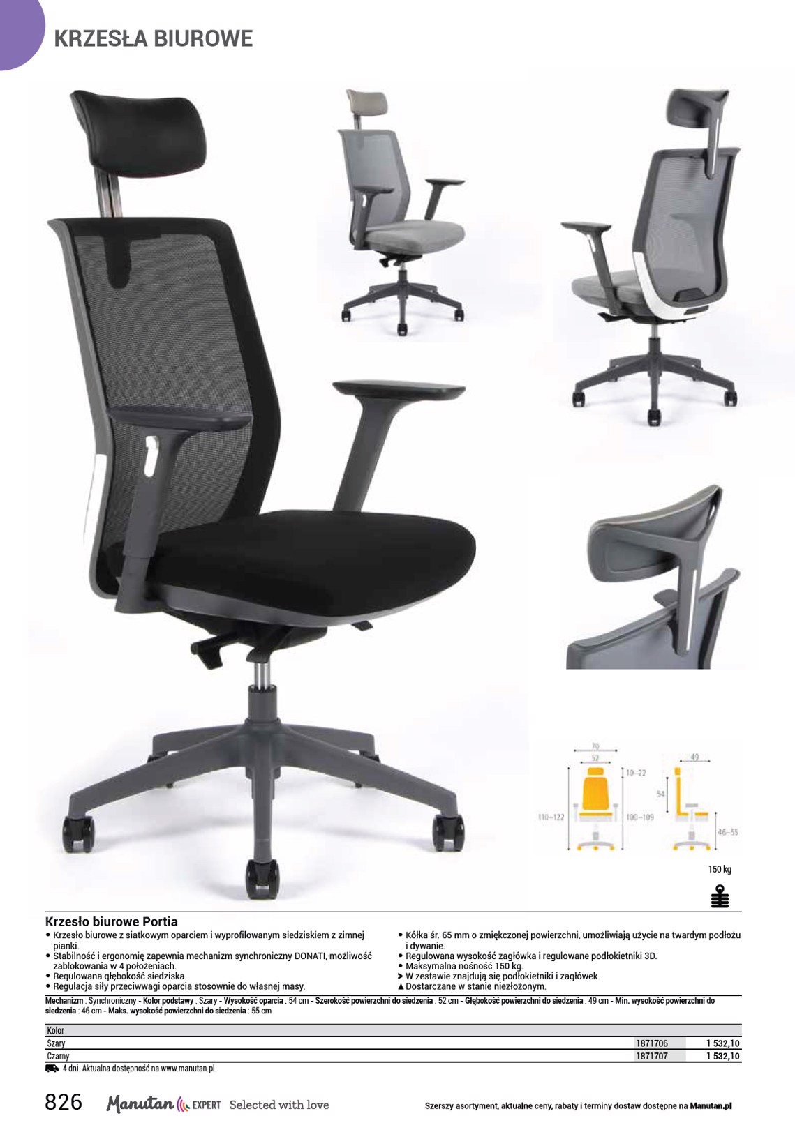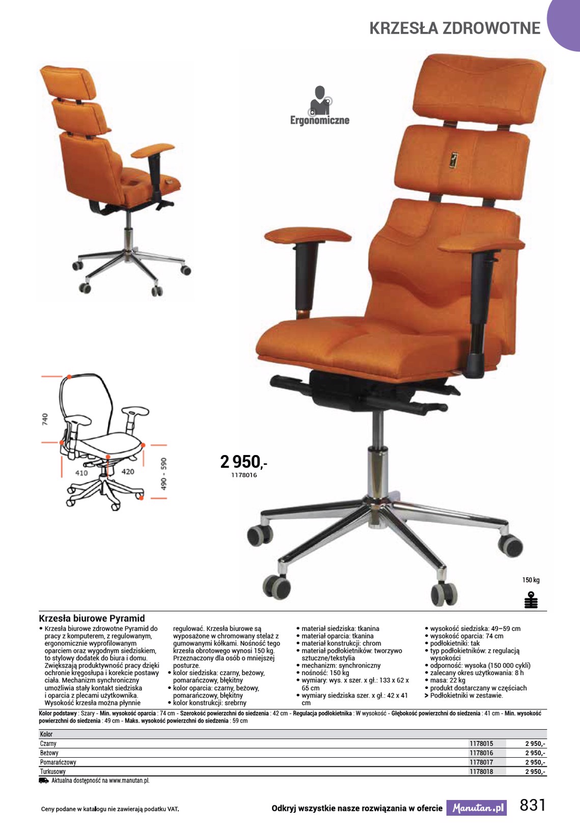 KRZESŁA ZDROWOTNE 2 950 ,- 1178016 150 kg Krzesła biurowe Pyramid • Krzesła biurowe zdrowotne Pyramid do pracy z komputerem, z regulowanym, ergonomicznie wyprofilowanym oparciem oraz wygodnym siedziskiem, to stylowy dodatek do biura i domu. Zwiększają produktywność pracy dzięki ochronie kręgosłupa i korekcie postawy ciała. Mechanizm synchroniczny umożliwia stały kontakt siedziska i oparcia z plecami użytkownika. Wysokość krzesła można płynnie regulować. Krzesła biurowe są wyposażone w chromowany stelaż z gumowanymi kółkami. Nośność tego krzesła obrotowego wynosi 150 kg. Przeznaczony dla osób o mniejszej posturze. • kolor siedziska: czarny, beżowy, pomarańczowy, błękitny • kolor oparcia: czarny, beżowy, pomarańczowy, błękitny • kolor konstrukcji: srebrny • materiał siedziska: tkanina • materiał oparcia: tkanina • materiał konstrukcji: chrom • materiał podłokietników: tworzywo sztuczne/tekstylia • mechanizm: synchroniczny • nośność: 150 kg • wymiary: wys. x szer. x gł.: 133 x 62 x 65 cm • wymiary siedziska szer. x gł.: 42 x 41 cm • wysokość siedziska: 49–59 cm • wysokość oparcia: 74 cm • podłokietniki: tak • typ podłokietników: z regulacją wysokości • odporność: wysoka (150 000 cykli) • zalecany okres użytkowania: 8 h • masa: 22 kg • produkt dostarczany w częściach OO Podłokietniki w zestawie. Kolor podstawy : Szary - Min. wysokość oparcia : 74 cm - Szerokość powierzchni do siedzenia : 42 cm - Regulacja podłokietnika : W wysokość - Głębokość powierzchni do siedzenia : 41 cm - Min. wysokość powierzchni do siedzenia : 49 cm - Maks. wysokość powierzchni do siedzenia : 59 cm Kolor Czarny Beżowy Pomarańczowy Turkusowy Aktualna dostępność na www.manutan.pl. 1178015 1178016 1178017 1178018 2 950,- 2 950,- 2 950,- 2 950,- 831