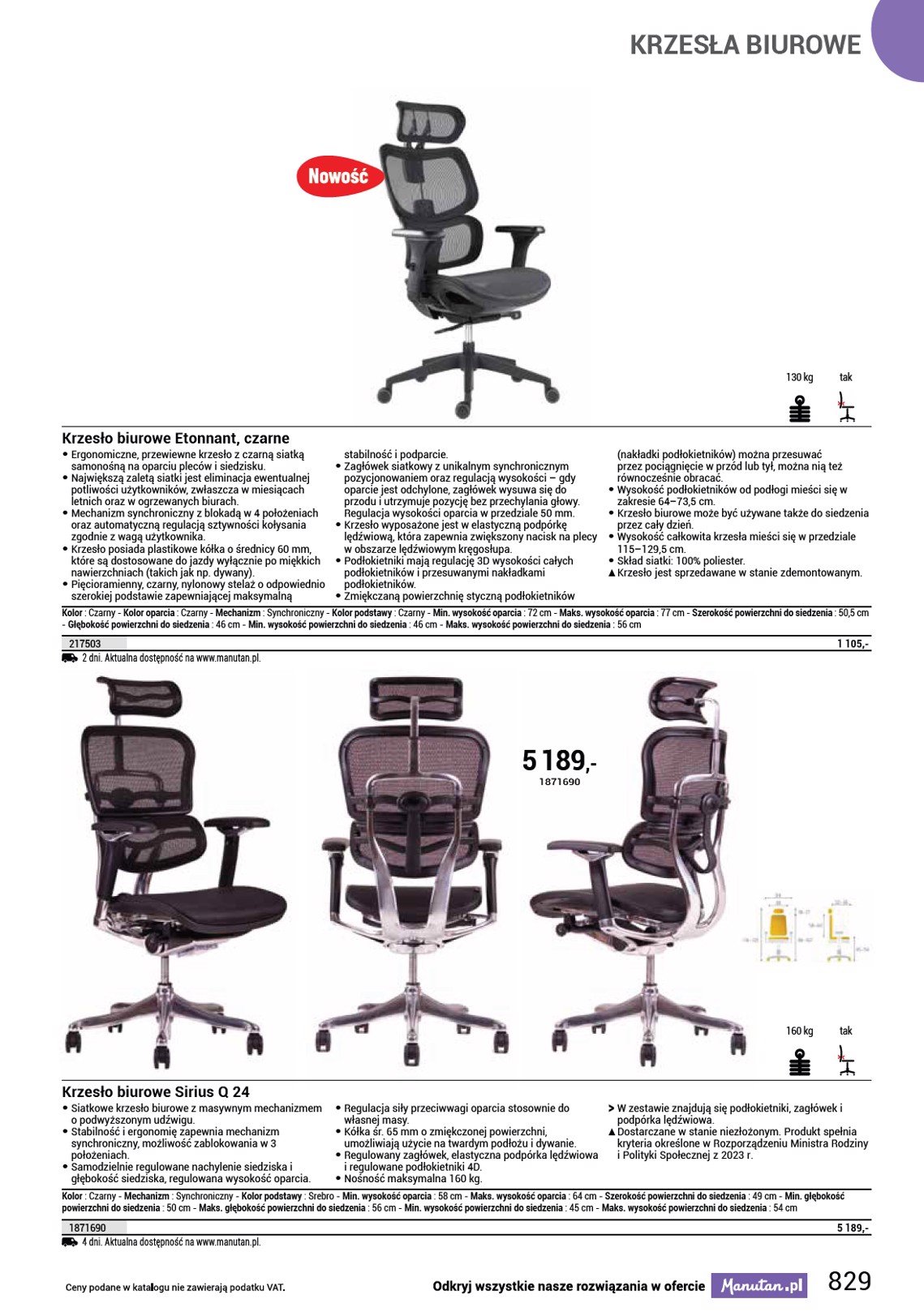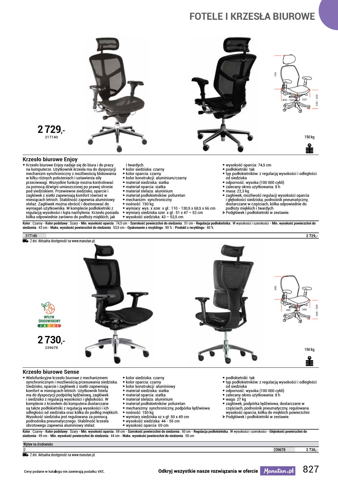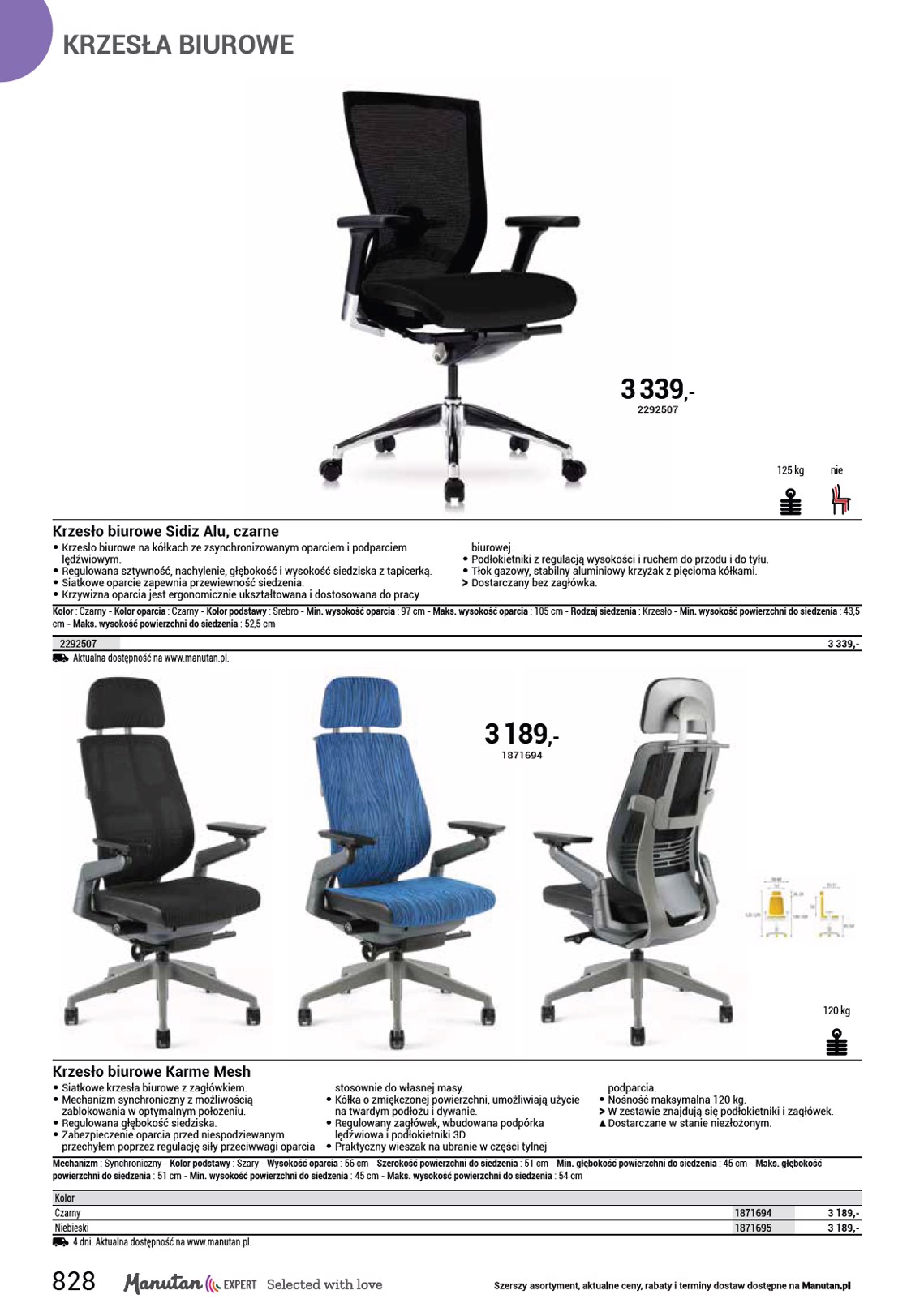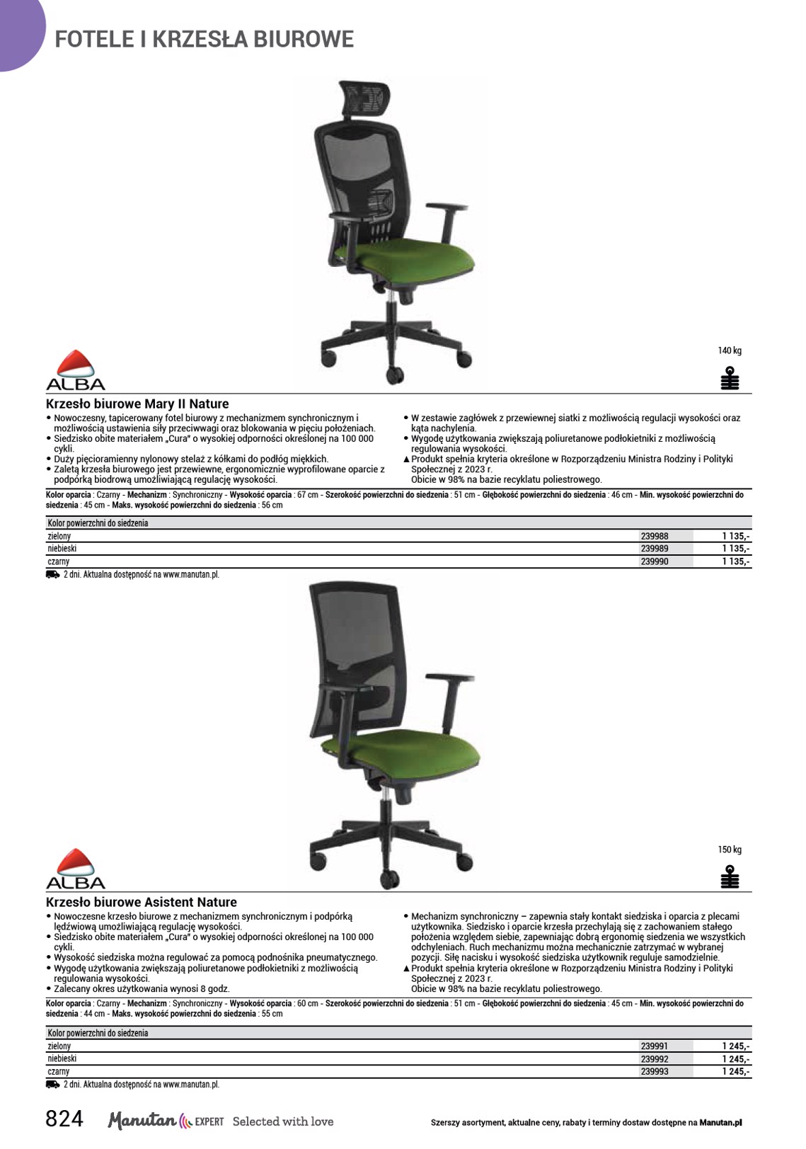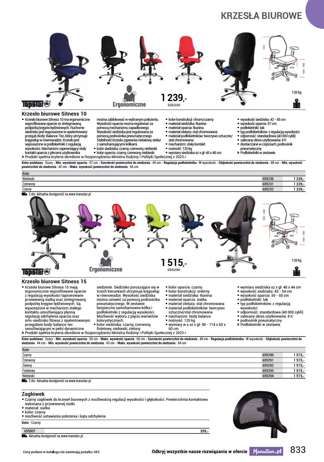 KRZESŁA ZDROWOTNE 2 950 ,- 1178016 150 kg Krzesła biurowe Pyramid • Krzesła biurowe zdrowotne Pyramid do pracy z komputerem, z regulowanym, ergonomicznie wyprofilowanym oparciem oraz wygodnym siedziskiem, to stylowy dodatek do biura i domu. Zwiększają produktywność pracy dzięki ochronie kręgosłupa i korekcie postawy ciała. Mechanizm synchroniczny umożliwia stały kontakt siedziska i oparcia z plecami użytkownika. Wysokość krzesła można płynnie regulować. Krzesła biurowe są wyposażone w chromowany stelaż z gumowanymi kółkami. Nośność tego krzesła obrotowego wynosi 150 kg. Przeznaczony dla osób o mniejszej posturze. • kolor siedziska: czarny, beżowy, pomarańczowy, błękitny • kolor oparcia: czarny, beżowy, pomarańczowy, błękitny • kolor konstrukcji: srebrny • materiał siedziska: tkanina • materiał oparcia: tkanina • materiał konstrukcji: chrom • materiał podłokietników: tworzywo sztuczne/tekstylia • mechanizm: synchroniczny • nośność: 150 kg • wymiary: wys. x szer. x gł.: 133 x 62 x 65 cm • wymiary siedziska szer. x gł.: 42 x 41 cm • wysokość siedziska: 49–59 cm • wysokość oparcia: 74 cm • podłokietniki: tak • typ podłokietników: z regulacją wysokości • odporność: wysoka (150 000 cykli) • zalecany okres użytkowania: 8 h • masa: 22 kg • produkt dostarczany w częściach OO Podłokietniki w zestawie. Kolor podstawy : Szary - Min. wysokość oparcia : 74 cm - Szerokość powierzchni do siedzenia : 42 cm - Regulacja podłokietnika : W wysokość - Głębokość powierzchni do siedzenia : 41 cm - Min. wysokość powierzchni do siedzenia : 49 cm - Maks. wysokość powierzchni do siedzenia : 59 cm Kolor Czarny Beżowy Pomarańczowy Turkusowy Aktualna dostępność na www.manutan.pl. 1178015 1178016 1178017 1178018 2 950,- 2 950,- 2 950,- 2 950,- 831