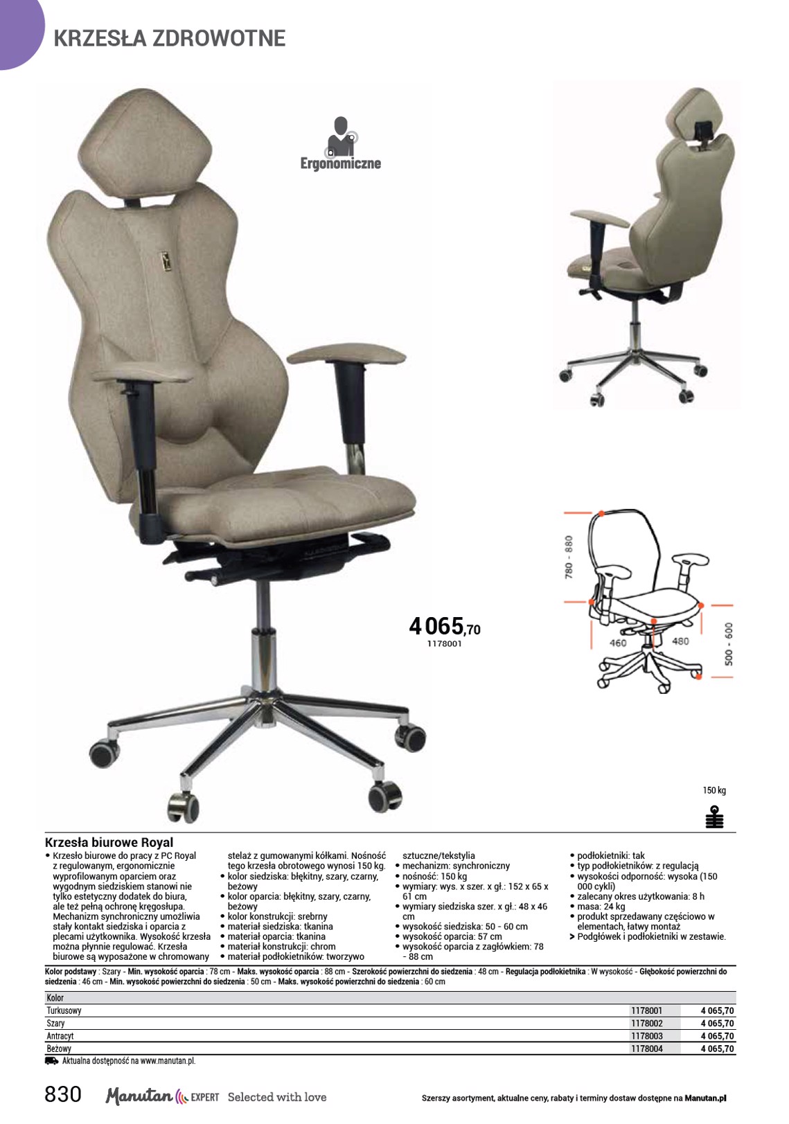 KRZESŁA ZDROWOTNE 4 065 ,70 1178001 150 kg Krzesła biurowe Royal • Krzesło biurowe do pracy z PC Royal z regulowanym, ergonomicznie wyprofilowanym oparciem oraz wygodnym siedziskiem stanowi nie tylko estetyczny dodatek do biura, ale też pełną ochronę kręgosłupa. Mechanizm synchroniczny umożliwia stały kontakt siedziska i oparcia z plecami użytkownika. Wysokość krzesła można płynnie regulować. Krzesła biurowe są wyposażone w chromowany stelaż z gumowanymi kółkami. Nośność tego krzesła obrotowego wynosi 150 kg. • kolor siedziska: błękitny, szary, czarny, beżowy • kolor oparcia: błękitny, szary, czarny, beżowy • kolor konstrukcji: srebrny • materiał siedziska: tkanina • materiał oparcia: tkanina • materiał konstrukcji: chrom • materiał podłokietników: tworzywo sztuczne/tekstylia • mechanizm: synchroniczny • nośność: 150 kg • wymiary: wys. x szer. x gł.: 152 x 65 x 61 cm • wymiary siedziska szer. x gł.: 48 x 46 cm • wysokość siedziska: 50 - 60 cm • wysokość oparcia: 57 cm • wysokość oparcia z zagłówkiem: 78 - 88 cm • podłokietniki: tak • typ podłokietników: z regulacją • wysokości odporność: wysoka (150 000 cykli) • zalecany okres użytkowania: 8 h • masa: 24 kg • produkt sprzedawany częściowo w elementach, łatwy montaż OO Podgłówek i podłokietniki w zestawie. Kolor podstawy : Szary - Min. wysokość oparcia : 78 cm - Maks. wysokość oparcia : 88 cm - Szerokość powierzchni do siedzenia : 48 cm - Regulacja podłokietnika : W wysokość - Głębokość powierzchni do siedzenia : 46 cm - Min. wysokość powierzchni do siedzenia : 50 cm - Maks. wysokość powierzchni do siedzenia : 60 cm Kolor Turkusowy Szary Antracyt Beżowy Aktualna dostępność na www.manutan.pl. 1178001 1178002 1178003 1178004 4 065,70 4 065,70 4 065,70 4 065,70 830