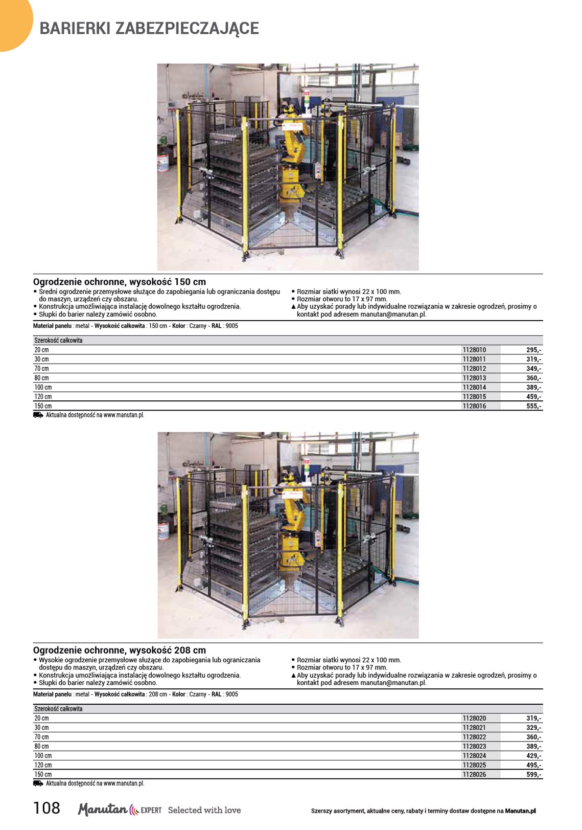 BARIERKI ZABEZPIECZAJĄCE Ogrodzenie ochronne, wysokość 150 cm • Średni ogrodzenie przemysłowe służące do zapobiegania lub ograniczania dostępu do maszyn, urządzeń czy obszaru. • Konstrukcja umożliwiająca instalację dowolnego kształtu ogrodzenia. • Słupki do barier należy zamówić osobno. Materiał panelu : metal - Wysokość całkowita : 150 cm - Kolor : Czarny - RAL : 9005 Szerokość całkowita 20 cm 30 cm 70 cm 80 cm 100 cm 120 cm 150 cm Aktualna dostępność na www.manutan.pl. • Rozmiar siatki wynosi 22 x 100 mm. • Rozmiar otworu to 17 x 97 mm. SS Aby uzyskać porady lub indywidualne rozwiązania w zakresie ogrodzeń, prosimy o kontakt pod adresem manutan@manutan.pl. 1128010 1128011 1128012 1128013 1128014 1128015 1128016 295,- 319,- 349,- 360,- 389,- 459,- 555,- Ogrodzenie ochronne, wysokość 208 cm • Wysokie ogrodzenie przemysłowe służące do zapobiegania lub ograniczania dostępu do maszyn, urządzeń czy obszaru. • Konstrukcja umożliwiająca instalację dowolnego kształtu ogrodzenia. • Słupki do barier należy zamówić osobno. Materiał panelu : metal - Wysokość całkowita : 208 cm - Kolor : Czarny - RAL : 9005 Szerokość całkowita 20 cm 30 cm 70 cm 80 cm 100 cm 120 cm 150 cm Aktualna dostępność na www.manutan.pl. 108 • Rozmiar siatki wynosi 22 x 100 mm. • Rozmiar otworu to 17 x 97 mm. SS Aby uzyskać porady lub indywidualne rozwiązania w zakresie ogrodzeń, prosimy o kontakt pod adresem manutan@manutan.pl. 1128020 1128021 1128022 1128023 1128024 1128025 1128026 319,- 329,- 360,- 389,- 429,- 495,- 599,-