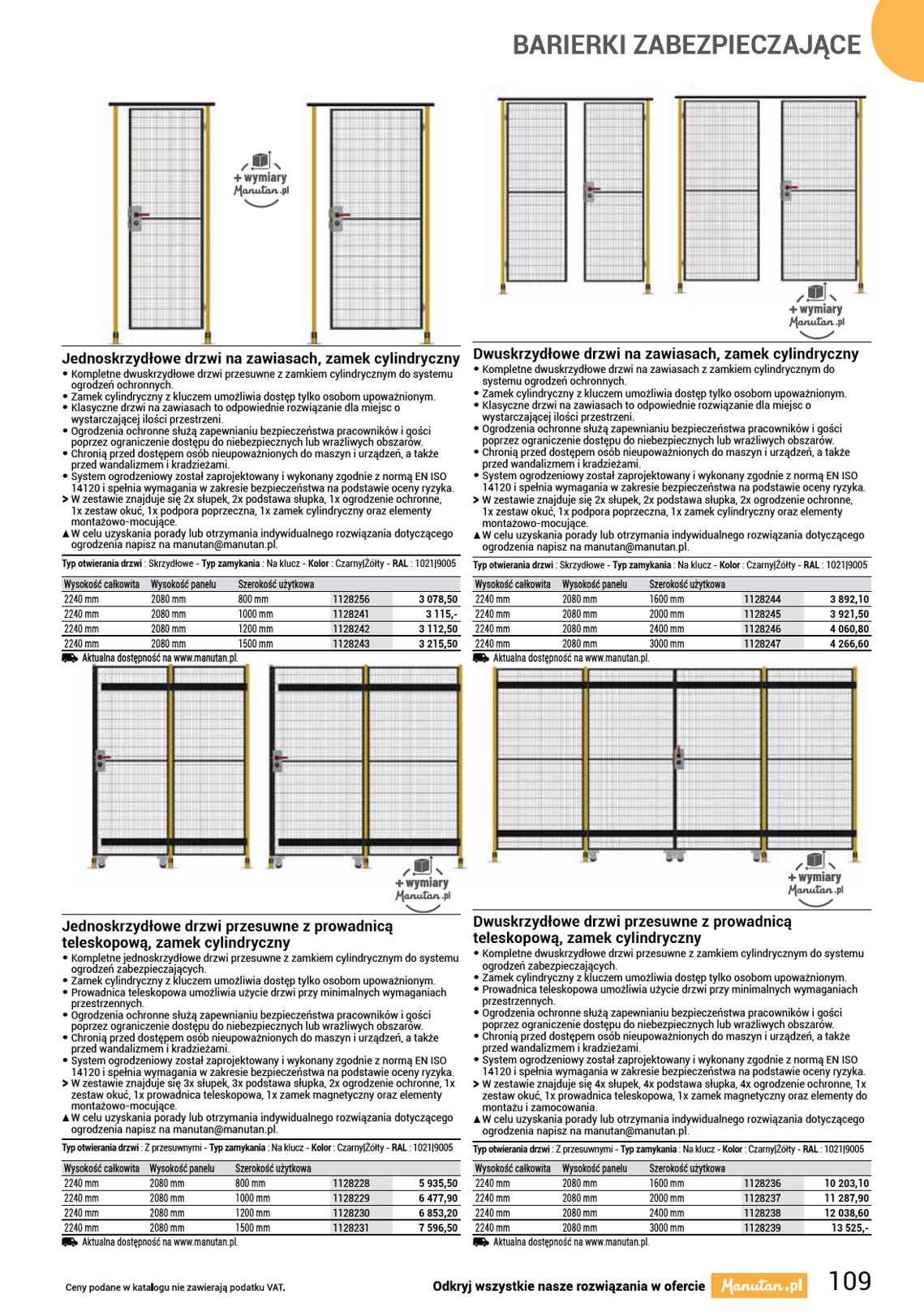 BARIERKI ZABEZPIECZAJĄCE Jednoskrzydłowe drzwi na zawiasach, zamek cylindryczny • Kompletne dwuskrzydłowe drzwi przesuwne z zamkiem cylindrycznym do systemu ogrodzeń ochronnych. • Zamek cylindryczny z kluczem umożliwia dostęp tylko osobom upoważnionym. • Klasyczne drzwi na zawiasach to odpowiednie rozwiązanie dla miejsc o wystarczającej ilości przestrzeni. • Ogrodzenia ochronne służą zapewnianiu bezpieczeństwa pracowników i gości poprzez ograniczenie dostępu do niebezpiecznych lub wrażliwych obszarów. • Chronią przed dostępem osób nieupoważnionych do maszyn i urządzeń, a także przed wandalizmem i kradzieżami. • System ogrodzeniowy został zaprojektowany i wykonany zgodnie z normą EN ISO 14120 i spełnia wymagania w zakresie bezpieczeństwa na podstawie oceny ryzyka. OO W zestawie znajduje się 2x słupek, 2x podstawa słupka, 1x ogrodzenie ochronne, 1x zestaw okuć, 1x podpora poprzeczna, 1x zamek cylindryczny oraz elementy montażowo-mocujące. SS W celu uzyskania porady lub otrzymania indywidualnego rozwiązania dotyczącego ogrodzenia napisz na manutan@manutan.pl. Typ otwierania drzwi : Skrzydłowe - Typ zamykania : Na klucz - Kolor : Czarny|Żółty - RAL : 1021|9005 Wysokość całkowita Wysokość panelu Szerokość użytkowa 2240 mm 2080 mm 800 mm 2240 mm 2080 mm 1000 mm 2240 mm 2080 mm 1200 mm 2240 mm 2080 mm 1500 mm Aktualna dostępność na www.manutan.pl. 1128256 1128241 1128242 1128243 3 078,50 3 115,- 3 112,50 3 215,50 Dwuskrzydłowe drzwi na zawiasach, zamek cylindryczny • Kompletne dwuskrzydłowe drzwi na zawiasach z zamkiem cylindrycznym do systemu ogrodzeń ochronnych. • Zamek cylindryczny z kluczem umożliwia dostęp tylko osobom upoważnionym. • Klasyczne drzwi na zawiasach to odpowiednie rozwiązanie dla miejsc o wystarczającej ilości przestrzeni. • Ogrodzenia ochronne służą zapewnianiu bezpieczeństwa pracowników i gości poprzez ograniczenie dostępu do niebezpiecznych lub wrażliwych obszarów. • Chronią przed dostępem osób nieupoważnionych do maszyn i urządzeń, a także przed wandalizmem i kradzieżami. • System ogrodzeniowy został zaprojektowany i wykonany zgodnie z normą EN ISO 14120 i spełnia wymagania w zakresie bezpieczeństwa na podstawie oceny ryzyka. OO W zestawie znajduje się 2x słupek, 2x podstawa słupka, 2x ogrodzenie ochronne, 1x zestaw okuć, 1x podpora poprzeczna, 1x zamek cylindryczny oraz elementy montażowo-mocujące. SS W celu uzyskania porady lub otrzymania indywidualnego rozwiązania dotyczącego ogrodzenia napisz na manutan@manutan.pl. Typ otwierania drzwi : Skrzydłowe - Typ zamykania : Na klucz - Kolor : Czarny|Żółty - RAL : 1021|9005 Wysokość całkowita Wysokość panelu Szerokość użytkowa 2240 mm 2080 mm 1600 mm 2240 mm 2080 mm 2000 mm 2240 mm 2080 mm 2400 mm 2240 mm 2080 mm 3000 mm Aktualna dostępność na www.manutan.pl. 1128244 1128245 1128246 1128247 3 892,10 3 921,50 4 060,80 4 266,60 Jednoskrzydłowe drzwi przesuwne z prowadnicą teleskopową, zamek cylindryczny • Kompletne jednoskrzydłowe drzwi przesuwne z zamkiem cylindrycznym do systemu ogrodzeń zabezpieczających. • Zamek cylindryczny z kluczem umożliwia dostęp tylko osobom upoważnionym. • Prowadnica teleskopowa umożliwia użycie drzwi przy minimalnych wymaganiach przestrzennych. • Ogrodzenia ochronne służą zapewnianiu bezpieczeństwa pracowników i gości poprzez ograniczenie dostępu do niebezpiecznych lub wrażliwych obszarów. • Chronią przed dostępem osób nieupoważnionych do maszyn i urządzeń, a także przed wandalizmem i kradzieżami. • System ogrodzeniowy został zaprojektowany i wykonany zgodnie z normą EN ISO 14120 i spełnia wymagania w zakresie bezpieczeństwa na podstawie oceny ryzyka. OO W zestawie znajduje się 3x słupek, 3x podstawa słupka, 2x ogrodzenie ochronne, 1x zestaw okuć, 1x prowadnica teleskopowa, 1x zamek magnetyczny oraz elementy montażowo-mocujące. SS W celu uzyskania porady lub otrzymania indywidualnego rozwiązania dotyczącego ogrodzenia napisz na manutan@manutan.pl. Typ otwierania drzwi : Z przesuwnymi - Typ zamykania : Na klucz - Kolor : Czarny|Żółty - RAL : 1021|9005 Wysokość całkowita Wysokość panelu Szerokość użytkowa 2240 mm 2080 mm 800 mm 2240 mm 2080 mm 1000 mm 2240 mm 2080 mm 1200 mm 2240 mm 2080 mm 1500 mm Aktualna dostępność na www.manutan.pl. 1128228 1128229 1128230 1128231 5 935,50 6 477,90 6 853,20 7 596,50 Dwuskrzydłowe drzwi przesuwne z prowadnicą teleskopową, zamek cylindryczny • Kompletne dwuskrzydłowe drzwi przesuwne z zamkiem cylindrycznym do systemu ogrodzeń zabezpieczających. • Zamek cylindryczny z kluczem umożliwia dostęp tylko osobom upoważnionym. • Prowadnica teleskopowa umożliwia użycie drzwi przy minimalnych wymaganiach przestrzennych. • Ogrodzenia ochronne służą zapewnianiu bezpieczeństwa pracowników i gości poprzez ograniczenie dostępu do niebezpiecznych lub wrażliwych obszarów. • Chronią przed dostępem osób nieupoważnionych do maszyn i urządzeń, a także przed wandalizmem i kradzieżami. • System ogrodzeniowy został zaprojektowany i wykonany zgodnie z normą EN ISO 14120 i spełnia wymagania w zakresie bezpieczeństwa na podstawie oceny ryzyka. OO W zestawie znajduje się 4x słupek, 4x podstawa słupka, 4x ogrodzenie ochronne, 1x zestaw okuć, 1x prowadnica teleskopowa, 1x zamek magnetyczny oraz elementy do montażu i zamocowania. SS W celu uzyskania porady lub otrzymania indywidualnego rozwiązania dotyczącego ogrodzenia napisz na manutan@manutan.pl. Typ otwierania drzwi : Z przesuwnymi - Typ zamykania : Na klucz - Kolor : Czarny|Żółty - RAL : 1021|9005 Wysokość całkowita Wysokość panelu Szerokość użytkowa 2240 mm 2080 mm 1600 mm 2240 mm 2080 mm 2000 mm 2240 mm 2080 mm 2400 mm 2240 mm 2080 mm 3000 mm Aktualna dostępność na www.manutan.pl. 1128236 1128237 1128238 1128239 10 203,10 11 287,90 12 038,60 13 525,- 109
