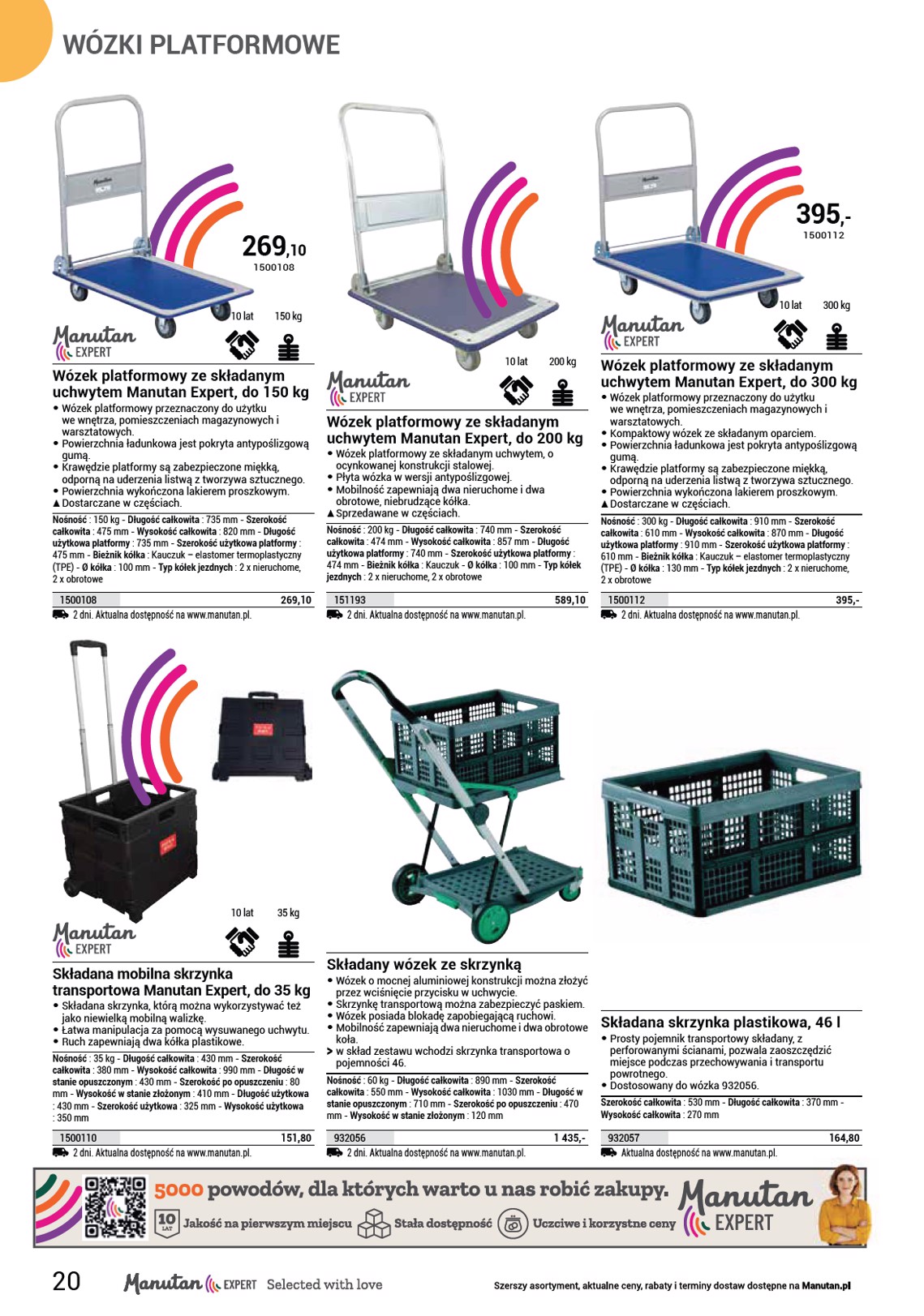 WÓZKI PLATFORMOWE 269 ,10 1500108 10 lat 150 kg 395 ,- 1500112 10 lat 300 kg Wózek platformowy ze składanym uchwytem Manutan Expert, do 150 kg • Wózek platformowy przeznaczony do użytku we wnętrza, pomieszczeniach magazynowych i warsztatowych. • Powierzchnia ładunkowa jest pokryta antypoślizgową gumą. • Krawędzie platformy są zabezpieczone miękką, odporną na uderzenia listwą z tworzywa sztucznego. • Powierzchnia wykończona lakierem proszkowym. SS Dostarczane w częściach. Nośność : 150 kg - Długość całkowita : 735 mm - Szerokość całkowita : 475 mm - Wysokość całkowita : 820 mm - Długość użytkowa platformy : 735 mm - Szerokość użytkowa platformy : 475 mm - Bieżnik kółka : Kauczuk – elastomer termoplastyczny (TPE) - Ø kółka : 100 mm - Typ kółek jezdnych : 2 x nieruchome, 2 x obrotowe 1500108 2 dni. Aktualna dostępność na www.manutan.pl. 269,10 10 lat 200 kg Wózek platformowy ze składanym uchwytem Manutan Expert, do 200 kg • Wózek platformowy ze składanym uchwytem, o ocynkowanej konstrukcji stalowej. • Płyta wózka w wersji antypoślizgowej. • Mobilność zapewniają dwa nieruchome i dwa obrotowe, niebrudzące kółka. SS Sprzedawane w częściach. Nośność : 200 kg - Długość całkowita : 740 mm - Szerokość całkowita : 474 mm - Wysokość całkowita : 857 mm - Długość użytkowa platformy : 740 mm - Szerokość użytkowa platformy : 474 mm - Bieżnik kółka : Kauczuk - Ø kółka : 100 mm - Typ kółek jezdnych : 2 x nieruchome, 2 x obrotowe 151193 2 dni. Aktualna dostępność na www.manutan.pl. 589,10 Wózek platformowy ze składanym uchwytem Manutan Expert, do 300 kg • Wózek platformowy przeznaczony do użytku we wnętrza, pomieszczeniach magazynowych i warsztatowych. • Kompaktowy wózek ze składanym oparciem. • Powierzchnia ładunkowa jest pokryta antypoślizgową gumą. • Krawędzie platformy są zabezpieczone miękką, odporną na uderzenia listwą z tworzywa sztucznego. • Powierzchnia wykończona lakierem proszkowym. SS Dostarczane w częściach. Nośność : 300 kg - Długość całkowita : 910 mm - Szerokość całkowita : 610 mm - Wysokość całkowita : 870 mm - Długość użytkowa platformy : 910 mm - Szerokość użytkowa platformy : 610 mm - Bieżnik kółka : Kauczuk – elastomer termoplastyczny (TPE) - Ø kółka : 130 mm - Typ kółek jezdnych : 2 x nieruchome, 2 x obrotowe 1500112 2 dni. Aktualna dostępność na www.manutan.pl. 395,- 10 lat 35 kg Składana mobilna skrzynka transportowa Manutan Expert, do 35 kg • Składana skrzynka, którą można wykorzystywać też jako niewielką mobilną walizkę. • Łatwa manipulacja za pomocą wysuwanego uchwytu. • Ruch zapewniają dwa kółka plastikowe. Nośność : 35 kg - Długość całkowita : 430 mm - Szerokość całkowita : 380 mm - Wysokość całkowita : 990 mm - Długość w stanie opuszczonym : 430 mm - Szerokość po opuszczeniu : 80 mm - Wysokość w stanie złożonym : 410 mm - Długość użytkowa : 430 mm - Szerokość użytkowa : 325 mm - Wysokość użytkowa : 350 mm 1500110 2 dni. Aktualna dostępność na www.manutan.pl. 151,80 Składany wózek ze skrzynką • Wózek o mocnej aluminiowej konstrukcji można złożyć przez wciśnięcie przycisku w uchwycie. • Skrzynkę transportową można zabezpieczyć paskiem. • Wózek posiada blokadę zapobiegającą ruchowi. • Mobilność zapewniają dwa nieruchome i dwa obrotowe koła. OO w skład zestawu wchodzi skrzynka transportowa o pojemności 46. Nośność : 60 kg - Długość całkowita : 890 mm - Szerokość całkowita : 550 mm - Wysokość całkowita : 1030 mm - Długość w stanie opuszczonym : 710 mm - Szerokość po opuszczeniu : 470 mm - Wysokość w stanie złożonym : 120 mm 932056 2 dni. Aktualna dostępność na www.manutan.pl. 1 435,- Składana skrzynka plastikowa, 46 l • Prosty pojemnik transportowy składany, z perforowanymi ścianami, pozwala zaoszczędzić miejsce podczas przechowywania i transportu powrotnego. • Dostosowany do wózka 932056. Szerokość całkowita : 530 mm - Długość całkowita : 370 mm - Wysokość całkowita : 270 mm 932057 Aktualna dostępność na www.manutan.pl. 164,80 20