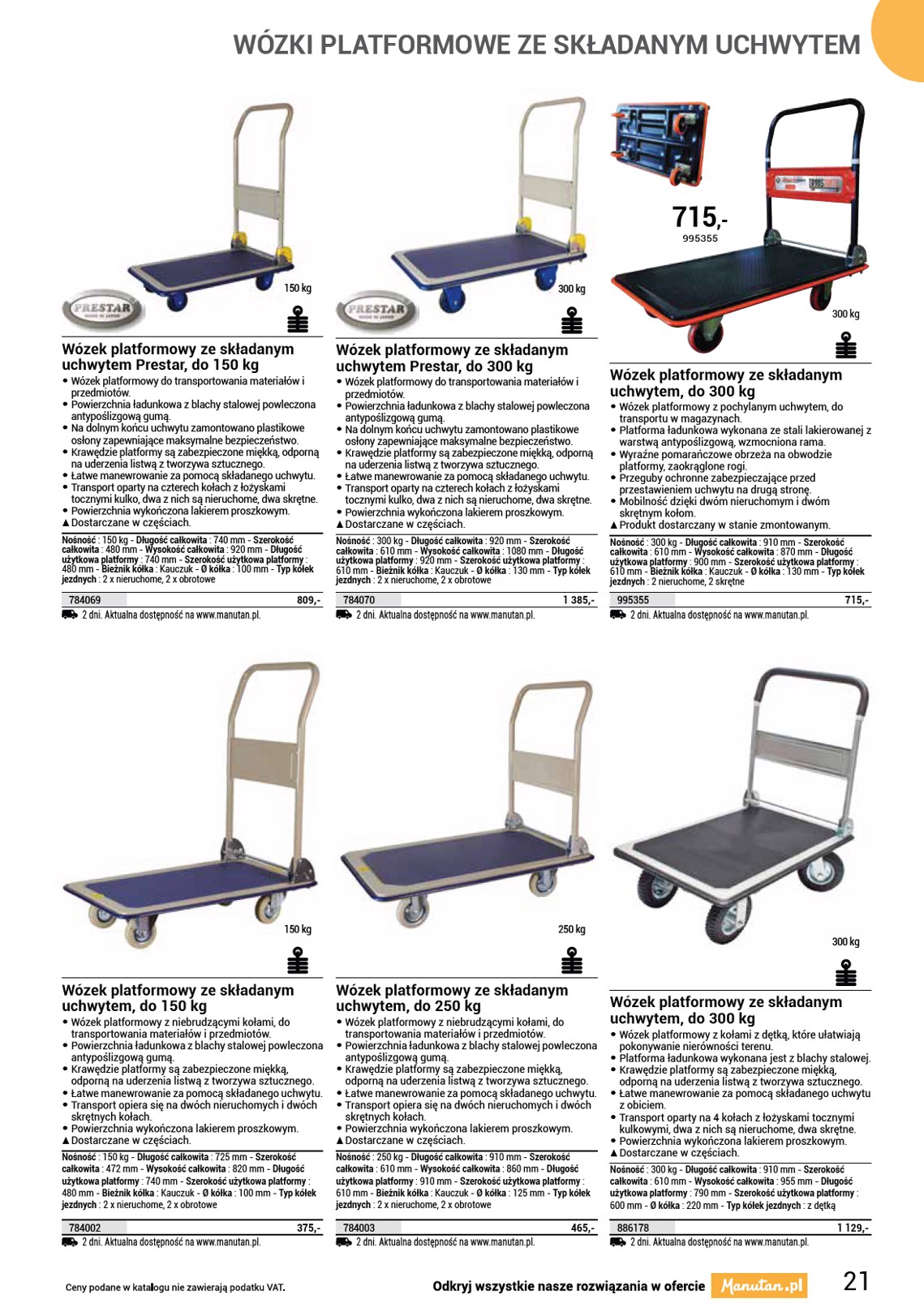 WÓZKI PLATFORMOWE ZE SKŁADANYM UCHWYTEM 715 ,- 995355 150 kg 300 kg 300 kg Wózek platformowy ze składanym uchwytem Prestar, do 150 kg • Wózek platformowy do transportowania materiałów i przedmiotów. • Powierzchnia ładunkowa z blachy stalowej powleczona antypoślizgową gumą. • Na dolnym końcu uchwytu zamontowano plastikowe osłony zapewniające maksymalne bezpieczeństwo. • Krawędzie platformy są zabezpieczone miękką, odporną na uderzenia listwą z tworzywa sztucznego. • Łatwe manewrowanie za pomocą składanego uchwytu. • Transport oparty na czterech kołach z łożyskami tocznymi kulko, dwa z nich są nieruchome, dwa skrętne. • Powierzchnia wykończona lakierem proszkowym. SS Dostarczane w częściach. Nośność : 150 kg - Długość całkowita : 740 mm - Szerokość całkowita : 480 mm - Wysokość całkowita : 920 mm - Długość użytkowa platformy : 740 mm - Szerokość użytkowa platformy : 480 mm - Bieżnik kółka : Kauczuk - Ø kółka : 100 mm - Typ kółek jezdnych : 2 x nieruchome, 2 x obrotowe 784069 2 dni. Aktualna dostępność na www.manutan.pl. 809,- Wózek platformowy ze składanym uchwytem Prestar, do 300 kg • Wózek platformowy do transportowania materiałów i przedmiotów. • Powierzchnia ładunkowa z blachy stalowej powleczona antypoślizgową gumą. • Na dolnym końcu uchwytu zamontowano plastikowe osłony zapewniające maksymalne bezpieczeństwo. • Krawędzie platformy są zabezpieczone miękką, odporną na uderzenia listwą z tworzywa sztucznego. • Łatwe manewrowanie za pomocą składanego uchwytu. • Transport oparty na czterech kołach z łożyskami tocznymi kulko, dwa z nich są nieruchome, dwa skrętne. • Powierzchnia wykończona lakierem proszkowym. SS Dostarczane w częściach. Nośność : 300 kg - Długość całkowita : 920 mm - Szerokość całkowita : 610 mm - Wysokość całkowita : 1080 mm - Długość użytkowa platformy : 920 mm - Szerokość użytkowa platformy : 610 mm - Bieżnik kółka : Kauczuk - Ø kółka : 130 mm - Typ kółek jezdnych : 2 x nieruchome, 2 x obrotowe 784070 2 dni. Aktualna dostępność na www.manutan.pl. 1 385,- Wózek platformowy ze składanym uchwytem, do 300 kg • Wózek platformowy z pochylanym uchwytem, do transportu w magazynach. • Platforma ładunkowa wykonana ze stali lakierowanej z warstwą antypoślizgową, wzmocniona rama. • Wyraźne pomarańczowe obrzeża na obwodzie platformy, zaokrąglone rogi. • Przeguby ochronne zabezpieczające przed przestawieniem uchwytu na drugą stronę. • Mobilność dzięki dwóm nieruchomym i dwóm skrętnym kołom. SS Produkt dostarczany w stanie zmontowanym. Nośność : 300 kg - Długość całkowita : 910 mm - Szerokość całkowita : 610 mm - Wysokość całkowita : 870 mm - Długość użytkowa platformy : 900 mm - Szerokość użytkowa platformy : 610 mm - Bieżnik kółka : Kauczuk - Ø kółka : 130 mm - Typ kółek jezdnych : 2 nieruchome, 2 skrętne 995355 2 dni. Aktualna dostępność na www.manutan.pl. 715,- 150 kg 250 kg 300 kg Wózek platformowy ze składanym uchwytem, do 150 kg • Wózek platformowy z niebrudzącymi kołami, do transportowania materiałów i przedmiotów. • Powierzchnia ładunkowa z blachy stalowej powleczona antypoślizgową gumą. • Krawędzie platformy są zabezpieczone miękką, odporną na uderzenia listwą z tworzywa sztucznego. • Łatwe manewrowanie za pomocą składanego uchwytu. • Transport opiera się na dwóch nieruchomych i dwóch skrętnych kołach. • Powierzchnia wykończona lakierem proszkowym. SS Dostarczane w częściach. Nośność : 150 kg - Długość całkowita : 725 mm - Szerokość całkowita : 472 mm - Wysokość całkowita : 820 mm - Długość użytkowa platformy : 740 mm - Szerokość użytkowa platformy : 480 mm - Bieżnik kółka : Kauczuk - Ø kółka : 100 mm - Typ kółek jezdnych : 2 x nieruchome, 2 x obrotowe 784002 2 dni. Aktualna dostępność na www.manutan.pl. 375,- Wózek platformowy ze składanym uchwytem, do 250 kg • Wózek platformowy z niebrudzącymi kołami, do transportowania materiałów i przedmiotów. • Powierzchnia ładunkowa z blachy stalowej powleczona antypoślizgową gumą. • Krawędzie platformy są zabezpieczone miękką, odporną na uderzenia listwą z tworzywa sztucznego. • Łatwe manewrowanie za pomocą składanego uchwytu. • Transport opiera się na dwóch nieruchomych i dwóch skrętnych kołach. • Powierzchnia wykończona lakierem proszkowym. SS Dostarczane w częściach. Nośność : 250 kg - Długość całkowita : 910 mm - Szerokość całkowita : 610 mm - Wysokość całkowita : 860 mm - Długość użytkowa platformy : 910 mm - Szerokość użytkowa platformy : 610 mm - Bieżnik kółka : Kauczuk - Ø kółka : 125 mm - Typ kółek jezdnych : 2 x nieruchome, 2 x obrotowe 784003 2 dni. Aktualna dostępność na www.manutan.pl. 465,- Wózek platformowy ze składanym uchwytem, do 300 kg • Wózek platformowy z kołami z dętką, które ułatwiają pokonywanie nierówności terenu. • Platforma ładunkowa wykonana jest z blachy stalowej. • Krawędzie platformy są zabezpieczone miękką, odporną na uderzenia listwą z tworzywa sztucznego. • Łatwe manewrowanie za pomocą składanego uchwytu z obiciem. • Transport oparty na 4 kołach z łożyskami tocznymi kulkowymi, dwa z nich są nieruchome, dwa skrętne. • Powierzchnia wykończona lakierem proszkowym. SS Dostarczane w częściach. Nośność : 300 kg - Długość całkowita : 910 mm - Szerokość całkowita : 610 mm - Wysokość całkowita : 955 mm - Długość użytkowa platformy : 790 mm - Szerokość użytkowa platformy : 600 mm - Ø kółka : 220 mm - Typ kółek jezdnych : z dętką 886178 2 dni. Aktualna dostępność na www.manutan.pl. 1 129,- 21