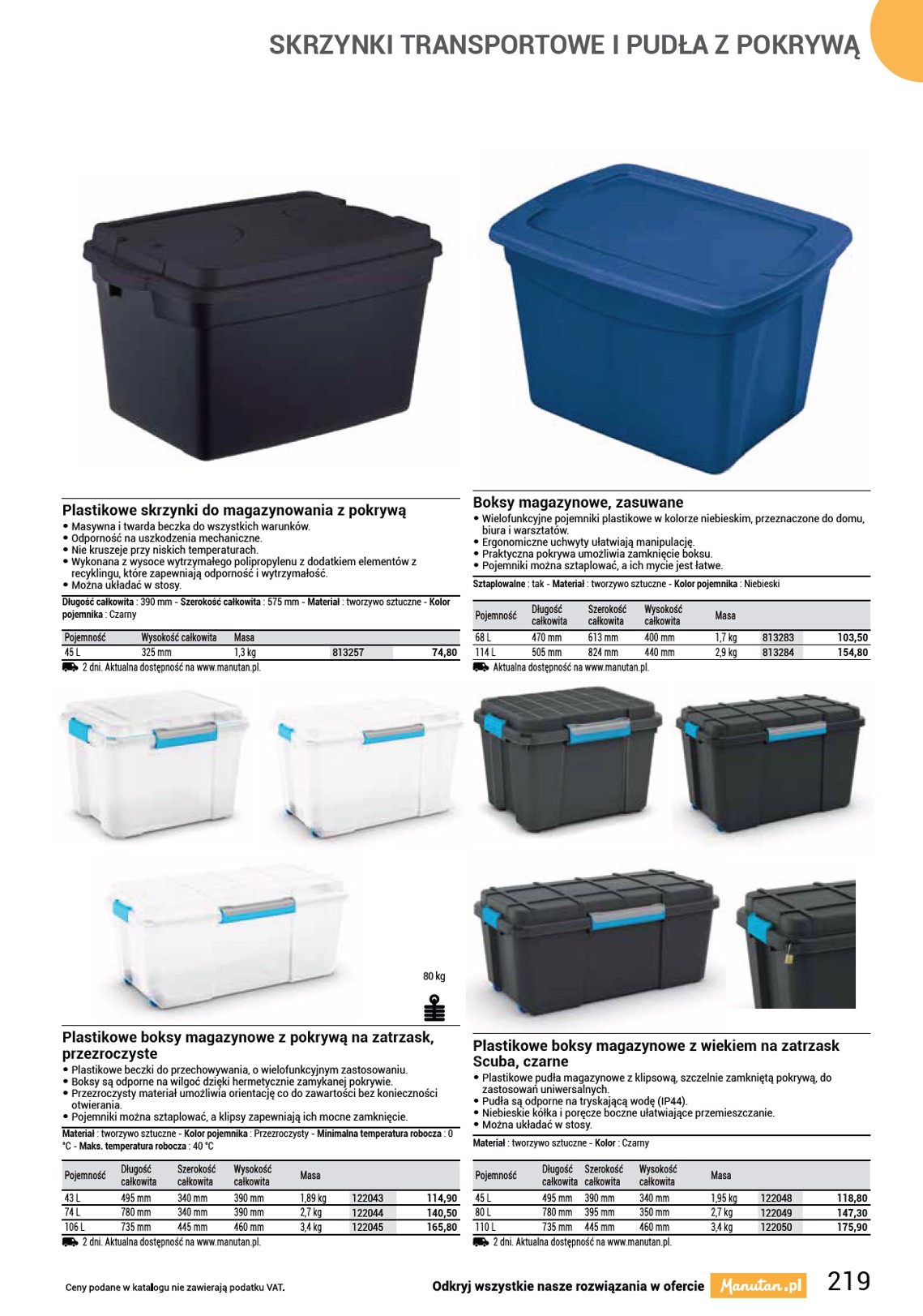SKRZYNKI TRANSPORTOWE I PUDŁA Z POKRYWĄ Plastikowe skrzynki do magazynowania z pokrywą • Masywna i twarda beczka do wszystkich warunków. • Odporność na uszkodzenia mechaniczne. • Nie kruszeje przy niskich temperaturach. • Wykonana z wysoce wytrzymałego polipropylenu z dodatkiem elementów z recyklingu, które zapewniają odporność i wytrzymałość. • Można układać w stosy. Długość całkowita : 390 mm - Szerokość całkowita : 575 mm - Materiał : tworzywo sztuczne - Kolor pojemnika : Czarny Pojemność Wysokość całkowita Masa 45 L 325 mm 1,3 kg 2 dni. Aktualna dostępność na www.manutan.pl. 813257 74,80 Boksy magazynowe, zasuwane • Wielofunkcyjne pojemniki plastikowe w kolorze niebieskim, przeznaczone do domu, biura i warsztatów. • Ergonomiczne uchwyty ułatwiają manipulację. • Praktyczna pokrywa umożliwia zamknięcie boksu. • Pojemniki można sztaplować, a ich mycie jest łatwe. Sztaplowalne : tak - Materiał : tworzywo sztuczne - Kolor pojemnika : Niebieski Pojemność Długość całkowita Szerokość całkowita Wysokość całkowita 68 L 470 mm 613 mm 400 mm 114 L 505 mm 824 mm 440 mm Aktualna dostępność na www.manutan.pl. Masa 1,7 kg 2,9 kg 813283 813284 103,50 154,80 80 kg Plastikowe boksy magazynowe z pokrywą na zatrzask, przezroczyste • Plastikowe beczki do przechowywania, o wielofunkcyjnym zastosowaniu. • Boksy są odporne na wilgoć dzięki hermetycznie zamykanej pokrywie. • Przezroczysty materiał umożliwia orientację co do zawartości bez konieczności otwierania. • Pojemniki można sztaplować, a klipsy zapewniają ich mocne zamknięcie. Materiał : tworzywo sztuczne - Kolor pojemnika : Przezroczysty - Minimalna temperatura robocza : 0 °C - Maks. temperatura robocza : 40 °C Pojemność Długość całkowita Szerokość całkowita Wysokość całkowita 43 L 495 mm 340 mm 390 mm 74 L 780 mm 340 mm 390 mm 106 L 735 mm 445 mm 460 mm 2 dni. Aktualna dostępność na www.manutan.pl. Masa 1,89 kg 2,7 kg 3,4 kg 122043 122044 122045 114,90 140,50 165,80 Plastikowe boksy magazynowe z wiekiem na zatrzask Scuba, czarne • Plastikowe pudła magazynowe z klipsową, szczelnie zamkniętą pokrywą, do zastosowań uniwersalnych. • Pudła są odporne na tryskającą wodę (IP44). • Niebieskie kółka i poręcze boczne ułatwiające przemieszczanie. • Można układać w stosy. Materiał : tworzywo sztuczne - Kolor : Czarny Pojemność Długość Szerokość całkowita całkowita Wysokość całkowita 45 L 495 mm 390 mm 340 mm 80 L 780 mm 395 mm 350 mm 110 L 735 mm 445 mm 460 mm 2 dni. Aktualna dostępność na www.manutan.pl. Masa 1,95 kg 2,7 kg 3,4 kg 122048 122049 122050 118,80 147,30 175,90 219