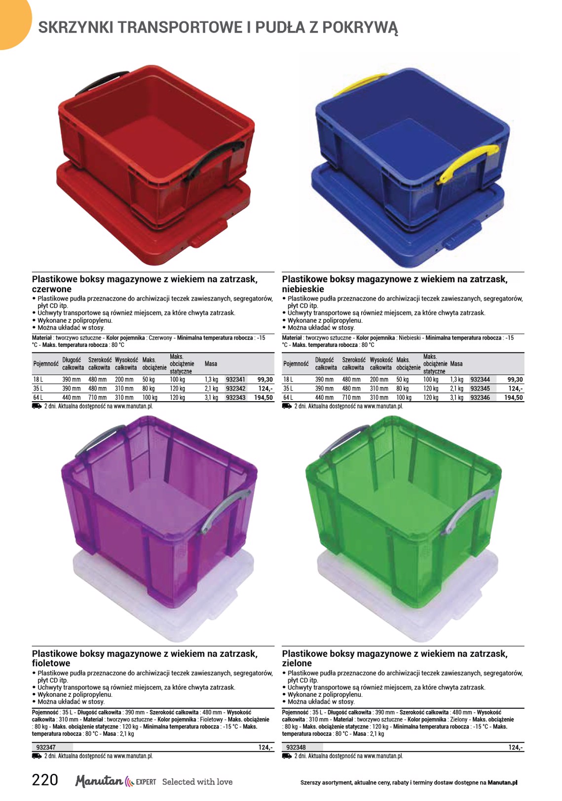 SKRZYNKI TRANSPORTOWE I PUDŁA Z POKRYWĄ szerszy asortyment Pojemniki plastikowe z pokrywą zamykaną na klipsy , przezroczyste • Skrzynki z tworzywa sztucznego przeznaczone do archiwizacji teczek zawieszanych, segregatorów, płyt CD itp. • Uchwyty do przenoszenia służą również jako uchwyty zatrzasków. • Przezroczysta konstrukcja umożliwia wgląd w przechowywane przedmioty bez konieczności otwierania. • Wykonane z polipropylenu. • Możliwość układania w stosy. Materiał : tworzywo sztuczne - Kolor pojemnika : Przezroczysty - Minimalna temperatura robocza : -15 °C - Maks. temperatura robocza : 80 °C Pojemność Długość całkowita Szerokość całkowita 0,7 L 100 mm 155 mm 1,6 L 135 mm 195 mm 3 L 185 mm 245 mm 9 L 255 mm 395 mm 18 L 390 mm 480 mm 35 L 390 mm 480 mm 42 L 440 mm 520 mm 50 L 440 mm 710 mm 64 L 710 mm 410 mm 84 L 440 mm 710 mm 145 L 620 mm 810 mm 2 dni. Aktualna dostępność na www.manutan.pl. Wysokość całkowita 80 mm 110 mm 160 mm 155 mm 200 mm 310 mm 310 mm 230 mm 310 mm 370 mm 430 mm Maks. obciążenie 3 kg 10 kg 10 kg 25 kg 50 kg 80 kg 80 kg 80 kg 100 kg 100 kg 100 kg Maks. obciążenie statyczne 30 kg 50 kg 50 kg 80 kg 100 kg 120 kg 120 kg 120 kg 120 kg 120 kg 120 kg Masa 0,09 kg 0,2 kg 0,5 kg 0,9 kg 1,3 kg 2,1 kg 2,7 kg 2,7 kg 3,1 kg 3,3 kg 4,2 kg szerszy asortyment 932337 932338 932300 932301 932302 932303 932339 932304 932305 932306 932340 22,80 26,90 50,80 75,80 126,50 155,30 165,- 176,50 205,- 205,- 375,- 200 kg tak Plastikowe skrzynki magazynowe z pokrywą na klips Manutan Expert • Plastikowe skrzynki magazynowe do zastosowań uniwersalnych. • Przezroczyste wykonanie pozwala na wgląd w przechowywane przedmioty bez konieczności otwierania. • Poręcze służą również jako klips do zamykania pudeł. • Łatwe przechowywanie, skrzynki można układać na sobie. Sztaplowalne : tak - Materiał : Polipropylen - Materiał : Polipropylen - Kolor : Przezroczysty - Kolor pojemnika : Przezroczysty - Typ pokrywy : CLIP - Minimalna temperatura robocza : -15 °C - Maks. temperatura robocza : +80 °C Rabat ilościowy Pojemność Długość całkowita Szerokość całkowita 10 L 350 mm 255 mm 24 L 480 mm 380 mm 18,5 L 395 mm 255 mm 36 L 475 mm 380 mm 70 L 660 mm 440 mm 85 L 660 mm 440 mm 2 dni. Aktualna dostępność na www.manutan.pl. Wysokość całkowita 155 mm 190 mm 290 mm 315 mm 320 mm 390 mm Maks. obciążenie 50 kg 50 kg 50 kg 150 kg 200 kg 140 kg Masa 776 g 1613 g 1170 g 2200 g 3200 g 3780 g 1502989 1502990 1502991 1502992 1502993 1502994 - 1 - 9 45,50 76,80 74,80 94,80 128,- 159,50 - 5% 10 - 19 43,- 72,70 70,90 89,90 121,60 151,40 - 10% 20 + 40,80 68,90 67,30 85,20 115,20 143,50 218