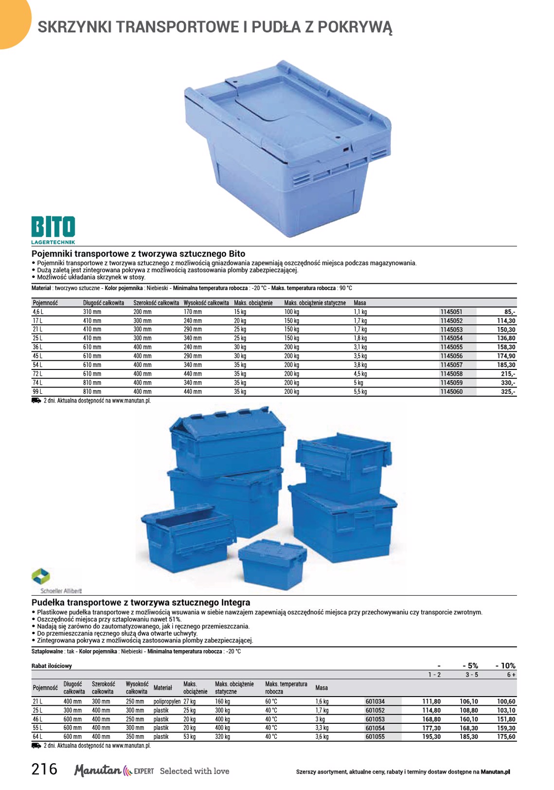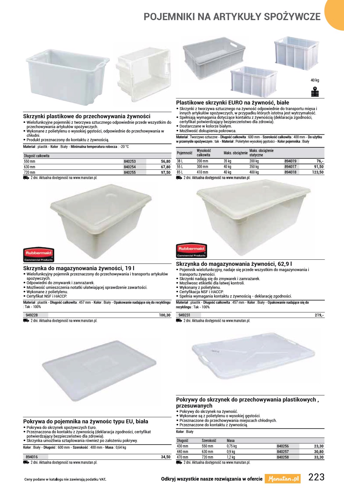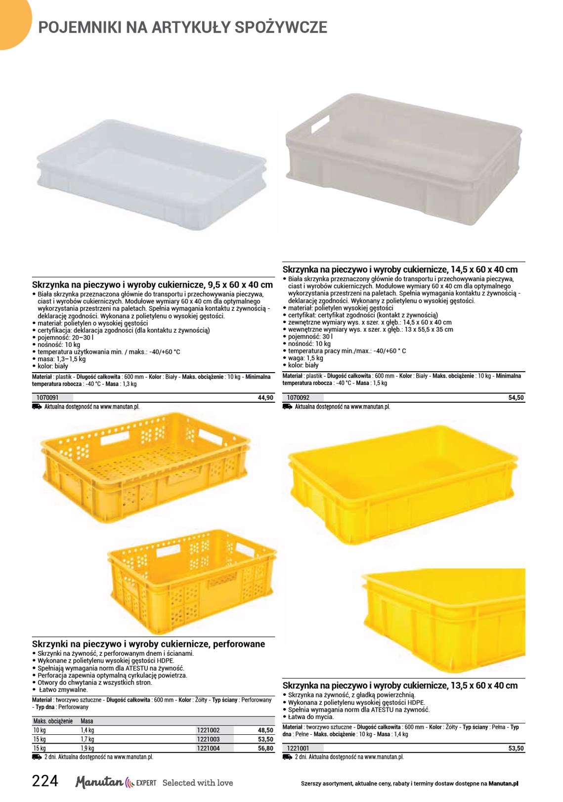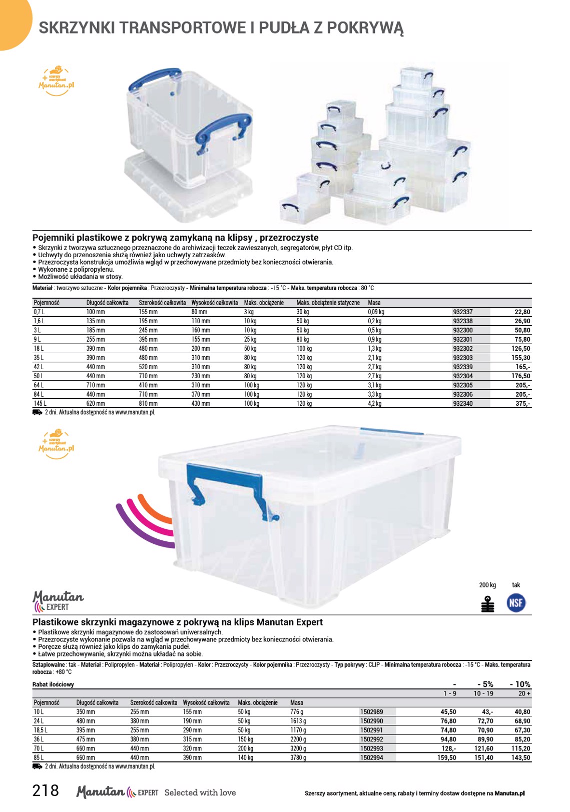 SKRZYNKI TRANSPORTOWE I PUDŁA Z POKRYWĄ Plastikowe boksy magazynowe z wiekiem na zatrzask, czerwone • Plastikowe pudła przeznaczone do archiwizacji teczek zawieszanych, segregatorów, płyt CD itp. • Uchwyty transportowe są również miejscem, za które chwyta zatrzask. • Wykonane z polipropylenu. • Można układać w stosy. Materiał : tworzywo sztuczne - Kolor pojemnika : Czerwony - Minimalna temperatura robocza : -15 °C - Maks. temperatura robocza : 80 °C Pojemność Długość Szerokość Wysokość Maks. całkowita całkowita całkowita obciążenie 18 L 390 mm 480 mm 200 mm 50 kg 35 L 390 mm 480 mm 310 mm 80 kg 64 L 440 mm 710 mm 310 mm 100 kg 2 dni. Aktualna dostępność na www.manutan.pl. Maks. obciążenie statyczne 100 kg 120 kg 120 kg Masa 1,3 kg 2,1 kg 3,1 kg 932341 932342 932343 99,30 124,- 194,50 Plastikowe boksy magazynowe z wiekiem na zatrzask, niebieskie • Plastikowe pudła przeznaczone do archiwizacji teczek zawieszanych, segregatorów, płyt CD itp. • Uchwyty transportowe są również miejscem, za które chwyta zatrzask. • Wykonane z polipropylenu. • Można układać w stosy. Materiał : tworzywo sztuczne - Kolor pojemnika : Niebieski - Minimalna temperatura robocza : -15 °C - Maks. temperatura robocza : 80 °C Pojemność Długość Szerokość Wysokość Maks. Maks. całkowita całkowita całkowita obciążenie obciążenie Masa statyczne 18 L 390 mm 480 mm 200 mm 50 kg 100 kg 1,3 kg 35 L 390 mm 480 mm 310 mm 80 kg 120 kg 2,1 kg 64 L 440 mm 710 mm 310 mm 100 kg 120 kg 3,1 kg 2 dni. Aktualna dostępność na www.manutan.pl. 932344 932345 932346 99,30 124,- 194,50 Plastikowe boksy magazynowe z wiekiem na zatrzask, fioletowe • Plastikowe pudła przeznaczone do archiwizacji teczek zawieszanych, segregatorów, płyt CD itp. • Uchwyty transportowe są również miejscem, za które chwyta zatrzask. • Wykonane z polipropylenu. • Można układać w stosy. Pojemność : 35 L - Długość całkowita : 390 mm - Szerokość całkowita : 480 mm - Wysokość całkowita : 310 mm - Materiał : tworzywo sztuczne - Kolor pojemnika : Fioletowy - Maks. obciążenie : 80 kg - Maks. obciążenie statyczne : 120 kg - Minimalna temperatura robocza : -15 °C - Maks. temperatura robocza : 80 °C - Masa : 2,1 kg 932347 2 dni. Aktualna dostępność na www.manutan.pl. 124,- Plastikowe boksy magazynowe z wiekiem na zatrzask, zielone • Plastikowe pudła przeznaczone do archiwizacji teczek zawieszanych, segregatorów, płyt CD itp. • Uchwyty transportowe są również miejscem, za które chwyta zatrzask. • Wykonane z polipropylenu. • Można układać w stosy. Pojemność : 35 L - Długość całkowita : 390 mm - Szerokość całkowita : 480 mm - Wysokość całkowita : 310 mm - Materiał : tworzywo sztuczne - Kolor pojemnika : Zielony - Maks. obciążenie : 80 kg - Maks. obciążenie statyczne : 120 kg - Minimalna temperatura robocza : -15 °C - Maks. temperatura robocza : 80 °C - Masa : 2,1 kg 932348 2 dni. Aktualna dostępność na www.manutan.pl. 124,- 220