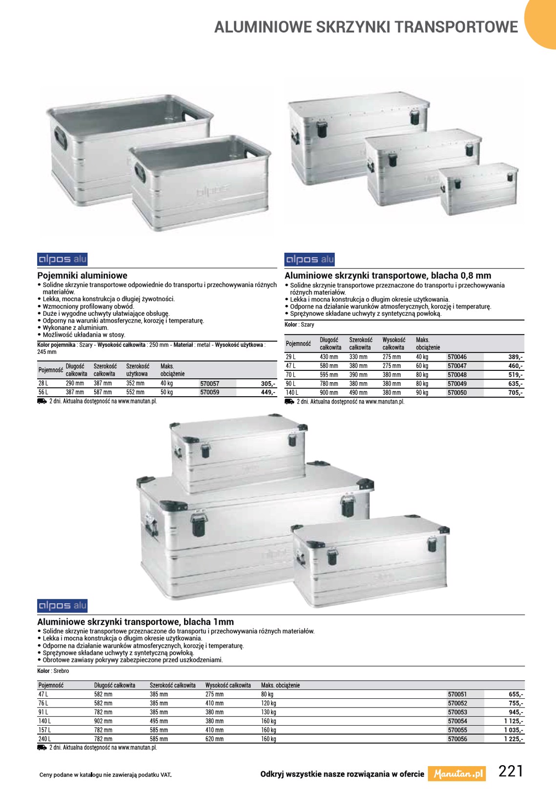 ALUMINIOWE SKRZYNKI TRANSPORTOWE Pojemniki aluminiowe • Solidne skrzynie transportowe odpowiednie do transportu i przechowywania różnych materiałów. • Lekka, mocna konstrukcja o długiej żywotności. • Wzmocniony profilowany obwód. • Duże i wygodne uchwyty ułatwiające obsługę. • Odporny na warunki atmosferyczne, korozję i temperaturę. • Wykonane z aluminium. • Możliwość układania w stosy. Kolor pojemnika : Szary - Wysokość całkowita : 250 mm - Materiał : metal - Wysokość użytkowa : 245 mm Pojemność Długość Szerokość całkowita całkowita Szerokość użytkowa Maks. obciążenie 28 L 290 mm 387 mm 352 mm 40 kg 56 L 387 mm 587 mm 552 mm 50 kg 2 dni. Aktualna dostępność na www.manutan.pl. 570057 570059 305,- 449,- Aluminiowe skrzynki transportowe, blacha 0,8 mm • Solidne skrzynie transportowe przeznaczone do transportu i przechowywania różnych materiałów. • Lekka i mocna konstrukcja o długim okresie użytkowania. • Odporne na działanie warunków atmosferycznych, korozję i temperaturę. • Sprężynowe składane uchwyty z syntetyczną powłoką. Kolor : Szary Pojemność Długość całkowita Szerokość całkowita Wysokość całkowita 29 L 430 mm 330 mm 275 mm 47 L 580 mm 380 mm 275 mm 70 L 595 mm 390 mm 380 mm 90 L 780 mm 380 mm 380 mm 140 L 900 mm 490 mm 380 mm 2 dni. Aktualna dostępność na www.manutan.pl. Maks. obciążenie 40 kg 60 kg 80 kg 80 kg 90 kg 570046 570047 570048 570049 570050 389,- 460,- 519,- 635,- 705,- Aluminiowe skrzynki transportowe, blacha 1mm • Solidne skrzynie transportowe przeznaczone do transportu i przechowywania różnych materiałów. • Lekka i mocna konstrukcja o długim okresie użytkowania. • Odporne na działanie warunków atmosferycznych, korozję i temperaturę. • Sprężynowe składane uchwyty z syntetyczną powłoką. • Obrotowe zawiasy pokrywy zabezpieczone przed uszkodzeniami. Kolor : Srebro Pojemność Długość całkowita Szerokość całkowita 47 L 582 mm 385 mm 76 L 582 mm 385 mm 91 L 782 mm 385 mm 140 L 902 mm 495 mm 157 L 782 mm 585 mm 240 L 782 mm 585 mm 2 dni. Aktualna dostępność na www.manutan.pl. Wysokość całkowita 275 mm 410 mm 380 mm 380 mm 410 mm 620 mm Maks. obciążenie 80 kg 120 kg 130 kg 160 kg 160 kg 160 kg 570051 570052 570053 570054 570055 570056 655,- 755,- 945,- 1 125,- 1 035,- 1 225,- 221
