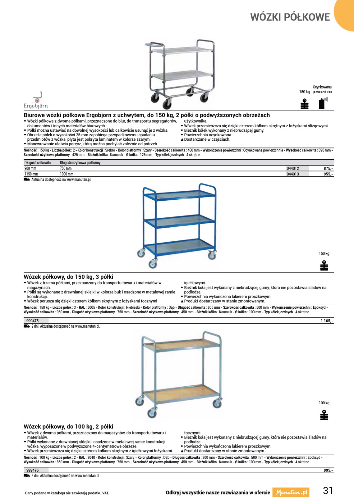 WÓZKI PÓŁKOWE Ocynkowana 150 kg powierzchnia Biurowe wózki półkowe Ergobjorn z uchwytem, do 150 kg, 2 półki o podwyższonych obrzeżach • Wózki półkowe z dwoma półkami, przeznaczone do biur, do transportu segregatorów, użytkownika. dokumentów i innych materiałów biurowych. • Wózek przemieszcza się dzięki czterem kółkom skrętnym z łożyskami ślizgowymi. • Półki można ustawiać na dowolnej wysokości lub całkowicie usunąć je z wózka. • Bieżnik kółek wykonany z niebrudzącej gumy. • Obrzeże półek o wysokości 25 mm zapobiega przypadkowemu spadaniu • Powierzchnia ocynkowana. przedmiotów z wózka, płyta jest pokryta laminatem w kolorze szarym. SS Dostarczane w częściach. • Manewrowanie ułatwia poręcz, którą można pochylać zależnie od potrzeb Nośność : 150 kg - Liczba półek : 2 - Kolor konstrukcji : Srebro - Kolor platformy : Szary - Szerokość całkowita : 460 mm - Wykończenie powierzchni : Ocynkowana powierzchnia - Wysokość całkowita : 890 mm - Szerokość użytkowa platformy : 425 mm - Bieżnik kółka : Kauczuk - Ø kółka : 125 mm - Typ kółek jezdnych : 4 skrętne Długość całkowita Długość użytkowa platformy 900 mm 750 mm 1150 mm 1000 mm Aktualna dostępność na www.manutan.pl. 044012 044013 875,- 955,- 150 kg Wózek półkowy, do 150 kg, 3 półki • Wózek z trzema półkami, przeznaczony do transportu towaru i materiałów w magazynach. • Półki są wykonane z drewnianej sklejki w kolorze buk i osadzone w metalowej ramie konstrukcji. • Wózek porusza się dzięki czterem kółkom skrętnym z łożyskami tocznymi igiełkowymi. • Bieżnik koła jest wykonany z niebrudzącej gumy, która nie pozostawia śladów na podłodze. • Powierzchnia wykończona lakierem proszkowym. SS Produkt dostarczany w stanie zmontowanym. Nośność : 150 kg - Liczba półek : 3 - RAL : 5005 - Kolor konstrukcji : Niebieski - Kolor platformy : Dąb - Długość całkowita : 800 mm - Szerokość całkowita : 500 mm - Wykończenie powierzchni : Epoksyd - Wysokość całkowita : 950 mm - Długość użytkowa platformy : 750 mm - Szerokość użytkowa platformy : 450 mm - Bieżnik kółka : Kauczuk - Ø kółka : 100 mm - Typ kółek jezdnych : 4 skrętne 999475 2 dni. Aktualna dostępność na www.manutan.pl. 1 165,- 100 kg Wózek półkowy, do 100 kg, 2 półki • Wózek z dwoma półkami, przeznaczony do magazynów, do transportu towaru i materiałów. • Półki wykonane z drewnianej sklejki i osadzone w metalowej ramie konstrukcji wózka, wyposażone w podwyższone 4-centymetrowe obrzeże. • Wózek przemieszcza się dzięki czterem kółkom skrętnym z igiełkowymi łożyskami tocznymi. • Bieżnik koła jest wykonany z niebrudzącej gumy, która nie pozostawia śladów na podłodze. • Powierzchnia wykończona lakierem proszkowym. SS Produkt dostarczany w stanie zmontowanym. Nośność : 100 kg - Liczba półek : 2 - RAL : 7040 - Kolor konstrukcji : Szary - Kolor platformy : Dąb - Długość całkowita : 800 mm - Szerokość całkowita : 500 mm - Wykończenie powierzchni : Epoksyd - Wysokość całkowita : 850 mm - Długość użytkowa platformy : 750 mm - Szerokość użytkowa platformy : 450 mm - Bieżnik kółka : Kauczuk - Ø kółka : 100 mm - Typ kółek jezdnych : 4 skrętne 999476 2 dni. Aktualna dostępność na www.manutan.pl. 995,- 31