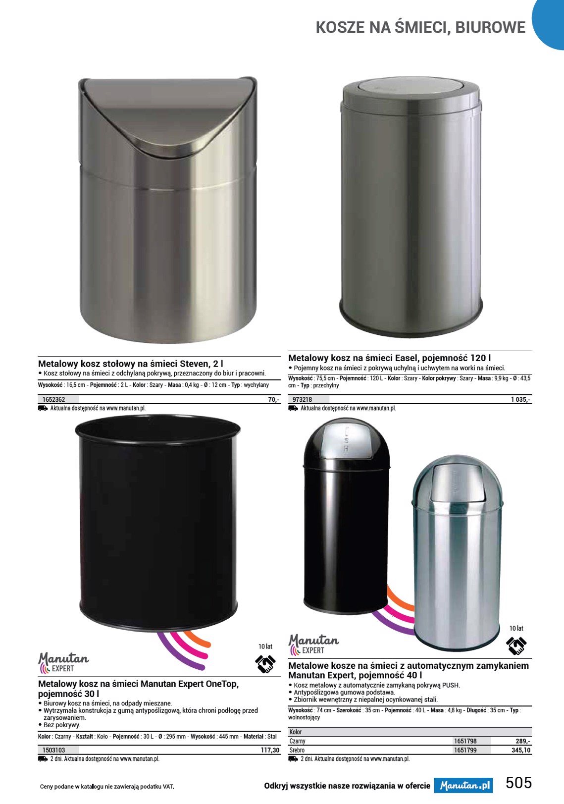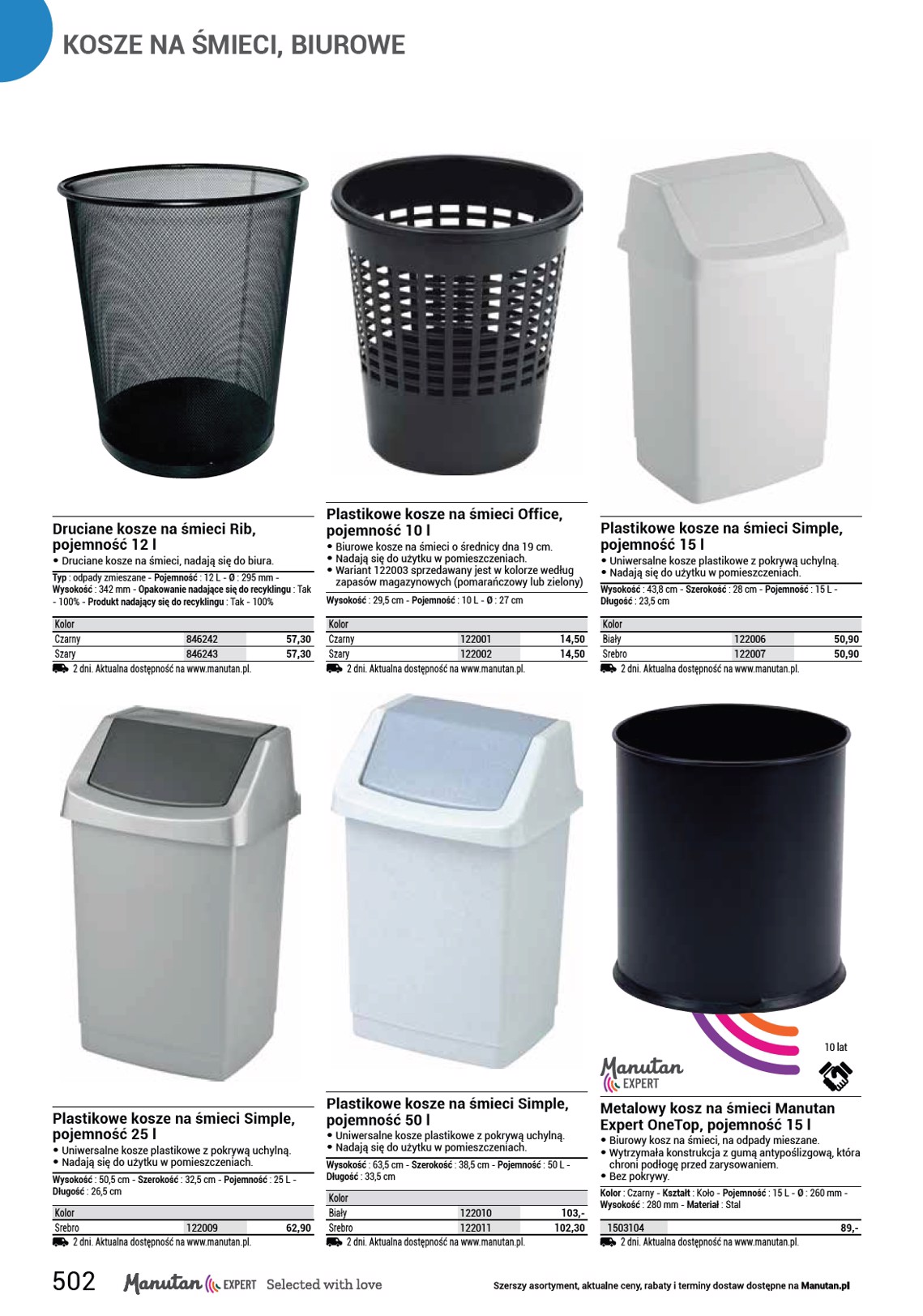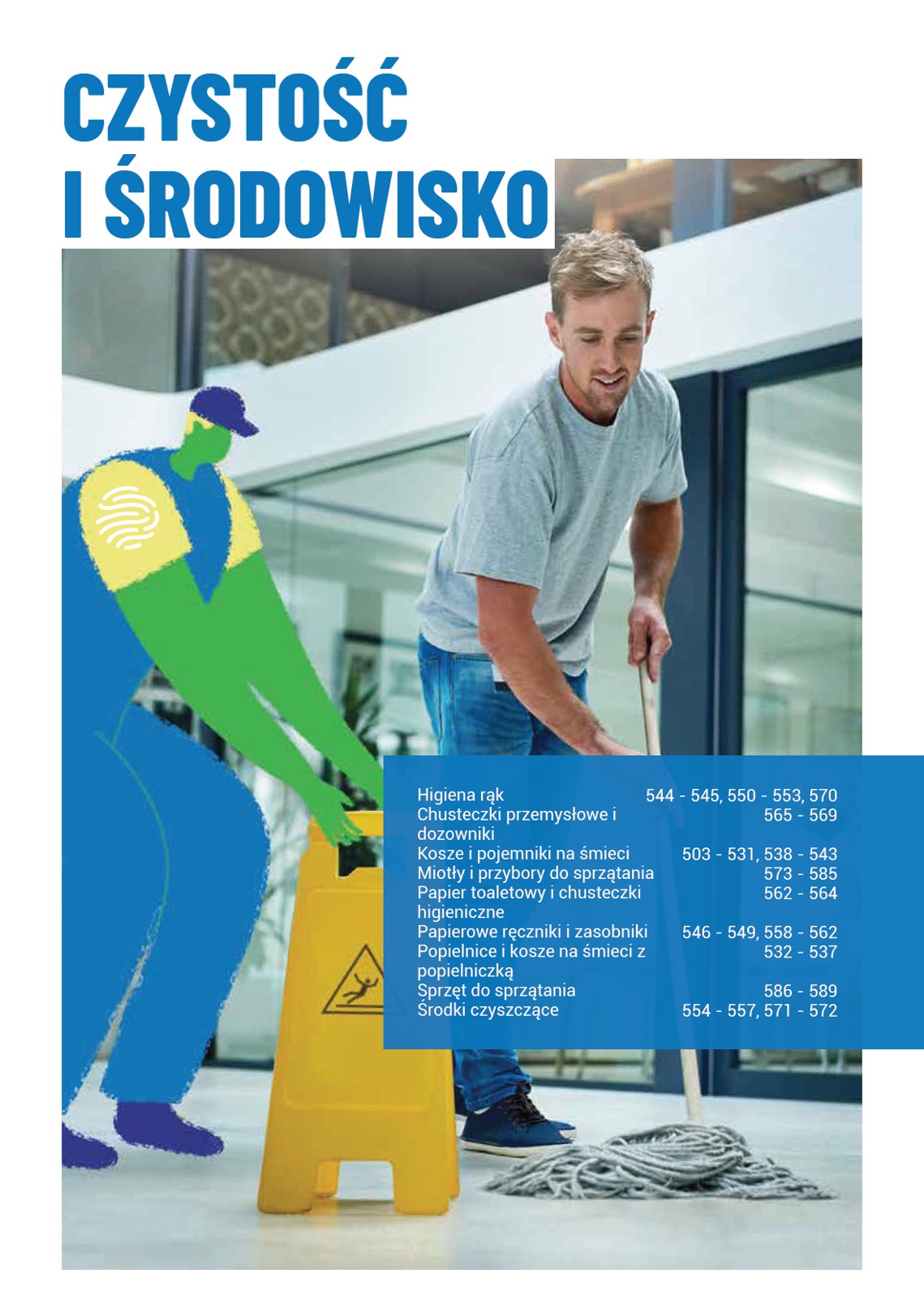 CZYSTOŚĆ I ŚRODOWISKO Higiena rąk 544 - 545, 550 - 553, 570 Chusteczki przemysłowe i 565 - 569 dozowniki Kosze i pojemniki na śmieci 503 - 531, 538 - 543 Miotły i przybory do sprzątania 573 - 585 Papier toaletowy i chusteczki 562 - 564 higieniczne Papierowe ręczniki i zasobniki 546 - 549, 558 - 562 Popielnice i kosze na śmieci z 532 - 537 popielniczką Sprzęt do sprzątania 586 - 589 Środki czyszczące 554 - 557, 571 - 572
