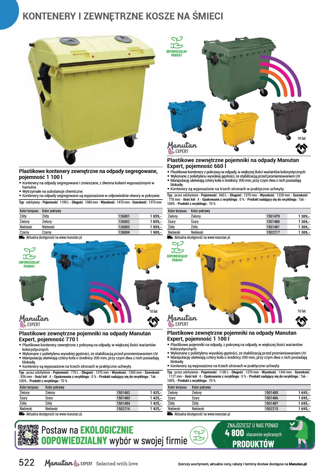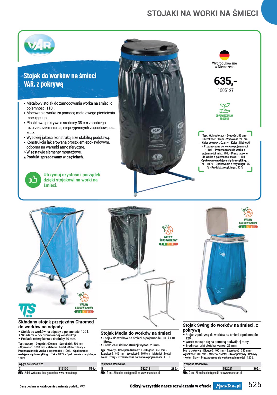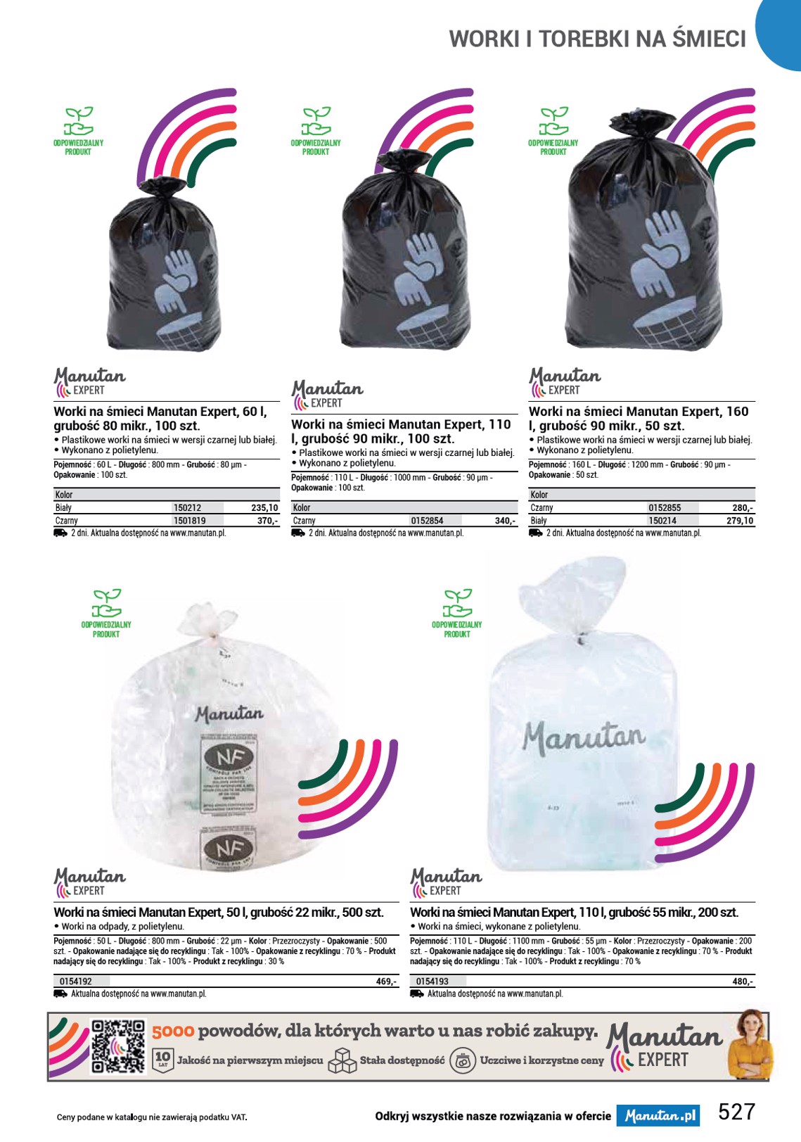 ODPOWIEDZIALNY PRODUKT ODPOWIEDZIALNY PRODUKT WORKI I TOREBKI NA ŚMIECI ODPOWIEDZIALNY PRODUKT Worki na śmieci Manutan Expert, 60 l, grubość 80 mikr., 100 szt. • Plastikowe worki na śmieci w wersji czarnej lub białej. • Wykonano z polietylenu. Pojemność : 60 L - Długość : 800 mm - Grubość : 80 µm - Opakowanie : 100 szt. Kolor Biały 150212 Czarny 1501819 2 dni. Aktualna dostępność na www.manutan.pl. 235,10 370,- Worki na śmieci Manutan Expert, 110 l, grubość 90 mikr., 100 szt. • Plastikowe worki na śmieci w wersji czarnej lub białej. • Wykonano z polietylenu. Pojemność : 110 L - Długość : 1000 mm - Grubość : 90 µm - Opakowanie : 100 szt. Kolor Czarny 0152854 2 dni. Aktualna dostępność na www.manutan.pl. 340,- Worki na śmieci Manutan Expert, 160 l, grubość 90 mikr., 50 szt. • Plastikowe worki na śmieci w wersji czarnej lub białej. • Wykonano z polietylenu. Pojemność : 160 L - Długość : 1200 mm - Grubość : 90 µm - Opakowanie : 50 szt. Kolor Czarny 0152855 Biały 150214 2 dni. Aktualna dostępność na www.manutan.pl. 280,- 279,10 ODPOWIEDZIALNY PRODUKT ODPOWIEDZIALNY PRODUKT Worki na śmieci Manutan Expert, 50 l, grubość 22 mikr., 500 szt. • Worki na odpady, z polietylenu. Pojemność : 50 L - Długość : 800 mm - Grubość : 22 µm - Kolor : Przezroczysty - Opakowanie : 500 szt. - Opakowanie nadające się do recyklingu : Tak - 100% - Opakowanie z recyklingu : 70 % - Produkt nadający się do recyklingu : Tak - 100% - Produkt z recyklingu : 30 % 0154192 Aktualna dostępność na www.manutan.pl. 469,- Worki na śmieci Manutan Expert, 110 l, grubość 55 mikr., 200 szt. • Worki na śmieci, wykonane z polietylenu. Pojemność : 110 L - Długość : 1100 mm - Grubość : 55 µm - Kolor : Przezroczysty - Opakowanie : 200 szt. - Opakowanie nadające się do recyklingu : Tak - 100% - Opakowanie z recyklingu : 70 % - Produkt nadający się do recyklingu : Tak - 100% - Produkt z recyklingu : 70 % 0154193 Aktualna dostępność na www.manutan.pl. 480,- 527