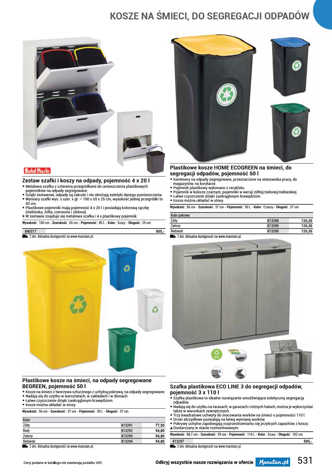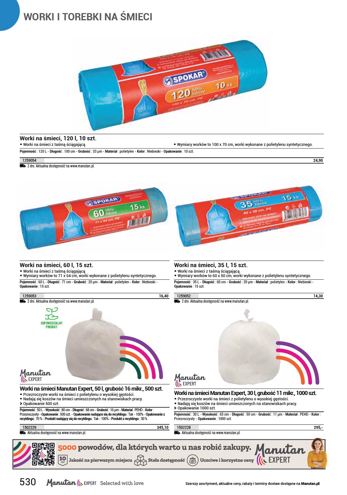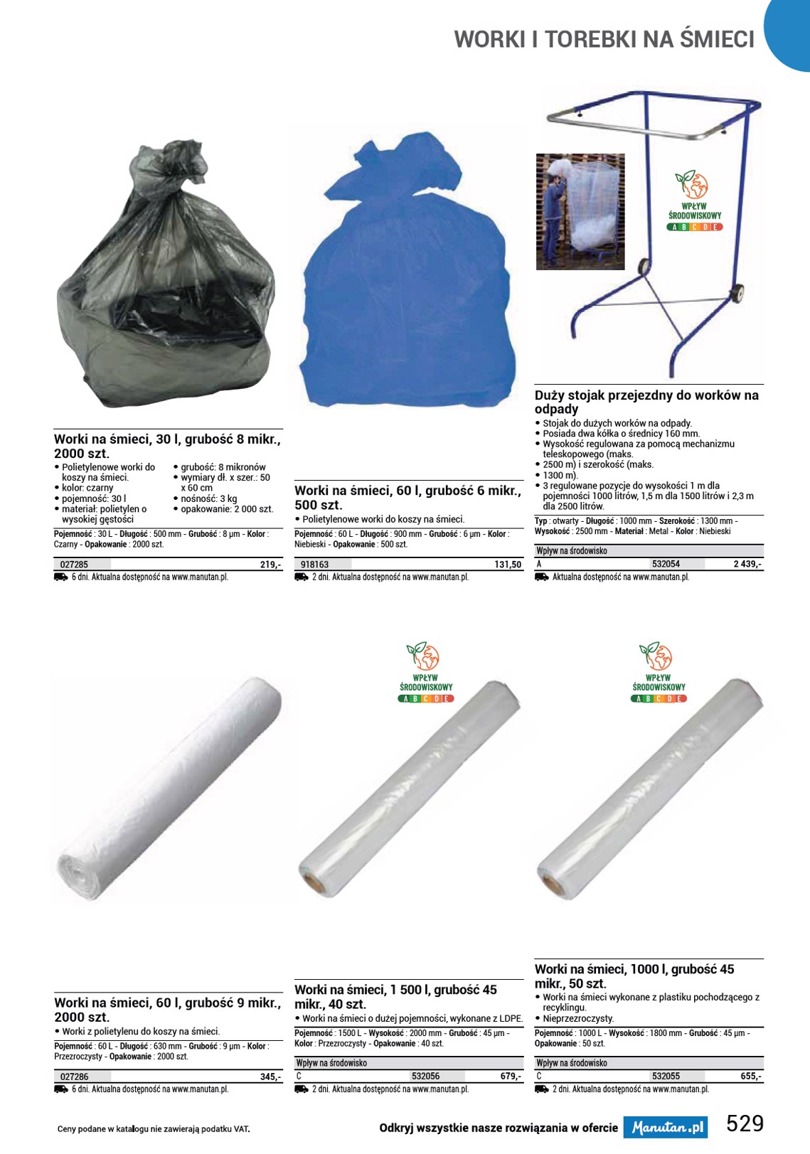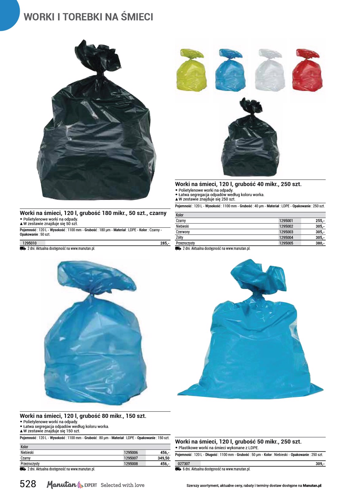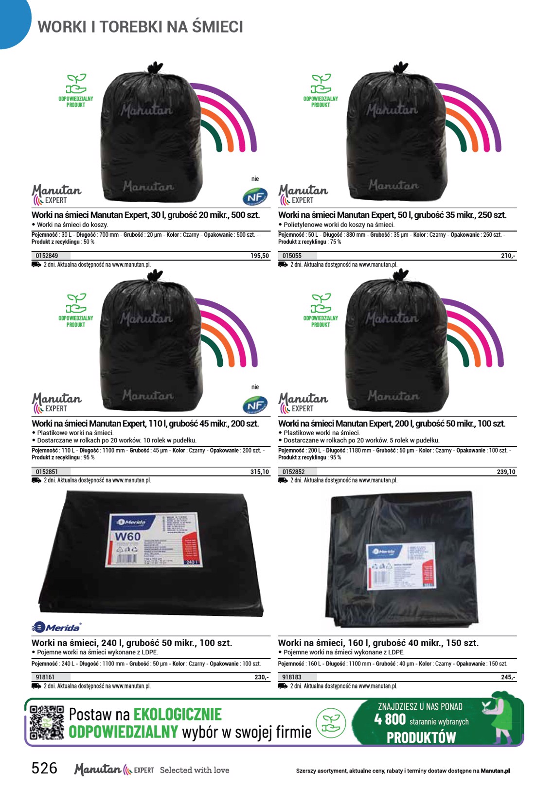 WORKI I TOREBKI NA ŚMIECI ODPOWIEDZIALNY PRODUKT ODPOWIEDZIALNY PRODUKT nie Worki na śmieci Manutan Expert, 30 l, grubość 20 mikr., 500 szt. • Worki na śmieci do koszy. Pojemność : 30 L - Długość : 700 mm - Grubość : 20 µm - Kolor : Czarny - Opakowanie : 500 szt. - Produkt z recyklingu : 50 % 0152849 2 dni. Aktualna dostępność na www.manutan.pl. 195,50 Worki na śmieci Manutan Expert, 50 l, grubość 35 mikr., 250 szt. • Polietylenowe worki do koszy na śmieci. Pojemność : 50 L - Długość : 880 mm - Grubość : 35 µm - Kolor : Czarny - Opakowanie : 250 szt. - Produkt z recyklingu : 75 % 015055 2 dni. Aktualna dostępność na www.manutan.pl. 210,- ODPOWIEDZIALNY PRODUKT ODPOWIEDZIALNY PRODUKT nie Worki na śmieci Manutan Expert, 110 l, grubość 45 mikr., 200 szt. • Plastikowe worki na śmieci. • Dostarczane w rolkach po 20 worków. 10 rolek w pudełku. Pojemność : 110 L - Długość : 1100 mm - Grubość : 45 µm - Kolor : Czarny - Opakowanie : 200 szt. - Produkt z recyklingu : 95 % 0152851 2 dni. Aktualna dostępność na www.manutan.pl. 315,10 Worki na śmieci Manutan Expert, 200 l, grubość 50 mikr., 100 szt. • Plastikowe worki na śmieci. • Dostarczane w rolkach po 20 worków. 5 rolek w pudełku. Pojemność : 200 L - Długość : 1180 mm - Grubość : 50 µm - Kolor : Czarny - Opakowanie : 100 szt. - Produkt z recyklingu : 95 % 0152852 2 dni. Aktualna dostępność na www.manutan.pl. 239,10 Worki na śmieci, 240 l, grubość 50 mikr., 100 szt. • Pojemne worki na śmieci wykonane z LDPE. Pojemność : 240 L - Długość : 1100 mm - Grubość : 50 µm - Kolor : Czarny - Opakowanie : 100 szt. 918161 2 dni. Aktualna dostępność na www.manutan.pl. 230,- Worki na śmieci, 160 l, grubość 40 mikr., 150 szt. • Pojemne worki na śmieci wykonane z LDPE. Pojemność : 160 L - Długość : 1100 mm - Grubość : 40 µm - Kolor : Czarny - Opakowanie : 150 szt. 918183 2 dni. Aktualna dostępność na www.manutan.pl. 245,- 526