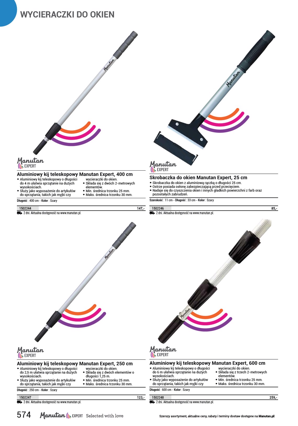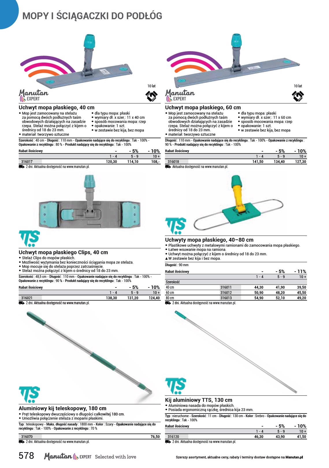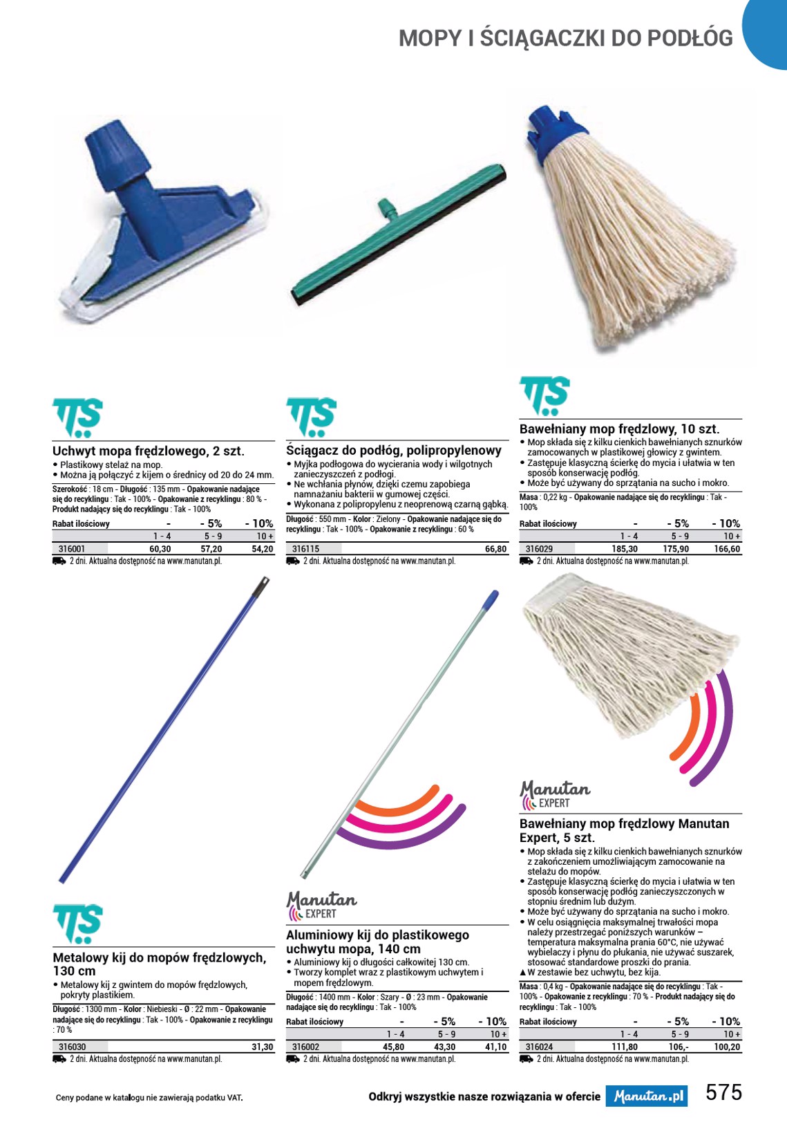 MOPY I ŚCIĄGACZKI DO PODŁÓG 10 lat 10 lat Uchwyt mopa płaskiego, 40 cm • Mop jest zamocowany na stelażu • dla typu mopa: płaski za pomocą dwóch podłużnych taśm • wymiary dł. x szer.: 11 x 40 cm obwodowych działających na zasadzie • sposób mocowania mopa: rzep rzepa. Stelaż można połączyć z kijem o • opakowanie: 1 szt. średnicy od 18 do 23 mm. • w zestawie bez kija, bez mopa • materiał: tworzywo sztuczne Szerokość : 40 cm - Długość : 110 mm - Opakowanie nadające się do recyklingu : Tak - 100% - Opakowanie z recyklingu : 80 % - Produkt nadający się do recyklingu : Tak - 100% Rabat ilościowy 316017 2 dni. Aktualna dostępność na www.manutan.pl. - 1 - 4 120,30 - 5% 5 - 9 114,10 - 10% 10 + 108,- Uchwyt mopa płaskiego, 60 cm • Mop jest zamocowany na stelażu • dla typu mopa: płaski za pomocą dwóch podłużnych taśm • wymiary dł. x szer.: 11 x 60 cm obwodowych działających na zasadzie • sposób mocowania mopa: rzep rzepa. Stelaż można połączyć z kijem o • opakowanie: 1 szt. średnicy od 18 do 23 mm. • w zestawie bez kija, bez mopa • materiał: tworzywo sztuczne Długość : 110 mm - Opakowanie nadające się do recyklingu : Tak - 100% - Opakowanie z recyklingu : 90 % - Produkt nadający się do recyklingu : Tak - 100% Rabat ilościowy 316018 Aktualna dostępność na www.manutan.pl. - 1 - 4 141,50 - 5% 5 - 9 134,40 - 10% 10 + 127,30 Uchwyt mopa płaskiego Clips, 40 cm • Stelaż Clips do mopów płaskich. • Możliwość wyżymania bez konieczności ściągania mopa ze stelaża. • Mop mocuje się do stelaża poprzez zatrzaśnięcie. • Stelaż można połączyć z kijem o średnicy od 18 do 23 mm. Szerokość : 48,5 cm - Długość : 110 mm - Opakowanie nadające się do recyklingu : Tak - 100% - Opakowanie z recyklingu : 90 % - Produkt nadający się do recyklingu : Tak - 100% Rabat ilościowy 316021 2 dni. Aktualna dostępność na www.manutan.pl. - 1 - 4 138,30 - 5% 5 - 9 131,20 - 10% 10 + 124,40 Uchwyty mopa płaskiego, 40–80 cm • Plastikowe uchwyty z metalowymi ramionami do zamocowania mopa płaskiego. • Łatwe wsuwanie mopa na ramiona. • Uchwyt można połączyć z kijem o średnicy od 18 do 23 mm. SS W zestawie bez kija i bez mopa. Długość : 90 mm Rabat ilościowy Szerokość 40 cm 316011 60 cm 316012 80 cm 316013 2 dni. Aktualna dostępność na www.manutan.pl. - 1 - 4 44,30 50,90 54,90 - 5% 5 - 9 41,90 48,20 52,10 - 11% 10 + 39,50 45,50 49,20 Aluminiowy kij teleskopowy, 180 cm • Pręt teleskopowy dwuczęściowy o długości całkowitej 180 cm. • Umożliwia połączenie stelaża z mopami płaskimi. Typ : teleskopowy - Maks. długość nasady : 1800 mm - Kolor : Szary - Opakowanie nadające się do recyklingu : Tak - 100% - Opakowanie z recyklingu : 70 % 316070 2 dni. Aktualna dostępność na www.manutan.pl. 76,50 Kij aluminiowy TTS, 130 cm • Aluminiowa nasada do mopów płaskich. • Posiada ergonomiczną rączkę, średnica kija 23 mm. Typ : nieruchome - Szerokość : 11 cm - Długość : 130 cm - Kolor : Srebro - Opakowanie nadające się do recyklingu : Tak - 100% Rabat ilościowy - - 5% - 10% 1 - 4 5 - 9 10 + 316120 46,30 43,90 41,50 2 dni. Aktualna dostępność na www.manutan.pl. 578