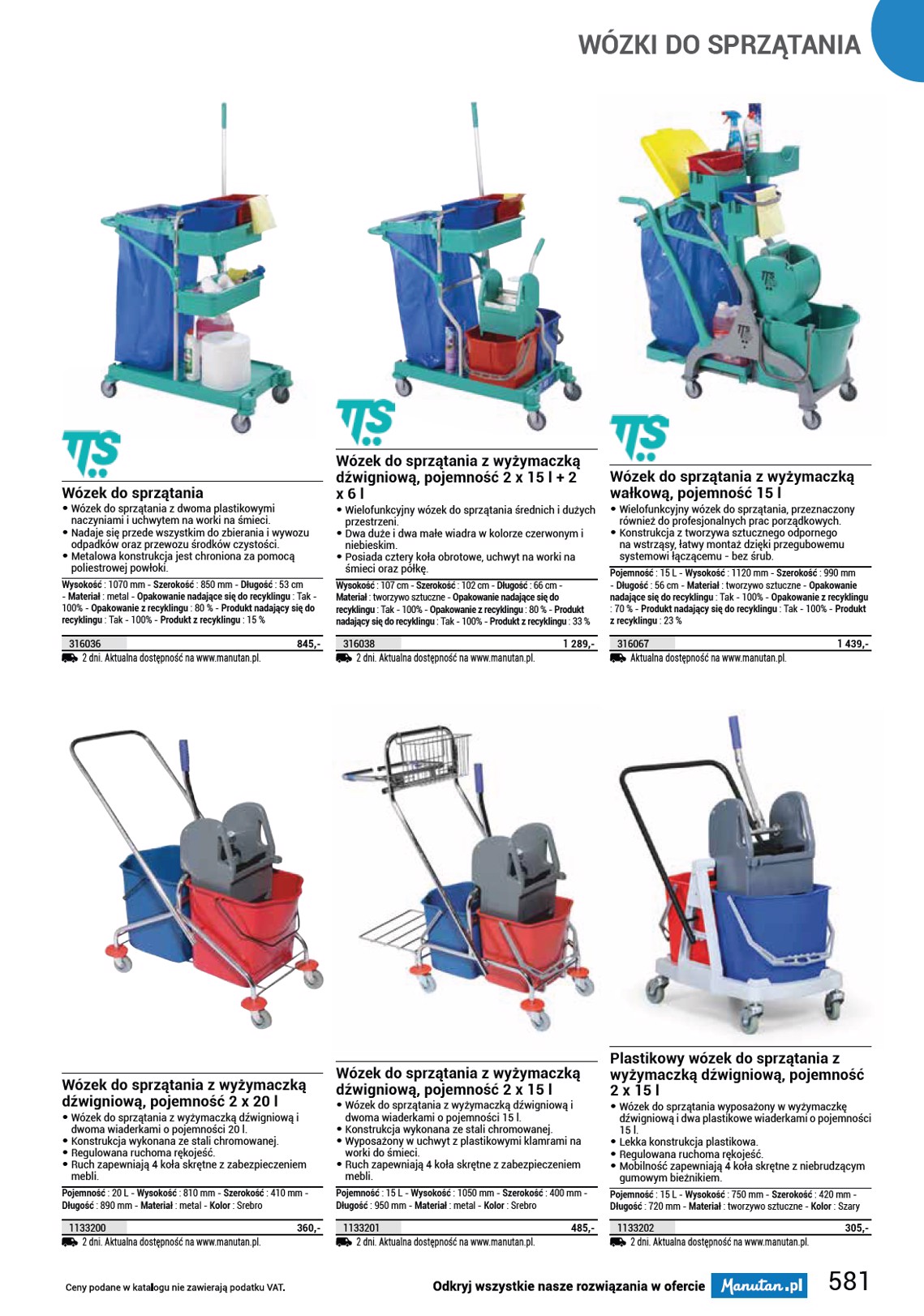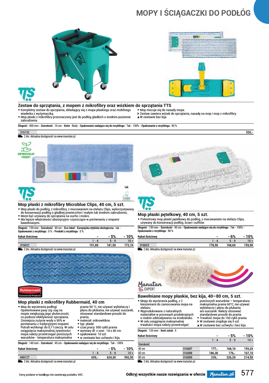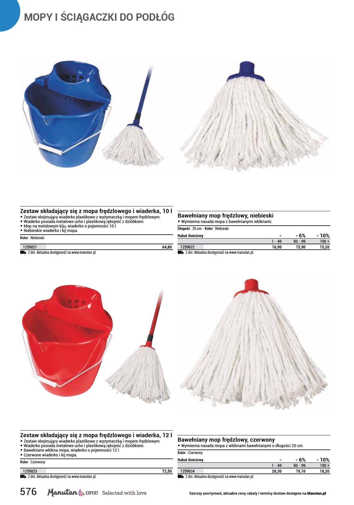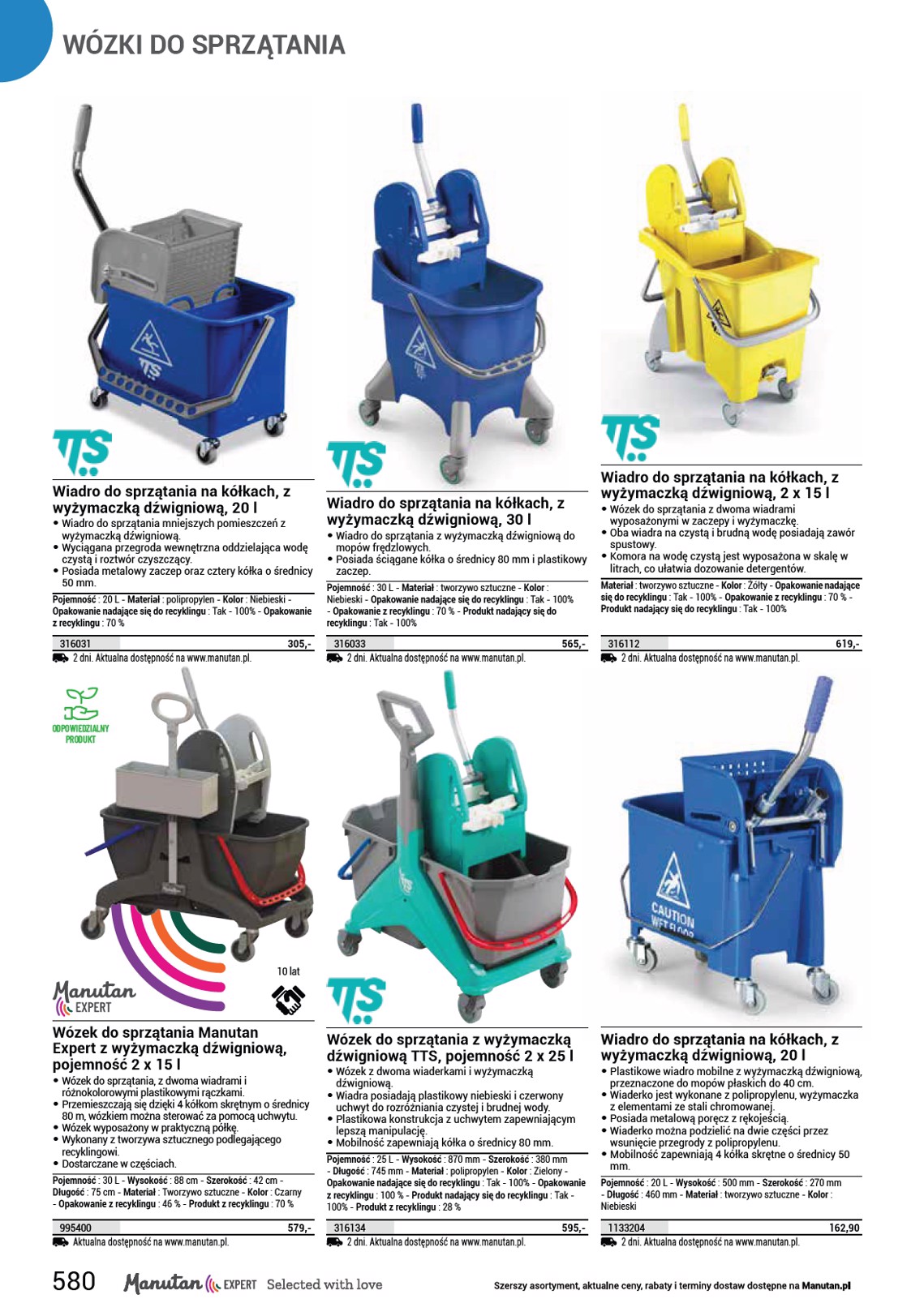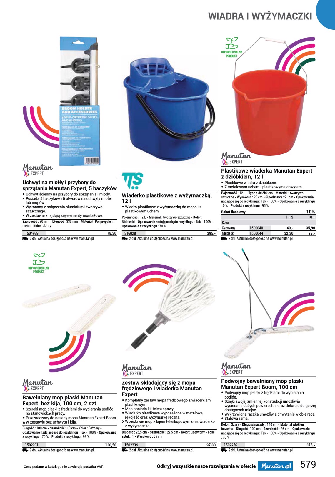 WIADRA I WYŻYMACZKI ODPOWIEDZIALNY PRODUKT Uchwyt na miotły i przybory do sprzątania Manutan Expert, 5 haczyków • Uchwyt ścienny na przybory do sprzątania i miotły. • Posiada 5 haczyków i 6 otworów na uchwyty mioteł lub mopów. • Wykonany z połączenia aluminium i tworzywa sztucznego. • W zestawie znajdują się elementy montażowe. Szerokość : 70 mm - Długość : 333 mm - Materiał : Polipropylen, metal - Kolor : Szary 1504939 2 dni. Aktualna dostępność na www.manutan.pl. 78,30 Wiaderko plastikowe z wyżymaczką, 12 l • Wiadro plastikowe z wyżymaczką do mopa i z plastikowym uchem. Pojemność : 12 L - Materiał : tworzywo sztuczne - Kolor : Niebieski - Opakowanie nadające się do recyklingu : Tak - 100% - Opakowanie z recyklingu : 70 % 316028 2 dni. Aktualna dostępność na www.manutan.pl. 395,- Plastikowe wiaderka Manutan Expert z dzióbkiem, 12 l • Plastikowe wiadra z dzióbkiem. • Z metalowym uchem i plastikowym uchwytem. Pojemność : 12 L - Typ : z dzióbkiem - Materiał : tworzywo sztuczne - Wysokość : 26 cm - Ø podstawy : 21 cm - Opakowanie nadające się do recyklingu : Tak - 100% - Opakowanie z recyklingu : 0 % - Produkt z recyklingu : 95 % Rabat ilościowy - - 10% 1 - 9 10 + Kolor Czerwony 1500040 40,- 35,90 Niebieski 1500044 32,30 29,- 2 dni. Aktualna dostępność na www.manutan.pl. ODPOWIEDZIALNY PRODUKT Bawełniany mop płaski Manutan Expert, bez kija, 100 cm, 2 szt. • Szeroki mop płaski z frędzlami do wycierania podłóg na stanowiskach pracy. • Przeznaczony do nasady mopa Manutan Expert Boom. SS W zestawie bez uchwytu i kija. Długość : 100 cm - Szerokość : 13 cm - Kolor : Beżowy - Opakowanie nadające się do recyklingu : Tak - 100% - Opakowanie z recyklingu : 70 % - Produkt z recyklingu : 98 % 1502231 2 dni. Aktualna dostępność na www.manutan.pl. 130,50 Zestaw składający się z mopa frędzlowego i wiaderka Manutan Expert • Kompletny zestaw mopa frędzlowego z wiaderkiem plastikowym. • Mop posiada kij teleskopowy. • Wiaderko plastikowe wyposażone w metalową rękojeść oraz wyżymarkę ręczną. OO W zestawie mop z kijem teleskopowym oraz wiaderko z wyżymaczką. Długość : 25,5 cm - Szerokość : 27,5 cm - Kolor : Czerwony - Ilość sztuk : 1 - Wysokość : 35 cm 1502234 2 dni. Aktualna dostępność na www.manutan.pl. 97,80 Podwójny bawełniany mop płaski Manutan Expert Boom, 100 cm • Podwójny mop płaski z frędzlami do wycierania podłóg. • Dzięki swojej zmiennej konstrukcji umożliwia wycieranie dużych powierzchni oraz dotarcie do gorzej dostępnych miejsc. • Wykrzywiona rączka umożliwia chwytanie w obie ręce. • Stalowa rama. Kolor : Szary - Długość nasady : 140 cm - Materiał włókien : bawełna - Długość : 100 cm - Szerokość : 26 cm - Opakowanie nadające się do recyklingu : Tak - 100% - Opakowanie z recyklingu : 70 % 1502256 2 dni. Aktualna dostępność na www.manutan.pl. 375,- 579