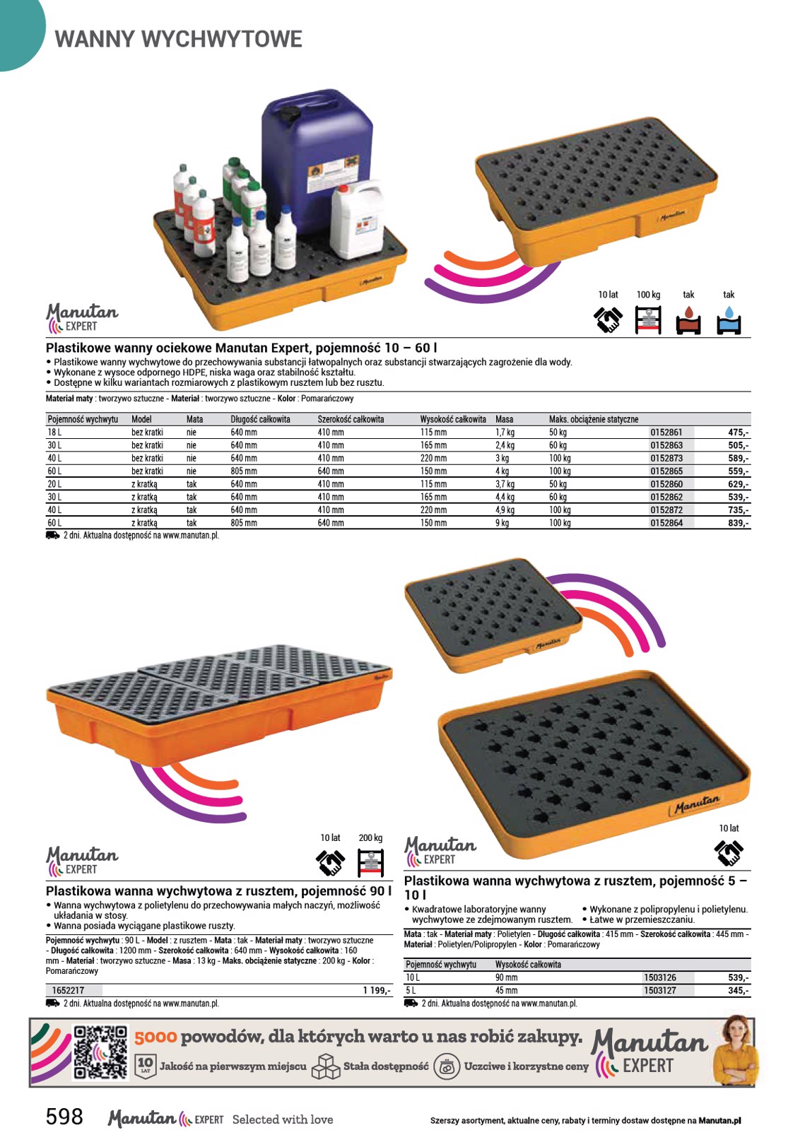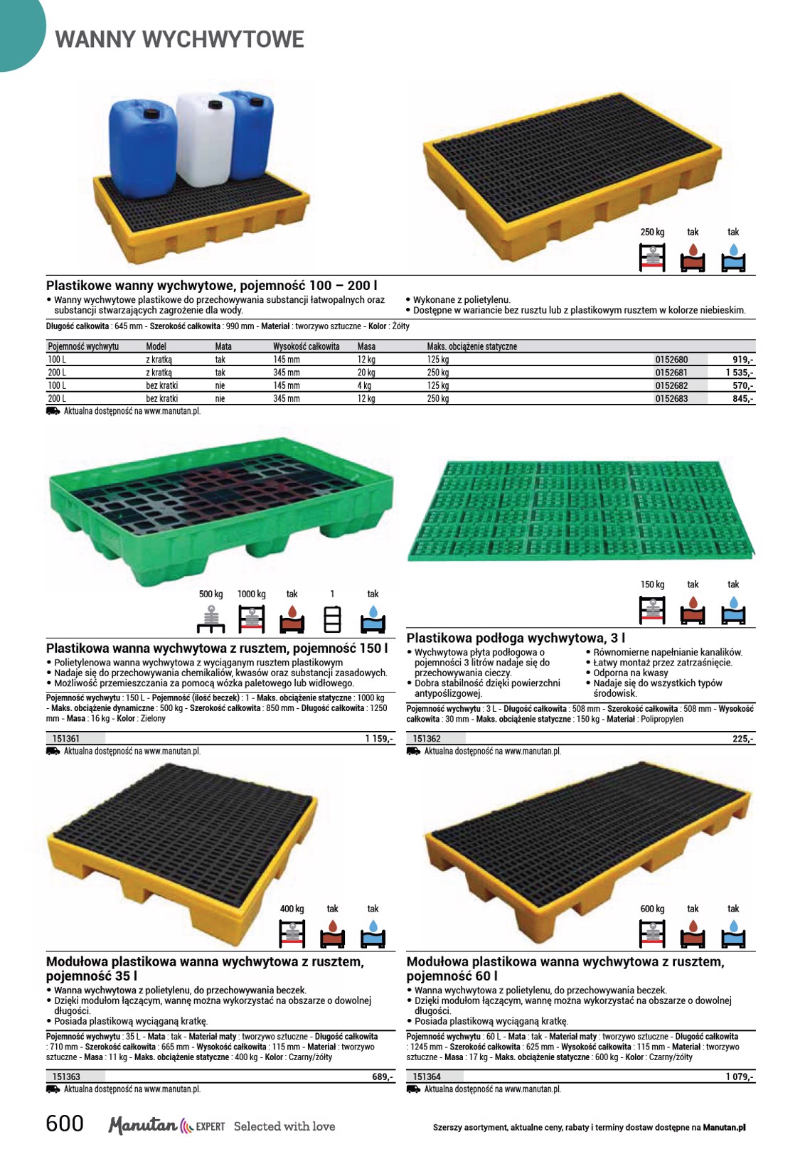 WANNY WYCHWYTOWE 10 lat 100 kg tak tak Plastikowe wanny ociekowe Manutan Expert, pojemność 10 – 60 l • Plastikowe wanny wychwytowe do przechowywania substancji łatwopalnych oraz substancji stwarzających zagrożenie dla wody. • Wykonane z wysoce odpornego HDPE, niska waga oraz stabilność kształtu. • Dostępne w kilku wariantach rozmiarowych z plastikowym rusztem lub bez rusztu. Materiał maty : tworzywo sztuczne - Materiał : tworzywo sztuczne - Kolor : Pomarańczowy Pojemność wychwytu Model Mata 18 L bez kratki nie 30 L bez kratki nie 40 L bez kratki nie 60 L bez kratki nie 20 L z kratką tak 30 L z kratką tak 40 L z kratką tak 60 L z kratką tak 2 dni. Aktualna dostępność na www.manutan.pl. Długość całkowita 640 mm 640 mm 640 mm 805 mm 640 mm 640 mm 640 mm 805 mm Szerokość całkowita 410 mm 410 mm 410 mm 640 mm 410 mm 410 mm 410 mm 640 mm Wysokość całkowita 115 mm 165 mm 220 mm 150 mm 115 mm 165 mm 220 mm 150 mm Masa 1,7 kg 2,4 kg 3 kg 4 kg 3,7 kg 4,4 kg 4,9 kg 9 kg Maks. obciążenie statyczne 50 kg 60 kg 100 kg 100 kg 50 kg 60 kg 100 kg 100 kg 0152861 0152863 0152873 0152865 0152860 0152862 0152872 0152864 475,- 505,- 589,- 559,- 629,- 539,- 735,- 839,- 10 lat 200 kg 10 lat Plastikowa wanna wychwytowa z rusztem, pojemność 90 l • Wanna wychwytowa z polietylenu do przechowywania małych naczyń, możliwość układania w stosy. • Wanna posiada wyciągane plastikowe ruszty. Pojemność wychwytu : 90 L - Model : z rusztem - Mata : tak - Materiał maty : tworzywo sztuczne - Długość całkowita : 1200 mm - Szerokość całkowita : 640 mm - Wysokość całkowita : 160 mm - Materiał : tworzywo sztuczne - Masa : 13 kg - Maks. obciążenie statyczne : 200 kg - Kolor : Pomarańczowy 1652217 2 dni. Aktualna dostępność na www.manutan.pl. 1 199,- Plastikowa wanna wychwytowa z rusztem, pojemność 5 – 10 l • Kwadratowe laboratoryjne wanny • Wykonane z polipropylenu i polietylenu. wychwytowe ze zdejmowanym rusztem. • Łatwe w przemieszczaniu. Mata : tak - Materiał maty : Polietylen - Długość całkowita : 415 mm - Szerokość całkowita : 445 mm - Materiał : Polietylen/Polipropylen - Kolor : Pomarańczowy Pojemność wychwytu Wysokość całkowita 10 L 90 mm 5 L 45 mm 2 dni. Aktualna dostępność na www.manutan.pl. 1503126 1503127 539,- 345,- 598