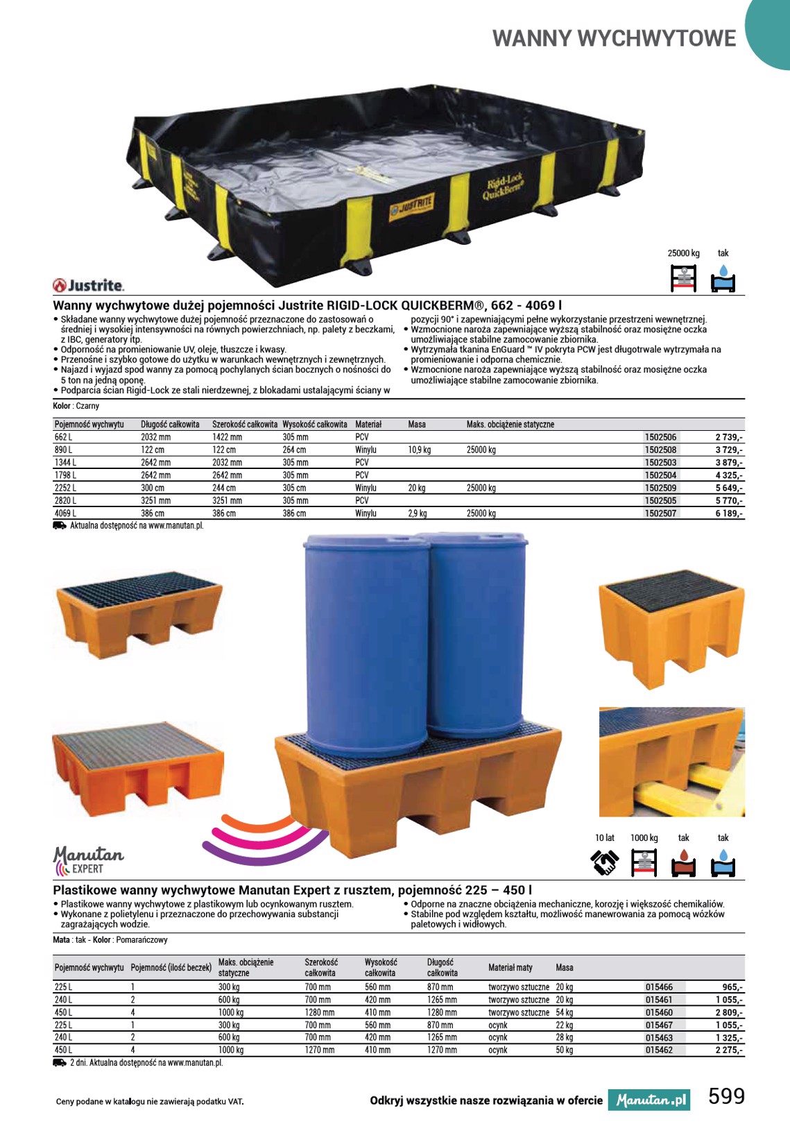 WANNY WYCHWYTOWE 25000 kg tak Wanny wychwytowe dużej pojemności Justrite RIGID-LOCK QUICKBERM®, 662 - 4069 l • Składane wanny wychwytowe dużej pojemność przeznaczone do zastosowań o pozycji 90° i zapewniającymi pełne wykorzystanie przestrzeni wewnętrznej. średniej i wysokiej intensywności na równych powierzchniach, np. palety z beczkami, • Wzmocnione naroża zapewniające wyższą stabilność oraz mosiężne oczka z IBC, generatory itp. umożliwiające stabilne zamocowanie zbiornika. • Odporność na promieniowanie UV, oleje, tłuszcze i kwasy. • Wytrzymała tkanina EnGuard ™ IV pokryta PCW jest długotrwale wytrzymała na • Przenośne i szybko gotowe do użytku w warunkach wewnętrznych i zewnętrznych. promieniowanie i odporna chemicznie. • Najazd i wyjazd spod wanny za pomocą pochylanych ścian bocznych o nośności do • Wzmocnione naroża zapewniające wyższą stabilność oraz mosiężne oczka 5 ton na jedną oponę. umożliwiające stabilne zamocowanie zbiornika. • Podparcia ścian Rigid-Lock ze stali nierdzewnej, z blokadami ustalającymi ściany w Kolor : Czarny Pojemność wychwytu Długość całkowita 662 L 2032 mm 890 L 122 cm 1344 L 2642 mm 1798 L 2642 mm 2252 L 300 cm 2820 L 3251 mm 4069 L 386 cm Aktualna dostępność na www.manutan.pl. Szerokość całkowita 1422 mm 122 cm 2032 mm 2642 mm 244 cm 3251 mm 386 cm Wysokość całkowita 305 mm 264 cm 305 mm 305 mm 305 cm 305 mm 386 cm Materiał PCV Winylu PCV PCV Winylu PCV Winylu Masa 10,9 kg 20 kg 2,9 kg Maks. obciążenie statyczne 25000 kg 25000 kg 25000 kg 1502506 1502508 1502503 1502504 1502509 1502505 1502507 2 739,- 3 729,- 3 879,- 4 325,- 5 649,- 5 770,- 6 189,- 10 lat 1000 kg tak tak Plastikowe wanny wychwytowe Manutan Expert z rusztem, pojemność 225 – 450 l • Plastikowe wanny wychwytowe z plastikowym lub ocynkowanym rusztem. • Odporne na znaczne obciążenia mechaniczne, korozję i większość chemikaliów. • Wykonane z polietylenu i przeznaczone do przechowywania substancji • Stabilne pod względem kształtu, możliwość manewrowania za pomocą wózków zagrażających wodzie. paletowych i widłowych. Mata : tak - Kolor : Pomarańczowy Pojemność wychwytu Pojemność (ilość beczek) Maks. obciążenie statyczne 225 L 1 300 kg 240 L 2 600 kg 450 L 4 1000 kg 225 L 1 300 kg 240 L 2 600 kg 450 L 4 1000 kg 2 dni. Aktualna dostępność na www.manutan.pl. Szerokość całkowita 700 mm 700 mm 1280 mm 700 mm 700 mm 1270 mm Wysokość całkowita 560 mm 420 mm 410 mm 560 mm 420 mm 410 mm Długość całkowita 870 mm 1265 mm 1280 mm 870 mm 1265 mm 1270 mm Materiał maty Masa tworzywo sztuczne 20 kg tworzywo sztuczne 20 kg tworzywo sztuczne 54 kg ocynk 22 kg ocynk 28 kg ocynk 50 kg 015466 015461 015460 015467 015463 015462 965,- 1 055,- 2 809,- 1 055,- 1 325,- 2 275,- 599