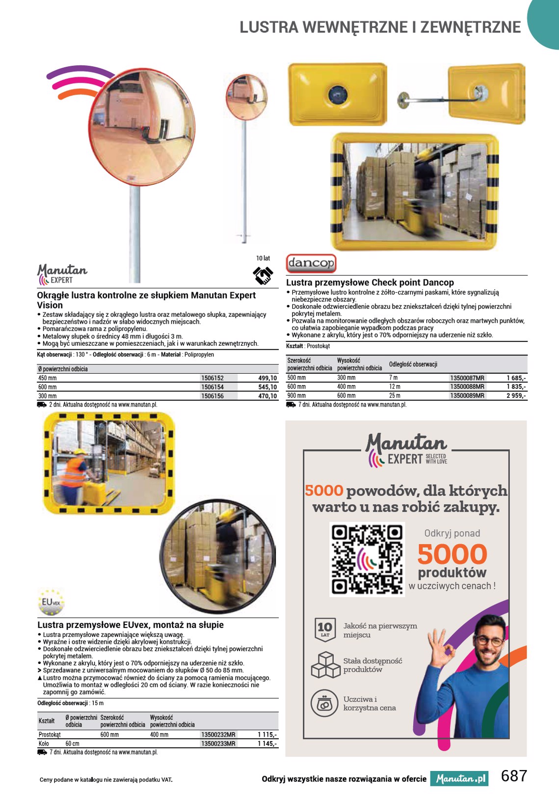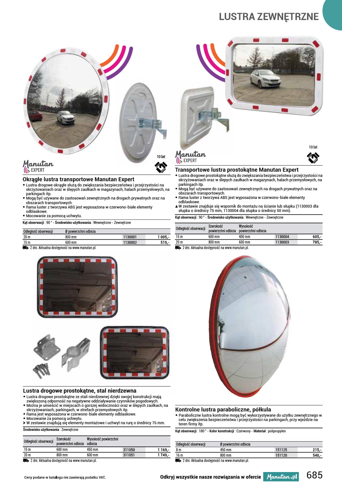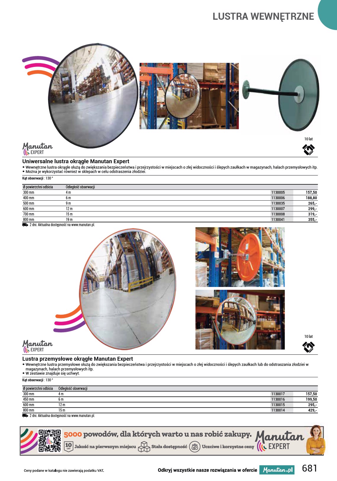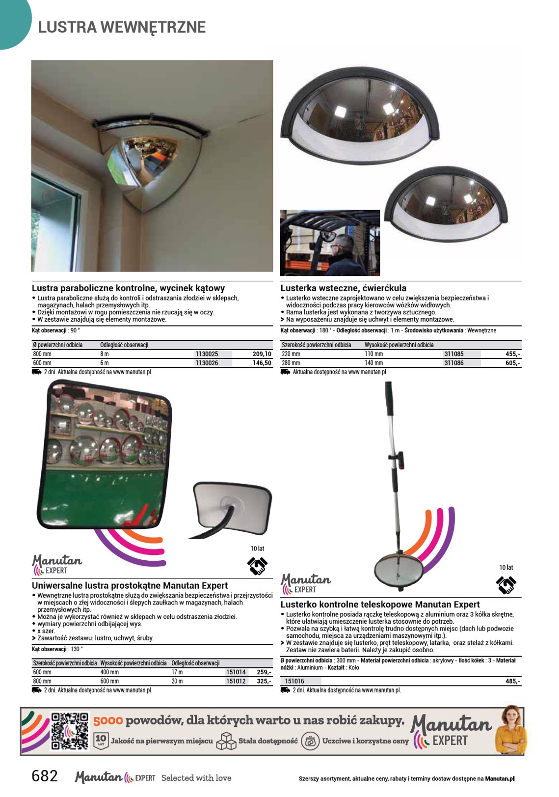 LUSTRA WEWNĘTRZNE Lustra paraboliczne kontrolne, wycinek kątowy • Lustra paraboliczne służą do kontroli i odstraszania złodziei w sklepach, magazynach, halach przemysłowych itp. • Dzięki montażowi w rogu pomieszczenia nie rzucają się w oczy. • W zestawie znajdują się elementy montażowe. Kąt obserwacji : 90 ° Ø powierzchni odbicia Odległość obserwacji 800 mm 8 m 600 mm 6 m 2 dni. Aktualna dostępność na www.manutan.pl. 1130025 1130026 209,10 146,50 Lusterka wsteczne, ćwierćkula • Lusterko wsteczne zaprojektowano w celu zwiększenia bezpieczeństwa i widoczności podczas pracy kierowców wózków widłowych. • Rama lusterka jest wykonana z tworzywa sztucznego. OO Na wyposażeniu znajduje się uchwyt i elementy montażowe. Kąt obserwacji : 180 ° - Odległość obserwacji : 1 m - Środowisko użytkowania : Wewnętrzne Szerokość powierzchni odbicia Wysokość powierzchni odbicia 220 mm 110 mm 280 mm 140 mm Aktualna dostępność na www.manutan.pl. 311085 311086 455,- 605,- 10 lat 10 lat Uniwersalne lustra prostokątne Manutan Expert • Wewnętrzne lustra prostokątne służą do zwiększania bezpieczeństwa i przejrzystości w miejscach o złej widoczności i ślepych zaułkach w magazynach, halach przemysłowych itp. • Można je wykorzystać również w sklepach w celu odstraszenia złodziei. • wymiary powierzchni odbijającej wys. • x szer. OO Zawartość zestawu: lustro, uchwyt, śruby. Kąt obserwacji : 130 ° Szerokość powierzchni odbicia Wysokość powierzchni odbicia 600 mm 400 mm 800 mm 600 mm 2 dni. Aktualna dostępność na www.manutan.pl. Odległość obserwacji 17 m 20 m 151014 151012 259,- 325,- Lusterko kontrolne teleskopowe Manutan Expert • Lusterko kontrolne posiada rączkę teleskopową z aluminium oraz 3 kółka skrętne, które ułatwiają umieszczenie lusterka stosownie do potrzeb. • Pozwala na szybką i łatwą kontrolę trudno dostępnych miejsc (dach lub podwozie samochodu, miejsca za urządzeniami maszynowymi itp.). OO W zestawie znajduje się lusterko, pręt teleskopowy, latarka, oraz stelaż z kółkami. Zestaw nie zawiera baterii. Należy je zakupić osobno. Ø powierzchni odbicia : 300 mm - Materiał powierzchni odbicia : akrylowy - Ilość kółek : 3 - Materiał nóżki : Aluminium - Kształt : Koło 151016 2 dni. Aktualna dostępność na www.manutan.pl. 485,- 682
