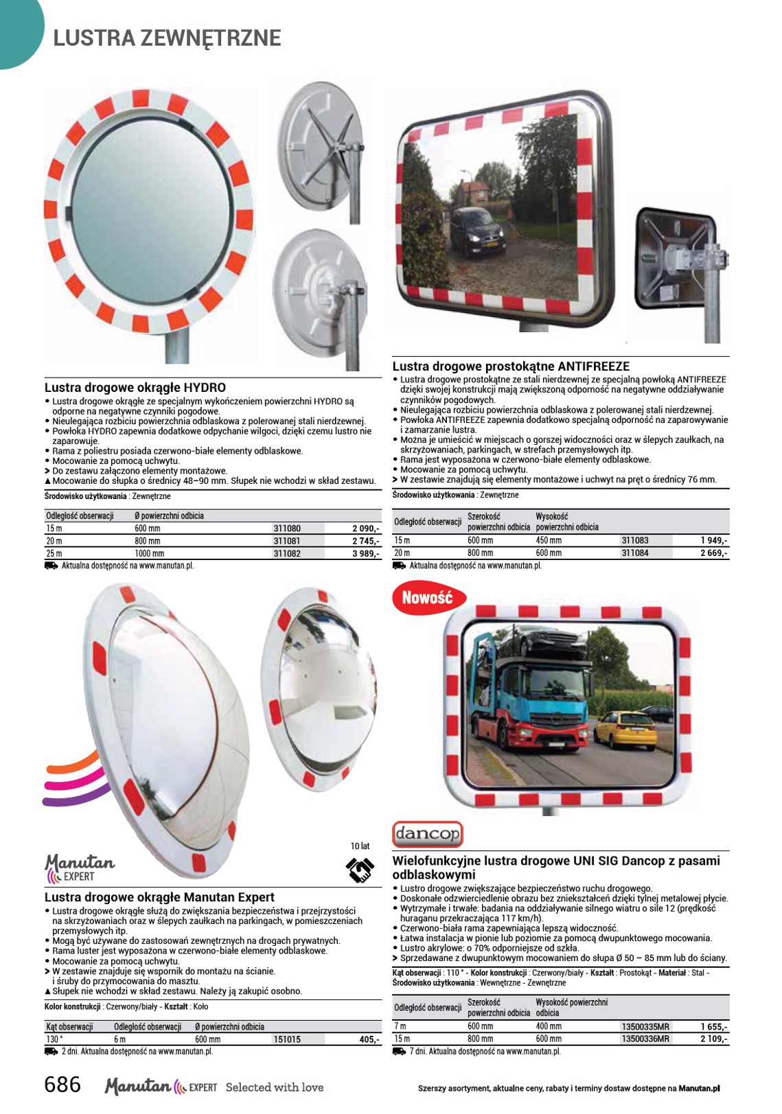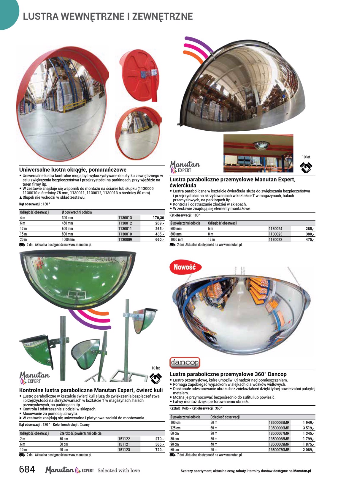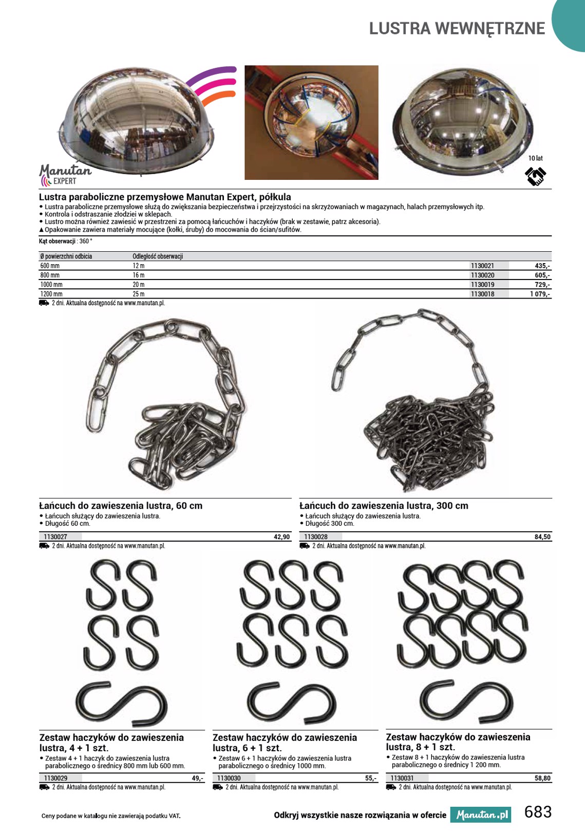 LUSTRA WEWNĘTRZNE Lustra paraboliczne przemysłowe Manutan Expert, półkula • Lustra paraboliczne przemysłowe służą do zwiększania bezpieczeństwa i przejrzystości na skrzyżowaniach w magazynach, halach przemysłowych itp. • Kontrola i odstraszanie złodziei w sklepach. • Lustro można również zawiesić w przestrzeni za pomocą łańcuchów i haczyków (brak w zestawie, patrz akcesoria). SS Opakowanie zawiera materiały mocujące (kołki, śruby) do mocowania do ścian/sufitów. Kąt obserwacji : 360 ° Ø powierzchni odbicia Odległość obserwacji 600 mm 12 m 800 mm 16 m 1000 mm 20 m 1200 mm 25 m 2 dni. Aktualna dostępność na www.manutan.pl. 1130021 1130020 1130019 1130018 10 lat 435,- 605,- 729,- 1 079,- Łańcuch do zawieszenia lustra, 60 cm • Łańcuch służący do zawieszenia lustra. • Długość 60 cm. 1130027 2 dni. Aktualna dostępność na www.manutan.pl. 42,90 Łańcuch do zawieszenia lustra, 300 cm • Łańcuch służący do zawieszenia lustra. • Długość 300 cm. 1130028 2 dni. Aktualna dostępność na www.manutan.pl. 84,50 Zestaw haczyków do zawieszenia lustra, 4 + 1 szt. • Zestaw 4 + 1 haczyk do zawieszenia lustra parabolicznego o średnicy 800 mm lub 600 mm. Zestaw haczyków do zawieszenia lustra, 6 + 1 szt. • Zestaw 6 + 1 haczyków do zawieszenia lustra parabolicznego o średnicy 1000 mm. Zestaw haczyków do zawieszenia lustra, 8 + 1 szt. • Zestaw 8 + 1 haczyków do zawieszenia lustra parabolicznego o średnicy 1 200 mm. 1130029 2 dni. Aktualna dostępność na www.manutan.pl. 49,- 1130030 2 dni. Aktualna dostępność na www.manutan.pl. 55,- 1130031 2 dni. Aktualna dostępność na www.manutan.pl. 58,80 683