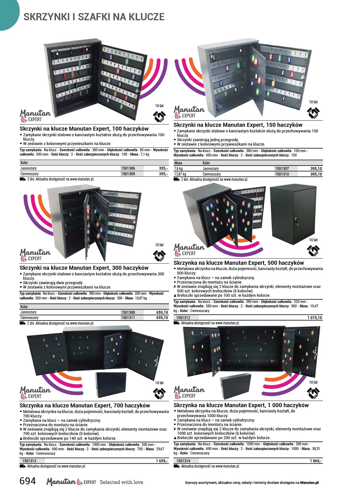 SKRZYNKI I SZAFKI NA KLUCZE Skrzynka na klucze, 64 haczyki • Metalowa zamykana skrzynka do przechowywania kluczy z numeracją na wewnętrznej stronie drzwiczek. • W zestawie numery samoprzylepne, schemat identyfikacyjny i akcesoria do montażu Typ zamykania : Na klucz - Szerokość całkowita : 300 mm - Głębokość całkowita : 80 mm - Wysokość całkowita : 450 mm - Ilość kluczy : 64 - Masa : 3,8 kg 1123007 6 dni. Aktualna dostępność na www.manutan.pl. 305,- Skrzynka na klucze, 100 haczyków • Metalowa zamykana skrzynka do przechowywania kluczy z numeracją na wewnętrznej stronie drzwiczek. • W zestawie numery samoprzylepne, schemat identyfikacyjny i akcesoria do montażu. Szerokość całkowita : 380 mm - Głębokość całkowita : 80 mm - Wysokość całkowita : 550 mm - Ilość kluczy : 100 - Masa : 5,31 kg 1123008 2 dni. Aktualna dostępność na www.manutan.pl. 420,- Skrzynka na klucze, 200 haczyków • Metalowa zamykana skrzynka do przechowywania kluczy z numeracją na wewnętrznej stronie drzwiczek. • W zestawie numery samoprzylepne, schemat identyfikacyjny i akcesoria do montażu. Szerokość całkowita : 380 mm - Głębokość całkowita : 140 mm - Wysokość całkowita : 550 mm - Ilość kluczy : 200 - Masa : 9,5 kg 1123010 2 dni. Aktualna dostępność na www.manutan.pl. 600,- Skrzynka na klucze, 300 haczyków • Szafka na klucze o dużej pojemności. OO W zestawie 2 klucze do zamykania. Typ zamykania : Na klucz - Szerokość całkowita : 380 mm - Głębokość całkowita : 205 mm - Wysokość całkowita : 550 mm - Ilość kluczy : 300 - Masa : 12,5 kg - Kolor : Szary - RAL : 7035 Przejrzysty układ dużej ilości kluczy 696 Wyprodukowany w UE 2 629,- 1509006