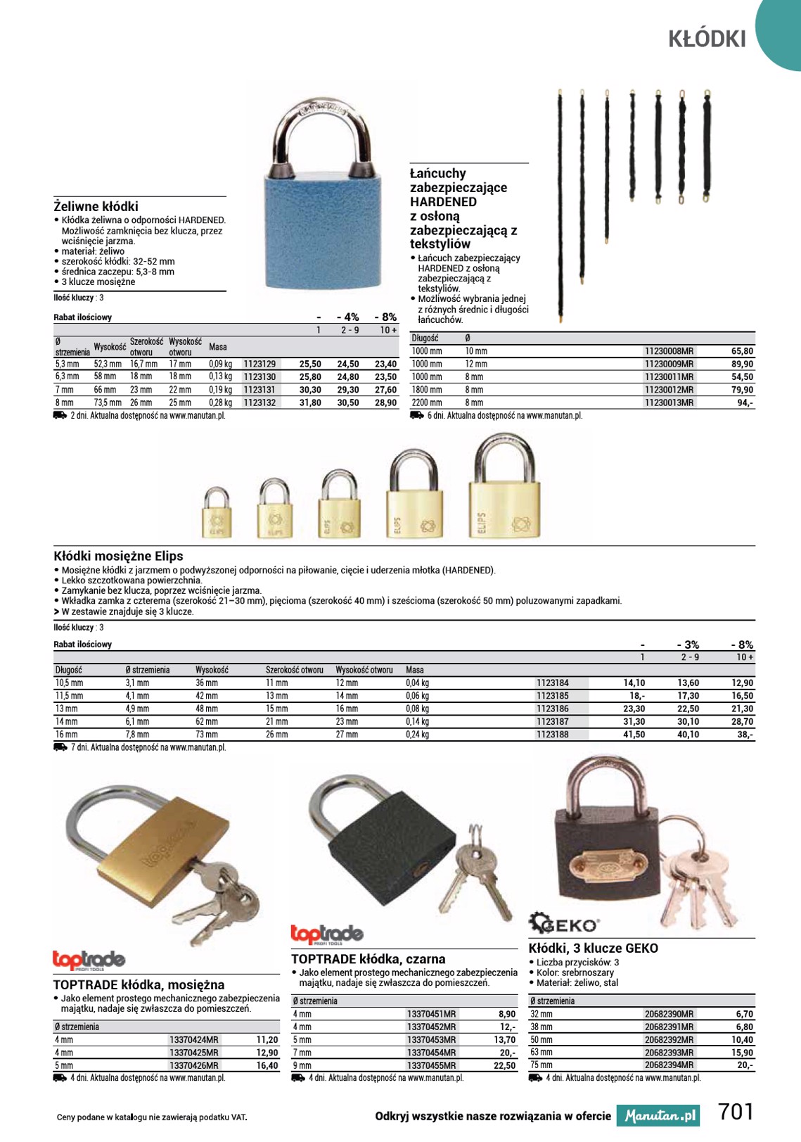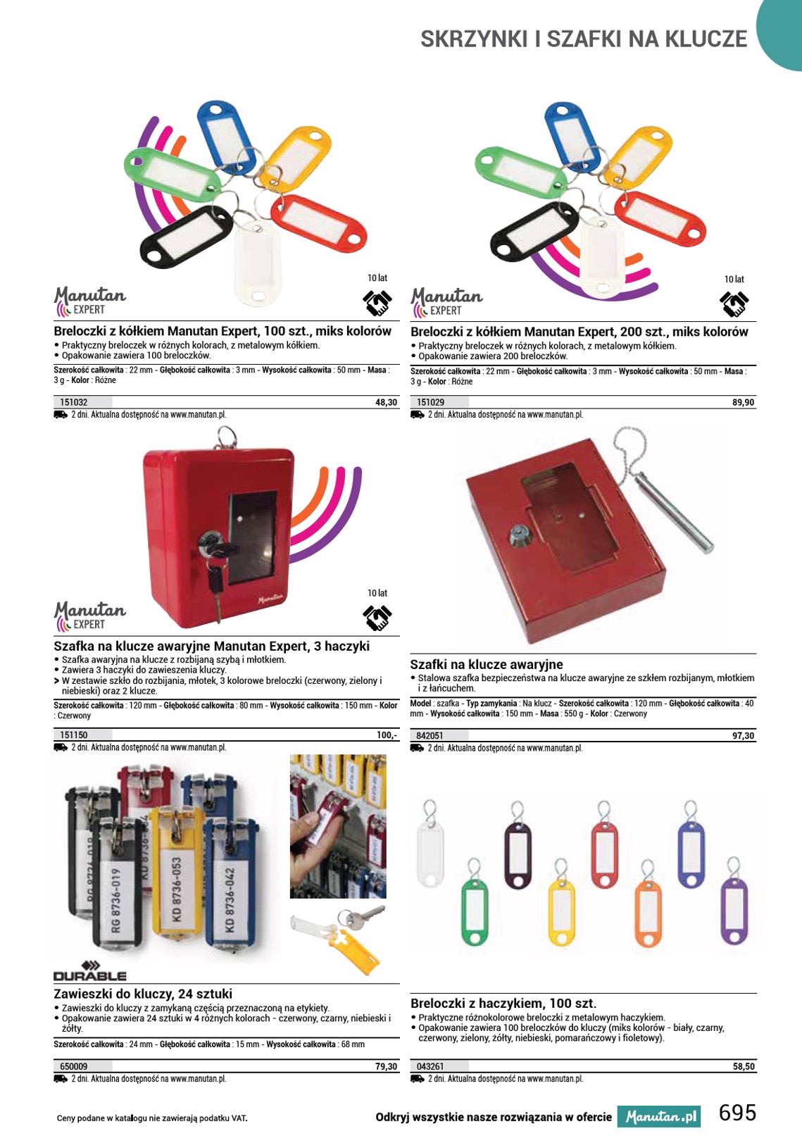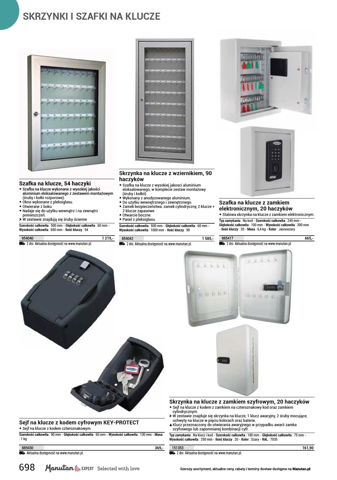 SKRZYNKI I SZAFKI NA KLUCZE Skrzynka na klucze, 36 haczyków • Stalowa zamykana szafka na klucze, w komplecie materiał montażowy do przymocowania na ścianie. Szerokość całkowita : 180 mm - Głębokość całkowita : 60 mm - Wysokość całkowita : 250 mm - Ilość kluczy : 36 - Masa : 975 g 043126 2 dni. Aktualna dostępność na www.manutan.pl. 150,- Szafka na klucze, 70 haczyków • Stalowa zamykana szafka na klucze, w komplecie materiaĹ‚ montaĹĽowy do przymocowania na Ĺ›cianie. Szerokość całkowita : 280 mm - Głębokość całkowita : 60 mm - Wysokość całkowita : 370 mm - Ilość kluczy : 70 - Masa : 2,5 kg 043127 2 dni. Aktualna dostępność na www.manutan.pl. 220,- Szafka na klucze, 110 haczyków • Stalowa zamykana szafka na klucze, w komplecie materiaĹ‚ montaĹĽowy do przymocowania na Ĺ›cianie. Szerokość całkowita : 280 mm - Głębokość całkowita : 80 mm - Wysokość całkowita : 370 mm - Ilość kluczy : 110 - Masa : 2,7 kg 043128 2 dni. Aktualna dostępność na www.manutan.pl. 265,- Szafka na klucze ze spisem zawartości, 51 haczyków • Metalowa szafka przeznaczona do przechowywania kluczy, ze spisem zawartości umieszczonym na wewnętrznej stronie drzwiczek. • Grubość stalowej płyty drzwi wynosi 1,5 mm. • Skrzynkę można łatwo przymocować do ściany za pomocą trzech otworów w tylnej ścianie. OO Akcesoria obejmują śruby i kołki. Typ zamykania : Na klucz - Szerokość całkowita : 242 mm - Głębokość całkowita : 40 mm - Wysokość całkowita : 342 mm - Ilość kluczy : 51 - Masa : 2,9 kg - Kolor : Antracyt 050035 2 dni. Aktualna dostępność na www.manutan.pl. 153,30 Panel na klucze, 24 klucze • Panel z tworzywa na klucze do mococwania na ścianie na cztery rzędy kluczy. • W komplecie zestaw sześciu różnokolorywch zawieszek na klucze. Szerokość całkowita : 210 mm - Wysokość całkowita : 400 mm - Ilość kluczy : 24 - Kolor : Szary 650004 2 dni. Aktualna dostępność na www.manutan.pl. 182,- 697