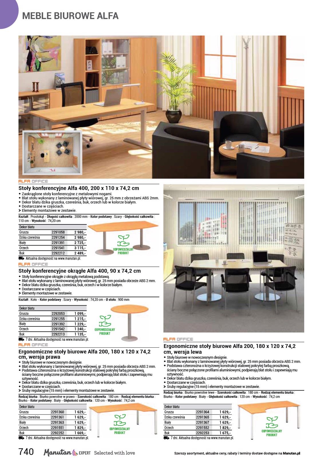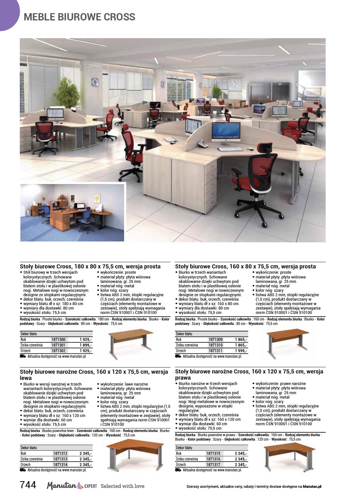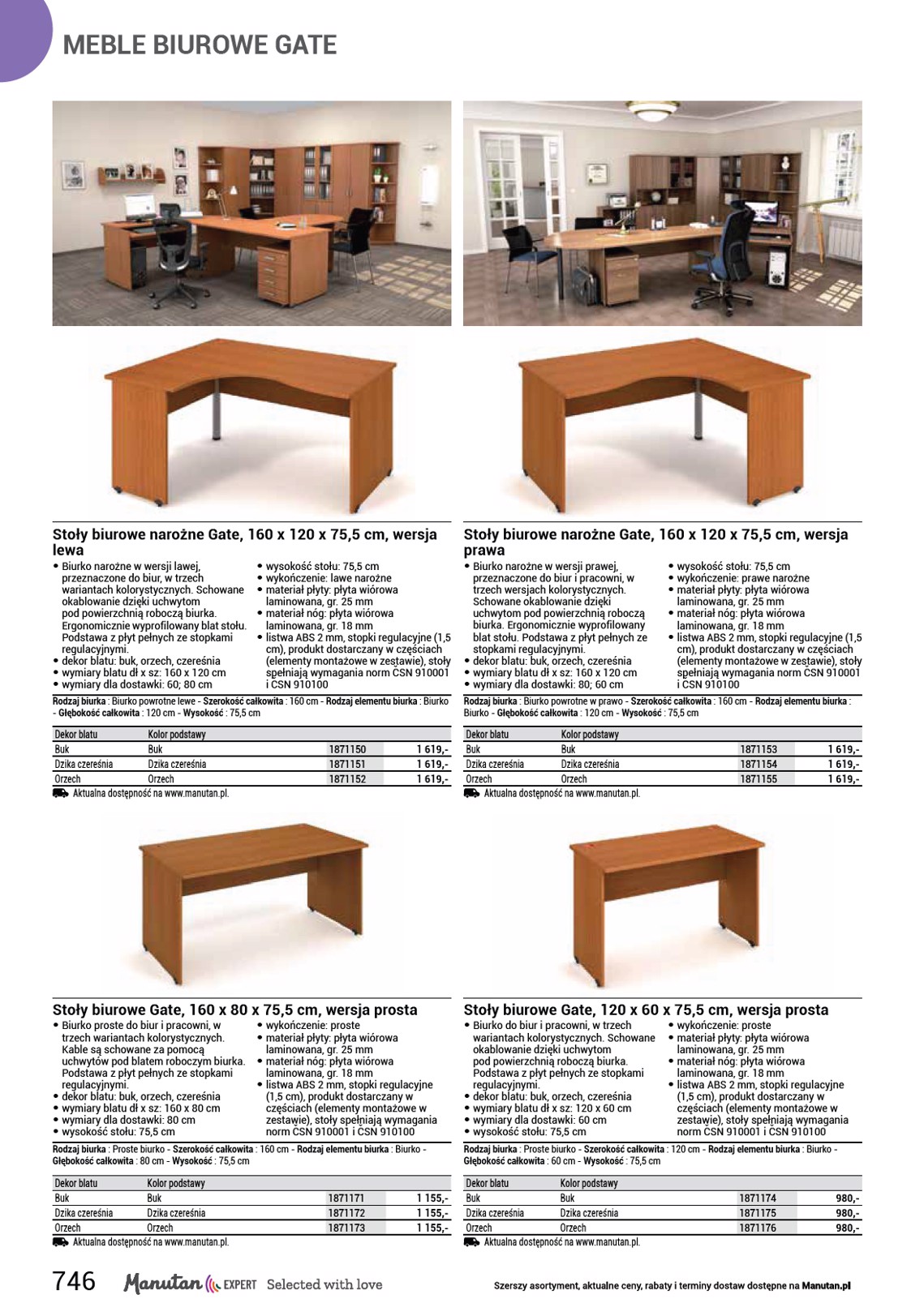 MEBLE BIUROWE GATE Stoły biurowe narożne Gate, 160 x 120 x 75,5 cm, wersja lewa • Biurko narożne w wersji lawej, • wysokość stołu: 75,5 cm przeznaczone do biur, w trzech • wykończenie: lawe narożne wariantach kolorystycznych. Schowane • materiał płyty: płyta wiórowa okablowanie dzięki uchwytom laminowana, gr. 25 mm pod powierzchnią roboczą biurka. • materiał nóg: płyta wiórowa Ergonomicznie wyprofilowany blat stołu. laminowana, gr. 18 mm Podstawa z płyt pełnych ze stopkami • listwa ABS 2 mm, stopki regulacyjne (1,5 regulacyjnymi. cm), produkt dostarczany w częściach • dekor blatu: buk, orzech, czereśnia (elementy montażowe w zestawie), stoły • wymiary blatu dł x sz: 160 x 120 cm spełniają wymagania norm ČSN 910001 • wymiary dla dostawki: 60; 80 cm i ČSN 910100 Rodzaj biurka : Biurko powrotne lewe - Szerokość całkowita : 160 cm - Rodzaj elementu biurka : Biurko - Głębokość całkowita : 120 cm - Wysokość : 75,5 cm Dekor blatu Kolor podstawy Buk Buk Dzika czereśnia Dzika czereśnia Orzech Orzech Aktualna dostępność na www.manutan.pl. 1871150 1871151 1871152 1 619,- 1 619,- 1 619,- Stoły biurowe narożne Gate, prawa • Biurko narożne w wersji prawej, przeznaczone do biur i pracowni, w trzech wersjach kolorystycznych. Schowane okablowanie dzięki uchwytom pod powierzchnią roboczą biurka. Ergonomicznie wyprofilowany blat stołu. Podstawa z płyt pełnych ze stopkami regulacyjnymi. • dekor blatu: buk, orzech, czereśnia • wymiary blatu dł x sz: 160 x 120 cm • wymiary dla dostawki: 80; 60 cm 160 x 120 x 75,5 cm, wersja • wysokość stołu: 75,5 cm • wykończenie: prawe narożne • materiał płyty: płyta wiórowa laminowana, gr. 25 mm • materiał nóg: płyta wiórowa laminowana, gr. 18 mm • listwa ABS 2 mm, stopki regulacyjne (1,5 cm), produkt dostarczany w częściach (elementy montażowe w zestawie), stoły spełniają wymagania norm ČSN 910001 i ČSN 910100 Rodzaj biurka : Biurko powrotne w prawo - Szerokość całkowita : 160 cm - Rodzaj elementu biurka : Biurko - Głębokość całkowita : 120 cm - Wysokość : 75,5 cm Dekor blatu Kolor podstawy Buk Buk Dzika czereśnia Dzika czereśnia Orzech Orzech Aktualna dostępność na www.manutan.pl. 1871153 1871154 1871155 1 619,- 1 619,- 1 619,- Stoły biurowe Gate, 160 x 80 • Biurko proste do biur i pracowni, w trzech wariantach kolorystycznych. Kable są schowane za pomocą uchwytów pod blatem roboczym biurka. Podstawa z płyt pełnych ze stopkami regulacyjnymi. • dekor blatu: buk, orzech, czereśnia • wymiary blatu dł x sz: 160 x 80 cm • wymiary dla dostawki: 80 cm • wysokość stołu: 75,5 cm x 75,5 cm, wersja prosta • wykończenie: proste • materiał płyty: płyta wiórowa laminowana, gr. 25 mm • materiał nóg: płyta wiórowa laminowana, gr. 18 mm • listwa ABS 2 mm, stopki regulacyjne (1,5 cm), produkt dostarczany w częściach (elementy montażowe w zestawie), stoły spełniają wymagania norm ČSN 910001 i ČSN 910100 Rodzaj biurka : Proste biurko - Szerokość całkowita : 160 cm - Rodzaj elementu biurka : Biurko - Głębokość całkowita : 80 cm - Wysokość : 75,5 cm Dekor blatu Kolor podstawy Buk Buk Dzika czereśnia Dzika czereśnia Orzech Orzech Aktualna dostępność na www.manutan.pl. 1871171 1871172 1871173 1 155,- 1 155,- 1 155,- Stoły biurowe Gate, 120 x 60 • Biurko do biur i pracowni, w trzech wariantach kolorystycznych. Schowane okablowanie dzięki uchwytom pod powierzchnią roboczą biurka. Podstawa z płyt pełnych ze stopkami regulacyjnymi. • dekor blatu: buk, orzech, czereśnia • wymiary blatu dł x sz: 120 x 60 cm • wymiary dla dostawki: 60 cm • wysokość stołu: 75,5 cm x 75,5 cm, wersja prosta • wykończenie: proste • materiał płyty: płyta wiórowa laminowana, gr. 25 mm • materiał nóg: płyta wiórowa laminowana, gr. 18 mm • listwa ABS 2 mm, stopki regulacyjne (1,5 cm), produkt dostarczany w częściach (elementy montażowe w zestawie), stoły spełniają wymagania norm ČSN 910001 i ČSN 910100 Rodzaj biurka : Proste biurko - Szerokość całkowita : 120 cm - Rodzaj elementu biurka : Biurko - Głębokość całkowita : 60 cm - Wysokość : 75,5 cm Dekor blatu Kolor podstawy Buk Buk Dzika czereśnia Dzika czereśnia Orzech Orzech Aktualna dostępność na www.manutan.pl. 1871174 1871175 1871176 980,- 980,- 980,- 746