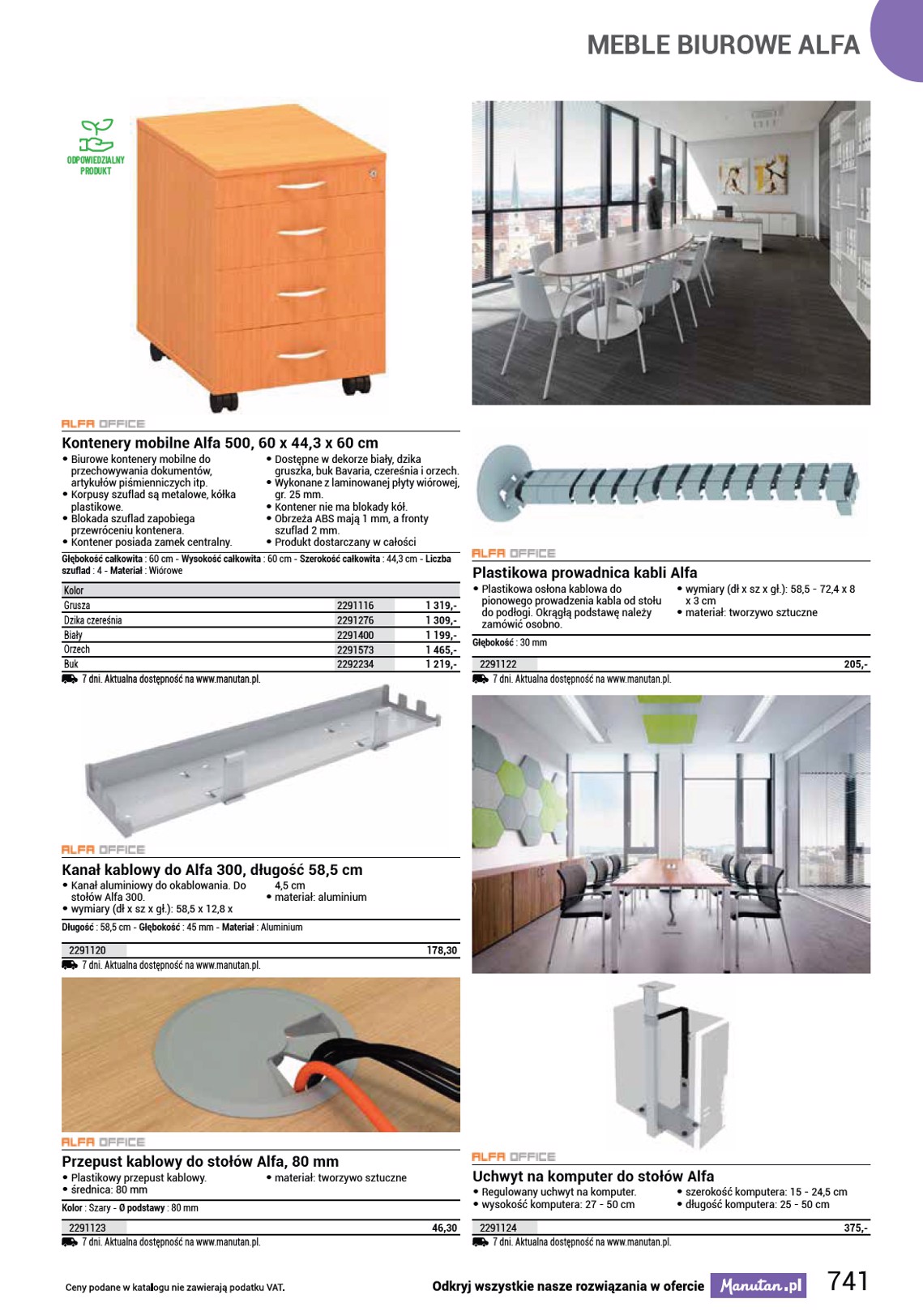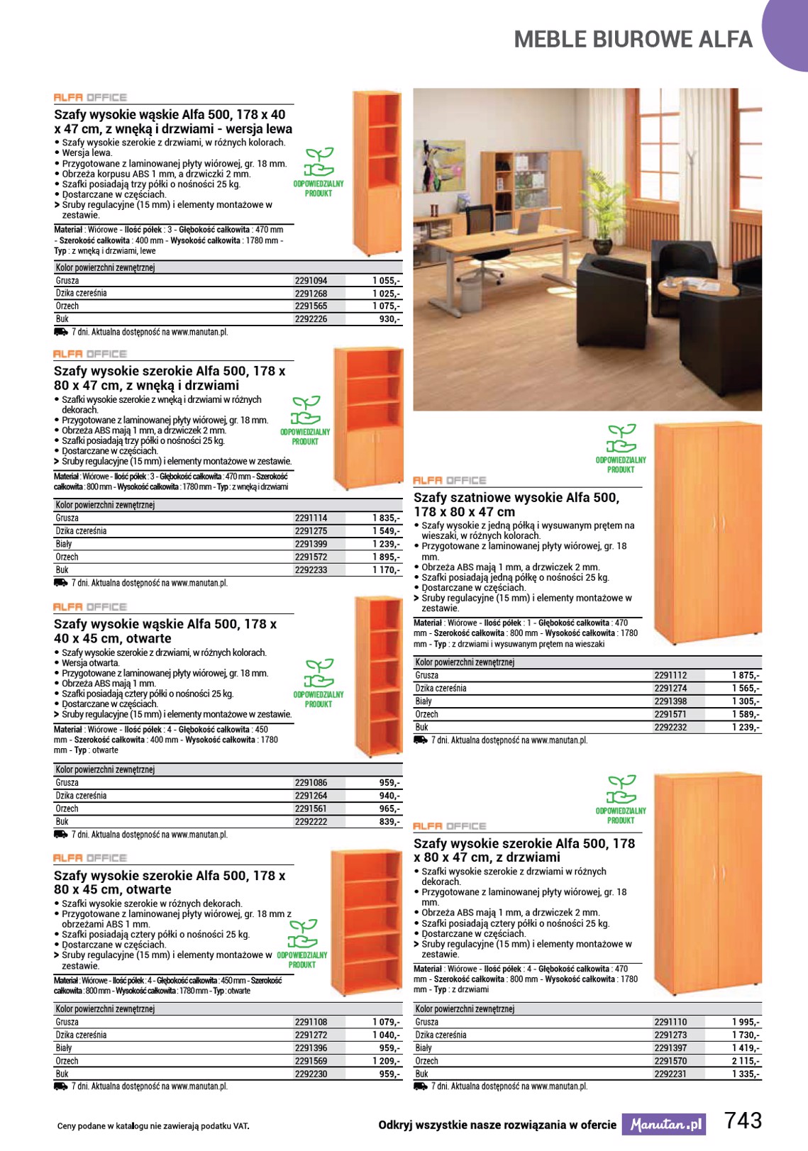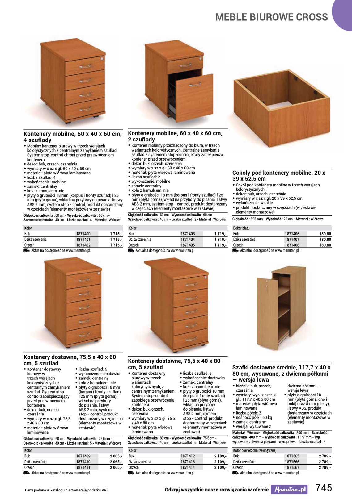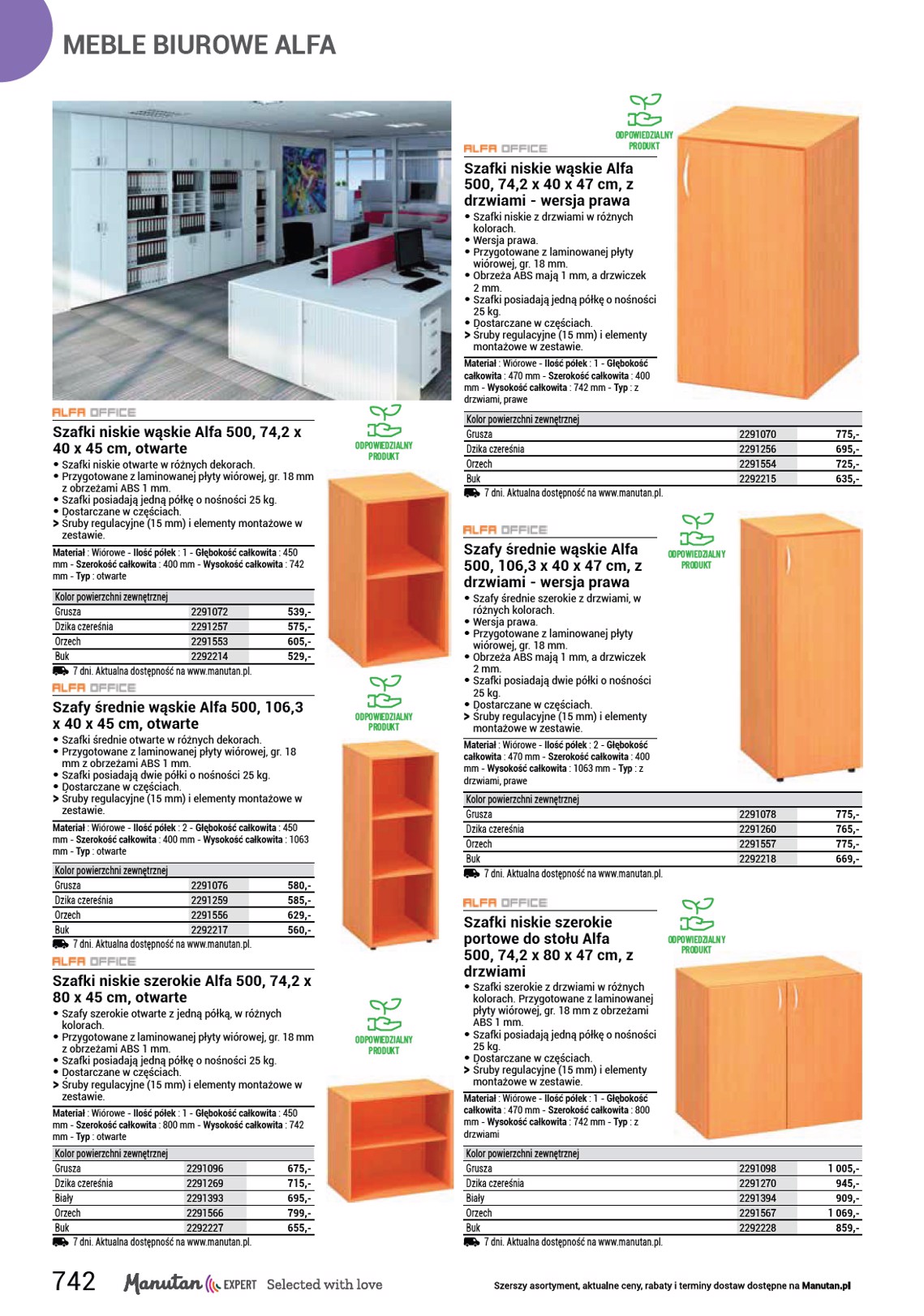 MEBLE BIUROWE GATE Stoły biurowe narożne Gate, 160 x 120 x 75,5 cm, wersja lewa • Biurko narożne w wersji lawej, • wysokość stołu: 75,5 cm przeznaczone do biur, w trzech • wykończenie: lawe narożne wariantach kolorystycznych. Schowane • materiał płyty: płyta wiórowa okablowanie dzięki uchwytom laminowana, gr. 25 mm pod powierzchnią roboczą biurka. • materiał nóg: płyta wiórowa Ergonomicznie wyprofilowany blat stołu. laminowana, gr. 18 mm Podstawa z płyt pełnych ze stopkami • listwa ABS 2 mm, stopki regulacyjne (1,5 regulacyjnymi. cm), produkt dostarczany w częściach • dekor blatu: buk, orzech, czereśnia (elementy montażowe w zestawie), stoły • wymiary blatu dł x sz: 160 x 120 cm spełniają wymagania norm ČSN 910001 • wymiary dla dostawki: 60; 80 cm i ČSN 910100 Rodzaj biurka : Biurko powrotne lewe - Szerokość całkowita : 160 cm - Rodzaj elementu biurka : Biurko - Głębokość całkowita : 120 cm - Wysokość : 75,5 cm Dekor blatu Kolor podstawy Buk Buk Dzika czereśnia Dzika czereśnia Orzech Orzech Aktualna dostępność na www.manutan.pl. 1871150 1871151 1871152 1 619,- 1 619,- 1 619,- Stoły biurowe narożne Gate, prawa • Biurko narożne w wersji prawej, przeznaczone do biur i pracowni, w trzech wersjach kolorystycznych. Schowane okablowanie dzięki uchwytom pod powierzchnią roboczą biurka. Ergonomicznie wyprofilowany blat stołu. Podstawa z płyt pełnych ze stopkami regulacyjnymi. • dekor blatu: buk, orzech, czereśnia • wymiary blatu dł x sz: 160 x 120 cm • wymiary dla dostawki: 80; 60 cm 160 x 120 x 75,5 cm, wersja • wysokość stołu: 75,5 cm • wykończenie: prawe narożne • materiał płyty: płyta wiórowa laminowana, gr. 25 mm • materiał nóg: płyta wiórowa laminowana, gr. 18 mm • listwa ABS 2 mm, stopki regulacyjne (1,5 cm), produkt dostarczany w częściach (elementy montażowe w zestawie), stoły spełniają wymagania norm ČSN 910001 i ČSN 910100 Rodzaj biurka : Biurko powrotne w prawo - Szerokość całkowita : 160 cm - Rodzaj elementu biurka : Biurko - Głębokość całkowita : 120 cm - Wysokość : 75,5 cm Dekor blatu Kolor podstawy Buk Buk Dzika czereśnia Dzika czereśnia Orzech Orzech Aktualna dostępność na www.manutan.pl. 1871153 1871154 1871155 1 619,- 1 619,- 1 619,- Stoły biurowe Gate, 160 x 80 • Biurko proste do biur i pracowni, w trzech wariantach kolorystycznych. Kable są schowane za pomocą uchwytów pod blatem roboczym biurka. Podstawa z płyt pełnych ze stopkami regulacyjnymi. • dekor blatu: buk, orzech, czereśnia • wymiary blatu dł x sz: 160 x 80 cm • wymiary dla dostawki: 80 cm • wysokość stołu: 75,5 cm x 75,5 cm, wersja prosta • wykończenie: proste • materiał płyty: płyta wiórowa laminowana, gr. 25 mm • materiał nóg: płyta wiórowa laminowana, gr. 18 mm • listwa ABS 2 mm, stopki regulacyjne (1,5 cm), produkt dostarczany w częściach (elementy montażowe w zestawie), stoły spełniają wymagania norm ČSN 910001 i ČSN 910100 Rodzaj biurka : Proste biurko - Szerokość całkowita : 160 cm - Rodzaj elementu biurka : Biurko - Głębokość całkowita : 80 cm - Wysokość : 75,5 cm Dekor blatu Kolor podstawy Buk Buk Dzika czereśnia Dzika czereśnia Orzech Orzech Aktualna dostępność na www.manutan.pl. 1871171 1871172 1871173 1 155,- 1 155,- 1 155,- Stoły biurowe Gate, 120 x 60 • Biurko do biur i pracowni, w trzech wariantach kolorystycznych. Schowane okablowanie dzięki uchwytom pod powierzchnią roboczą biurka. Podstawa z płyt pełnych ze stopkami regulacyjnymi. • dekor blatu: buk, orzech, czereśnia • wymiary blatu dł x sz: 120 x 60 cm • wymiary dla dostawki: 60 cm • wysokość stołu: 75,5 cm x 75,5 cm, wersja prosta • wykończenie: proste • materiał płyty: płyta wiórowa laminowana, gr. 25 mm • materiał nóg: płyta wiórowa laminowana, gr. 18 mm • listwa ABS 2 mm, stopki regulacyjne (1,5 cm), produkt dostarczany w częściach (elementy montażowe w zestawie), stoły spełniają wymagania norm ČSN 910001 i ČSN 910100 Rodzaj biurka : Proste biurko - Szerokość całkowita : 120 cm - Rodzaj elementu biurka : Biurko - Głębokość całkowita : 60 cm - Wysokość : 75,5 cm Dekor blatu Kolor podstawy Buk Buk Dzika czereśnia Dzika czereśnia Orzech Orzech Aktualna dostępność na www.manutan.pl. 1871174 1871175 1871176 980,- 980,- 980,- 746