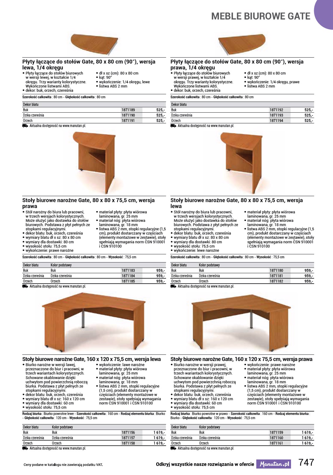 MEBLE BIUROWE GATE Płyty łączące do stołów Gate, 80 x 80 cm (90°), wersja lewa, 1/4 okręgu • Płyty łączące do stołów biurowych • dł x sz (cm): 80 x 80 cm w wersji lewej, w kształcie 1/4 • kąt: 90° okręgu. Trzy warianty kolorystyczne. • wykończenie: 1/4 okręgu, lewe Wykończone listwami ABS. • listwa ABS 2 mm • dekor: buk, orzech, czereśnia Szerokość całkowita : 80 cm - Głębokość całkowita : 80 cm Dekor blatu Buk Dzika czereśnia Orzech Aktualna dostępność na www.manutan.pl. 1871189 1871190 1871191 525,- 525,- 525,- Płyty łączące do stołów Gate, 80 x 80 cm (90°), wersja prawa, 1/4 okręgu • Płyty łączące do stołów biurowych • dł x sz (cm): 80 x 80 cm w wersji prawej, w kształcie 1/4 • kąt: 90° okręgu. Trzy warianty kolorystyczne. • wykończenie: 1/4 okręgu, prawe Wykończone listwami ABS. • listwa ABS 2 mm • dekor: buk, orzech, czereśnia Szerokość całkowita : 80 cm - Głębokość całkowita : 80 cm Dekor blatu Buk Dzika czereśnia Orzech Aktualna dostępność na www.manutan.pl. 1871192 1871193 1871194 525,- 525,- 525,- Stoły biurowe narożne Gate, prawa • Stół narożny do biura lub pracowni, w trzech wersjach kolorystycznych. Może służyć jako dostawka do stołów biurowych. Podstawa z płyt pełnych ze stopkami regulacyjnymi. • dekor blatu: buk, orzech, czereśnia • wymiary blatu dł x sz: 80 x 80 cm • wymiary dla dostawki: 80 cm • wysokość stołu: 75,5 cm • wykończenie: prawe narożne 80 x 80 x 75,5 cm, wersja • materiał płyty: płyta wiórowa laminowana, gr. 25 mm • materiał nóg: płyta wiórowa laminowana, gr. 18 mm • listwa ABS 2 mm, stopki regulacyjne (1,5 cm), produkt dostarczany w częściach (elementy montażowe w zestawie), stoły spełniają wymagania norm ČSN 910001 i ČSN 910100 Szerokość całkowita : 80 cm - Głębokość całkowita : 80 cm - Wysokość : 75,5 cm Dekor blatu Kolor podstawy Buk Buk Dzika czereśnia Dzika czereśnia Orzech Orzech Aktualna dostępność na www.manutan.pl. 1871183 1871184 1871185 959,- 959,- 959,- Stoły biurowe narożne Gate, lewa • Stół narożny do biura lub pracowni, w trzech wersjach kolorystycznych. Może służyć jako dostawka do stołów biurowych. Podstawa z płyt pełnych ze stopkami regulacyjnymi. • dekor blatu: buk, orzech, czereśnia • wymiary blatu dł x sz: 80 x 80 cm • wymiary dla dostawki: 80 cm • wysokość stołu: 75,5 cm • wykończenie: lewe narożne 80 x 80 x 75,5 cm, wersja • materiał płyty: płyta wiórowa laminowana, gr. 25 mm • materiał nóg: płyta wiórowa laminowana, gr. 18 mm • listwa ABS 2 mm, stopki regulacyjne (1,5 cm), produkt dostarczany w częściach (elementy montażowe w zestawie), stoły spełniają wymagania norm ČSN 910001 i ČSN 910100 Szerokość całkowita : 80 cm - Głębokość całkowita : 80 cm - Wysokość : 75,5 cm Dekor blatu Kolor podstawy Buk Buk Dzika czereśnia Dzika czereśnia Orzech Orzech Aktualna dostępność na www.manutan.pl. 1871180 1871181 1871182 959,- 959,- 959,- Stoły biurowe narożne Gate, 160 x 120 x 75,5 cm, wersja lewa • Biurko narożne w wersji lawej, • wykończenie: lawe narożne przeznaczone do biur i pracowni, w • materiał płyty: płyta wiórowa trzech wariantach kolorystycznych. laminowana, gr. 25 mm Schowane okablowanie dzięki • materiał nóg: płyta wiórowa uchwytom pod powierzchnią roboczą laminowana, gr. 18 mm biurka. Podstawa z płyt pełnych ze • listwa ABS 2 mm, stopki regulacyjne stopkami regulacyjnymi. (1,5 cm), produkt dostarczany w • dekor blatu: buk, orzech, czereśnia częściach (elementy montażowe w • wymiary blatu dł x sz: 160 x 120 cm zestawie), stoły spełniają wymagania • wymiary dla dostawki: 60 cm norm ČSN 910001 i ČSN 910100 • wysokość stołu: 75,5 cm Rodzaj biurka : Biurko powrotne lewe - Szerokość całkowita : 160 cm - Rodzaj elementu biurka : Biurko - Głębokość całkowita : 120 cm - Wysokość : 75,5 cm Stoły biurowe narożne Gate, 160 x 120 x 75,5 cm, wersja prawa • Biurko narożne w wersji prawej, • wykończenie: prawe narożne przeznaczone do biur i pracowni, w • materiał płyty: płyta wiórowa trzech wariantach kolorystycznych. laminowana, gr. 25 mm Schowane okablowanie dzięki • materiał nóg: płyta wiórowa uchwytom pod powierzchnią roboczą laminowana, gr. 18 mm biurka. Podstawa z płyt pełnych ze • listwa ABS 2 mm, stopki regulacyjne stopkami regulacyjnymi. (1,5 cm), produkt dostarczany w • dekor blatu: buk, orzech, czereśnia częściach (elementy montażowe w • wymiary blatu dł x sz: 160 x 120 cm zestawie), stoły spełniają wymagania • wymiary dla dostawki: 60 cm norm ČSN 910001 i ČSN 910100 • wysokość stołu: 75,5 cm Rodzaj biurka : Biurko powrotne w prawo - Szerokość całkowita : 160 cm - Rodzaj elementu biurka : Biurko - Głębokość całkowita : 120 cm - Wysokość : 75,5 cm Dekor blatu Kolor podstawy Buk Buk Dzika czereśnia Dzika czereśnia Orzech Orzech Aktualna dostępność na www.manutan.pl. 1871156 1871157 1871158 1 619,- 1 619,- 1 619,- Dekor blatu Kolor podstawy Buk Buk Dzika czereśnia Dzika czereśnia Orzech Orzech Aktualna dostępność na www.manutan.pl. 1871159 1871160 1871161 1 619,- 1 619,- 1 619,- 747