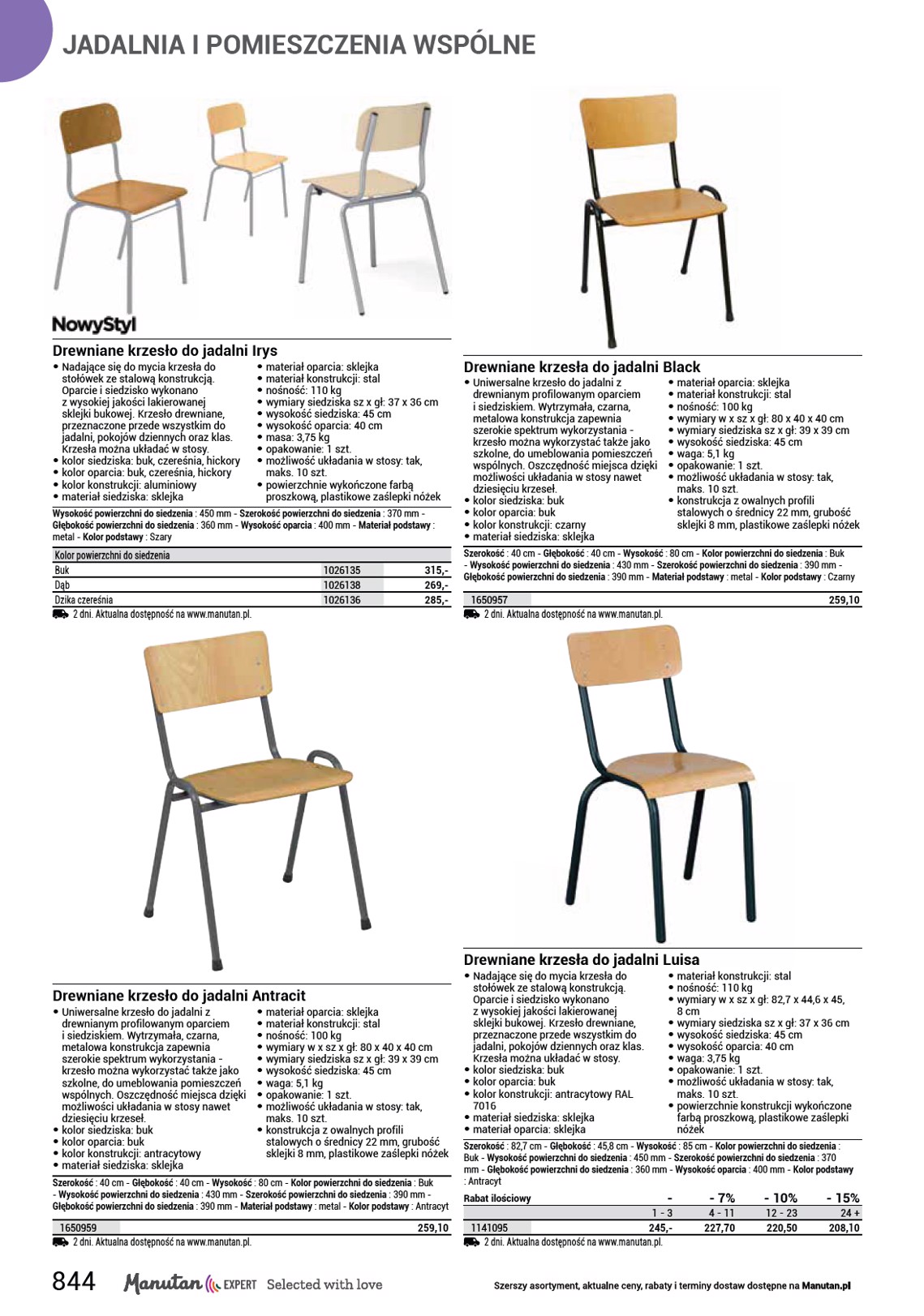 JADALNIA I POMIESZCZENIA WSPÓLNE Drewniane krzesło do jadalni • Nadające się do mycia krzesła do stołówek ze stalową konstrukcją. Oparcie i siedzisko wykonano z wysokiej jakości lakierowanej sklejki bukowej. Krzesło drewniane, przeznaczone przede wszystkim do jadalni, pokojów dziennych oraz klas. Krzesła można układać w stosy. • kolor siedziska: buk, czereśnia, hickory • kolor oparcia: buk, czereśnia, hickory • kolor konstrukcji: aluminiowy • materiał siedziska: sklejka Irys • materiał oparcia: sklejka • materiał konstrukcji: stal • nośność: 110 kg • wymiary siedziska sz x gł: 37 x 36 cm • wysokość siedziska: 45 cm • wysokość oparcia: 40 cm • masa: 3,75 kg • opakowanie: 1 szt. • możliwość układania w stosy: tak, maks. 10 szt. • powierzchnie wykończone farbą proszkową, plastikowe zaślepki nóżek Wysokość powierzchni do siedzenia : 450 mm - Szerokość powierzchni do siedzenia : 370 mm - Głębokość powierzchni do siedzenia : 360 mm - Wysokość oparcia : 400 mm - Materiał podstawy : metal - Kolor podstawy : Szary Kolor powierzchni do siedzenia Buk Dąb Dzika czereśnia 2 dni. Aktualna dostępność na www.manutan.pl. 1026135 1026138 1026136 315,- 269,- 285,- Drewniane krzesła do jadalni • Uniwersalne krzesło do jadalni z drewnianym profilowanym oparciem i siedziskiem. Wytrzymała, czarna, metalowa konstrukcja zapewnia szerokie spektrum wykorzystania - krzesło można wykorzystać także jako szkolne, do umeblowania pomieszczeń wspólnych. Oszczędność miejsca dzięki możliwości układania w stosy nawet dziesięciu krzeseł. • kolor siedziska: buk • kolor oparcia: buk • kolor konstrukcji: czarny • materiał siedziska: sklejka Black • materiał oparcia: sklejka • materiał konstrukcji: stal • nośność: 100 kg • wymiary w x sz x gł: 80 x 40 x 40 cm • wymiary siedziska sz x gł: 39 x 39 cm • wysokość siedziska: 45 cm • waga: 5,1 kg • opakowanie: 1 szt. • możliwość układania w stosy: tak, maks. 10 szt. • konstrukcja z owalnych profili stalowych o średnicy 22 mm, grubość sklejki 8 mm, plastikowe zaślepki nóżek Szerokość : 40 cm - Głębokość : 40 cm - Wysokość : 80 cm - Kolor powierzchni do siedzenia : Buk - Wysokość powierzchni do siedzenia : 430 mm - Szerokość powierzchni do siedzenia : 390 mm - Głębokość powierzchni do siedzenia : 390 mm - Materiał podstawy : metal - Kolor podstawy : Czarny 1650957 2 dni. Aktualna dostępność na www.manutan.pl. 259,10 Drewniane krzesło do jadalni • Uniwersalne krzesło do jadalni z drewnianym profilowanym oparciem i siedziskiem. Wytrzymała, czarna, metalowa konstrukcja zapewnia szerokie spektrum wykorzystania - krzesło można wykorzystać także jako szkolne, do umeblowania pomieszczeń wspólnych. Oszczędność miejsca dzięki możliwości układania w stosy nawet dziesięciu krzeseł. • kolor siedziska: buk • kolor oparcia: buk • kolor konstrukcji: antracytowy • materiał siedziska: sklejka Antracit • materiał oparcia: sklejka • materiał konstrukcji: stal • nośność: 100 kg • wymiary w x sz x gł: 80 x 40 x 40 cm • wymiary siedziska sz x gł: 39 x 39 cm • wysokość siedziska: 45 cm • waga: 5,1 kg • opakowanie: 1 szt. • możliwość układania w stosy: tak, maks. 10 szt. • konstrukcja z owalnych profili stalowych o średnicy 22 mm, grubość sklejki 8 mm, plastikowe zaślepki nóżek Szerokość : 40 cm - Głębokość : 40 cm - Wysokość : 80 cm - Kolor powierzchni do siedzenia : Buk - Wysokość powierzchni do siedzenia : 430 mm - Szerokość powierzchni do siedzenia : 390 mm - Głębokość powierzchni do siedzenia : 390 mm - Materiał podstawy : metal - Kolor podstawy : Antracyt 1650959 2 dni. Aktualna dostępność na www.manutan.pl. 259,10 Drewniane krzesła do jadalni • Nadające się do mycia krzesła do stołówek ze stalową konstrukcją. Oparcie i siedzisko wykonano z wysokiej jakości lakierowanej sklejki bukowej. Krzesło drewniane, przeznaczone przede wszystkim do jadalni, pokojów dziennych oraz klas. Krzesła można układać w stosy. • kolor siedziska: buk • kolor oparcia: buk • kolor konstrukcji: antracytowy RAL 7016 • materiał siedziska: sklejka • materiał oparcia: sklejka Luisa • materiał konstrukcji: stal • nośność: 110 kg • wymiary w x sz x gł: 82,7 x 44,6 x 45, 8 cm • wymiary siedziska sz x gł: 37 x 36 cm • wysokość siedziska: 45 cm • wysokość oparcia: 40 cm • waga: 3,75 kg • opakowanie: 1 szt. • możliwość układania w stosy: tak, maks. 10 szt. • powierzchnie konstrukcji wykończone farbą proszkową, plastikowe zaślepki nóżek Szerokość : 82,7 cm - Głębokość : 45,8 cm - Wysokość : 85 cm - Kolor powierzchni do siedzenia : Buk - Wysokość powierzchni do siedzenia : 450 mm - Szerokość powierzchni do siedzenia : 370 mm - Głębokość powierzchni do siedzenia : 360 mm - Wysokość oparcia : 400 mm - Kolor podstawy : Antracyt Rabat ilościowy - - 7% - 10% - 15% 1 - 3 4 - 11 12 - 23 24 + 1141095 245,- 227,70 220,50 208,10 2 dni. Aktualna dostępność na www.manutan.pl. 844