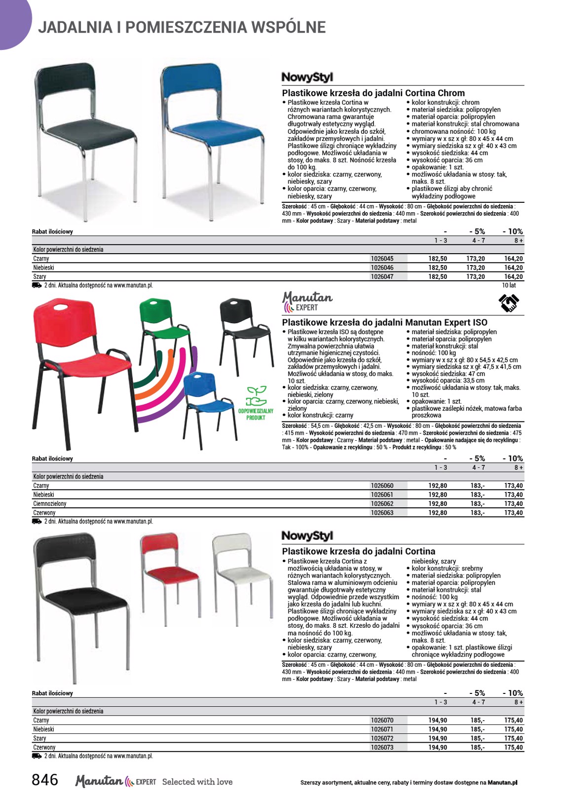JADALNIA I POMIESZCZENIA WSPÓLNE ODPOWIEDZIALNY PRODUKT tak Drewniane krzesła do jadalni • Krzesła do jadalni, których oparcie i siedzisko stanowią całość, wykonane z kombinacji profilowanych elementów ze sklejki w kolorze buku lub nowoczesne jasne i ciemne zebrano. Wysokiej jakości wykończenie powierzchni zapewnia nie tylko ochronę materiału, ale także ciekawy wygląd. Krzesła nadają się także do kuchni, sal posiedzeń i sal konferencyjnych. • kolor siedziska: buk, jasne zebrano, ciemne zebrano • kolor oparcia: buk, jasne zebrano, ciemne zebrano • kolor konstrukcji: szary RAL 9006 Lily • materiał siedziska: sklejka • materiał oparcia: sklejka • materiał konstrukcji: stal • nośność: 110 kg • wymiary wys. x szer. x gł.: 85 x 47 x 54 cm • wymiary siedziska szer. x gł.: 39 x 42 cm • wysokość siedziska: 46 cm • wysokość oparcia: 42 cm • masa: 4,6 kg • możliwość układania w stosy: tak • wyprofilowane oparcie i siedzisko krzesła ze sklejki bukowej stanowiące jedną całość o grub. 12 mm, plastikowe zaślepki nóżek Szerokość : 51 cm - Głębokość : 54 cm - Wysokość : 85 cm - Materiał podstawy : metal - Kolor podstawy : Szary Kolor powierzchni do siedzenia Buk Dzika czereśnia Wenge 2 dni. Aktualna dostępność na www.manutan.pl. 195076 195077 195078 459,- 395,10 395,10 Drewniane krzesła do jadalni • Praktyczne krzesło do jadalni ze stabilną stalową konstrukcją w czarnym kolorze. Siedzisko i oparcie krzesła drewnianego wykonano ze sklejki bukowej. Krzesło nadaje się nie tylko do jadalni, ale również do sal konferencyjnych i sal posiedzeń. Oszczędność miejsca dzięki możliwości układania w stosy nawet dziesięciu krzeseł. • kolor siedziska: buk • kolor oparcia: buk • kolor konstrukcji: czarny RAL 9005 • materiał siedziska: sklejka Sylva Black • materiał oparcia: sklejka • materiał konstrukcji: stal • nośność: 100 kg • wymiary w x sz x gł: 81 x 53 x 50 cm • wymiary siedziska sz x gł: 47 x 43 cm • wysokość siedziska: 45 cm • wysokość oparcia: 34 cm • waga: 9 kg • opakowanie: 1 szt. • możliwość układania w stosy: tak, maks. 10 szt. • powierzchnie wykończone lakierem proszkowym, plastikowe zaślepki nóżek Szerokość : 53 cm - Głębokość : 50 cm - Wysokość : 81 cm - Kolor powierzchni do siedzenia : Buk - Wysokość powierzchni do siedzenia : 450 mm - Szerokość powierzchni do siedzenia : 470 mm - Głębokość powierzchni do siedzenia : 430 mm - Wysokość oparcia : 340 mm - Materiał podstawy : metal - Kolor podstawy : Czarny - Eco-label - Europejska etykieta ekologiczna : tak Rabat ilościowy 239384 2 dni. Aktualna dostępność na www.manutan.pl. - 1 - 3 315,- - 5% 4 - 7 299,- - 10% 8 + 283,20 ODPOWIEDZIALNY PRODUKT tak Drewniane krzesła do jadalni • Praktyczne krzesło do jadalni ze stabilną stalową konstrukcją w srebrnym kolorze. Krzesło dzięki elegancko wykonanemu siedzisku i oparciu ze sklejki bukowej oraz owalnym profilom nóg nadaje się również do sal konferencyjnych i sal posiedzeń. Oszczędność miejsca dzięki możliwości układania w stosy nawet dziesięciu krzeseł. • kolor siedziska: buk • kolor oparcia: buk • kolor konstrukcji: chrom • materiał siedziska: sklejka Sylva Chrom • materiał oparcia: sklejka • materiał konstrukcji: stal chromowana • nośność: 100 kg • wymiary w x sz x gł: 81 x 53 x 50 cm • wymiary siedziska sz x gł: 47 x 43 cm • wysokość siedziska: 45 cm • wysokość oparcia: 34 cm • waga: 9 kg • opakowanie: 1 szt. • możliwość układania w stosy: tak, maks. 10 szt. • powierzchnie wykończone lakierem proszkowym, plastikowe zaślepki nóżek Szerokość : 53 cm - Głębokość : 50 cm - Wysokość : 81 cm - Kolor powierzchni do siedzenia : Buk - Wysokość powierzchni do siedzenia : 450 mm - Szerokość powierzchni do siedzenia : 470 mm - Głębokość powierzchni do siedzenia : 430 mm - Wysokość oparcia : 340 mm - Materiał podstawy : metal - Kolor podstawy : Szary - Eco-label - Europejska etykieta ekologiczna : tak Rabat ilościowy 239385 2 dni. Aktualna dostępność na www.manutan.pl. - 1 - 3 329,- - 5% 4 - 7 312,50 - 10% 8 + 296,- Krzesło konferencyjne Cafe VII • Krzesło Cafe VII jest przeznaczone m.in. • Konstrukcja stalowa o średnicy 16 x do sal konferencyjnych i obradowych. 2 mm. • Siedzisko i oparcie z ośmiowarstwowej • Całkowite wymiary całkowite krzesła to sklejki bukowej. wys. x szer. x gł.: 85,5 x 50 x 46 cm. • Całkowita szerokość płyty wynosi 10,5 • Spełnia wymagania normy EN 16139. mm. Kolor konstrukcji : Srebro - Szerokość powierzchni do siedzenia : 42,5 cm - Głębokość powierzchni do siedzenia : 39,5 cm - Wysokość powierzchni do siedzenia : 455 mm - Wysokość oparcia : 41,5 cm Kolor Wpływ na środowisko Buk A Wenge A Aktualna dostępność na www.manutan.pl. 1026233 1026234 415,- 415,- 845