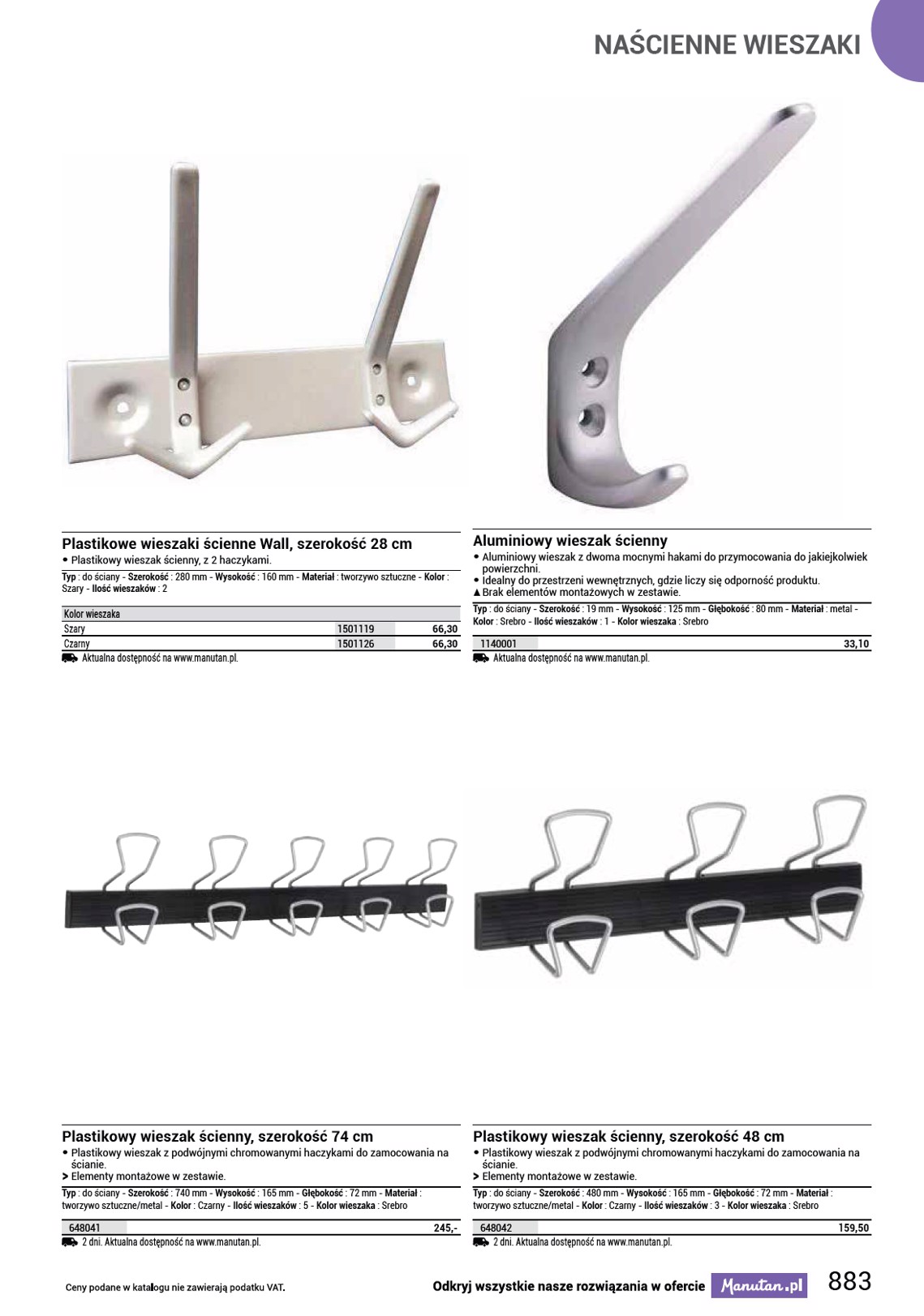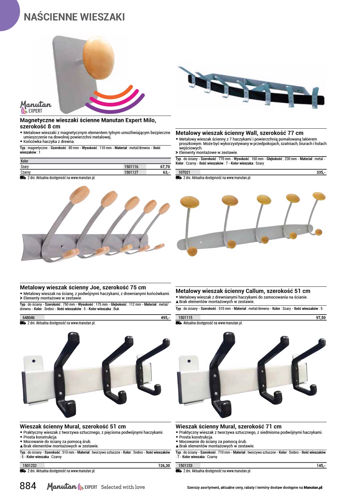 NAŚCIENNE WIESZAKI Magnetyczne wieszaki ścienne Manutan Expert Milo, szerokość 8 cm • Metalowe wieszaki z magnetycznym elementem tylnym umożliwiającym bezpieczne umieszczenie na dowolnej powierzchni metalowej. • Końcówka haczyka z drewna. Typ : magnetyczne - Szerokość : 80 mm - Wysokość : 110 mm - Materiał : metal/drewno - Ilość wieszaków : 1 Kolor Szary Czarny 2 dni. Aktualna dostępność na www.manutan.pl. 1501116 1501127 67,70 63,- Metalowy wieszak ścienny Wall, szerokość 77 cm • Metalowy wieszak ścienny z 7 haczykami i powierzchnią pomalowaną lakierem proszkowym. Może być wykorzystywany w przedpokojach, szatniach, biurach i holach wejściowych. OO Elementy montażowe w zestawie. Typ : do ściany - Szerokość : 770 mm - Wysokość : 160 mm - Głębokość : 230 mm - Materiał : metal - Kolor : Czarny - Ilość wieszaków : 7 - Kolor wieszaka : Szary 107021 2 dni. Aktualna dostępność na www.manutan.pl. 335,- Metalowy wieszak ścienny Joe, szerokość 75 cm • Metalowy wieszak na ścianę, z podwójnymi haczykami, z drewnianymi końcówkami. OO Elementy montażowe w zestawie. Typ : do ściany - Szerokość : 750 mm - Wysokość : 175 mm - Głębokość : 112 mm - Materiał : metal/ drewno - Kolor : Srebro - Ilość wieszaków : 5 - Kolor wieszaka : Buk 648046 2 dni. Aktualna dostępność na www.manutan.pl. 495,- Metalowy wieszak ścienny Callum, szerokość 51 cm • Metalowy wieszak z drewnianymi haczykami do zamocowania na ścianie. SS Brak elementów montażowych w zestawie. Typ : do ściany - Szerokość : 510 mm - Materiał : metal/drewno - Kolor : Szary - Ilość wieszaków : 5 1501115 Aktualna dostępność na www.manutan.pl. 97,50 Wieszak ścienny Mural, szerokość 51 cm • Praktyczny wieszak z tworzywa sztucznego, z pięcioma podwójnymi haczykami. • Prosta konstrukcja. • Mocowanie do ściany za pomocą śrub. SS Brak elementów montażowych w zestawie. Typ : do ściany - Szerokość : 510 mm - Materiał : tworzywo sztuczne - Kolor : Srebro - Ilość wieszaków : 5 - Kolor wieszaka : Czarny 1501232 2 dni. Aktualna dostępność na www.manutan.pl. 126,30 Wieszak ścienny Mural, szerokość 71 cm • Praktyczny wieszak z tworzywa sztucznego, z siedmioma podwójnymi haczykami. • Prosta konstrukcja. • Mocowanie do ściany za pomocą śrub. SS Brak elementów montażowych w zestawie. Typ : do ściany - Szerokość : 710 mm - Materiał : tworzywo sztuczne - Kolor : Srebro - Ilość wieszaków : 7 - Kolor wieszaka : Czarny 1501233 2 dni. Aktualna dostępność na www.manutan.pl. 145,- 884